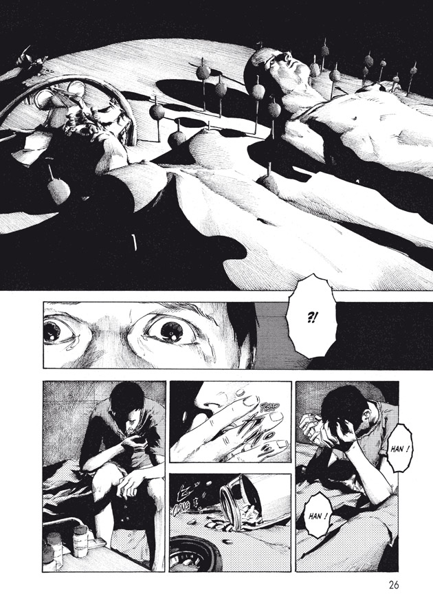 A histoire sombre, décors et dessins sombres ! Gou TANABE arrive à jouer habilement avec des noirs très profonds pour faire ressortir encore plus les visages et leur accentuer leur expressivité. De la même façon, les zones d'ombre dans les décors sont omniprésentes et contribuent naturellement à établir une ambiance pesante. Cela ne donne clairement pas envie de traîner dans le coin, et pourtant...