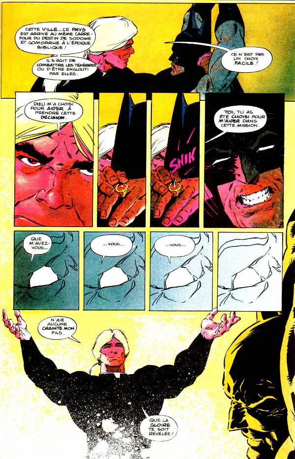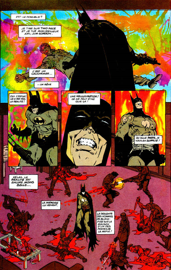 En matière de style, The Cult (oui, j’ai du mal à appeler la série « En fer blanc », moi aussi : j’ai mauvais esprit) affiche deux caractéristiques qui sautent aux yeux : la narration emprunte énormément au Dark Knight Returns de Frank Miller, recourant à l’emploi fréquent d’écrans télé pour fluidifier la narration, et à un découpage en gaufrier que viennent rompre de grandes cases crépusculaires ; et une colorisation des plus… euh… renversantes. Le travail de Bill Wray, privilégiant des éclaboussures de coloris pâteux et une palette parfois psychédélique, renforce le sujet, matérialise le malaise que ressentent Batman et la ville entière, et laisse un arrière-goût nauséeux (les couleurs ont d’ailleurs un grain qui n’est pas sans rappeler le travail de Lynn Varley sur les planches de Miller, même si la palette en est aux antipodes). Au-delà de l’aspect moche des couleurs, qui sert avec pertinence le propos (après tout, c’est l’histoire d’une ville dont les rebuts remontent des entrailles, et ça n’invite guère à la flânerie printanière…), le traitement graphique est diablement efficace : la perception de Batman est faussée, sa vue et ses autres sens sont brouillés, donc les couleurs débordent et nappent le trait en couches collantes.