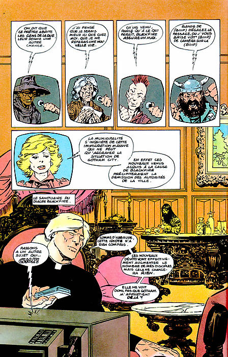 Enfer Blanc est la traduction d’une mini-série intitulée The Cult. Traduction malheureuse que ce titre VF, qui a fait ricaner les acheteurs de l’époque. Pourtant, ce n’est pas un récit en fer blanc, et l’ennemi que Batman affronte n’est pas en toc, mais en toque, ou presque. En effet, le Chevalier Noir affronte le Diacre Blackfire, un gourou religieux médiatique s’imposant comme un chef de guerre au sein d’une communauté de déclassés qui sortent de leur condition pour prendre d’assaut Gotham en entière, profitant de l’absence de son défenseur. Et pour cause, Batman est retenu contre son gré par les fidèles du Diacre, et subit un lavage de cerveau à la suite d’un régime fait de privation alimentaire et d’hallucinogène.