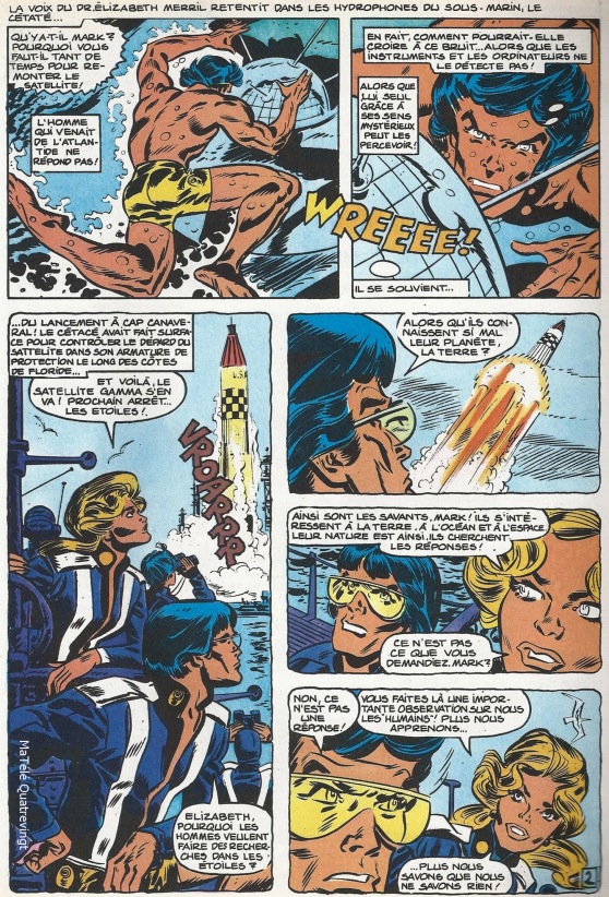 Avant de vous quitter au bord des plages océaniques, je signale également le site Plaid Stallions, qui propose à la curiosité populaire des extraits d’une adaptation anglaise de Man from Atlantis tirée de Look In, hebdo anglais contenant, comme souvent dans la BD anglaise, du matériel de premier ordre. Vaste terre inexplorée que l’Angleterre, en termes de BD.