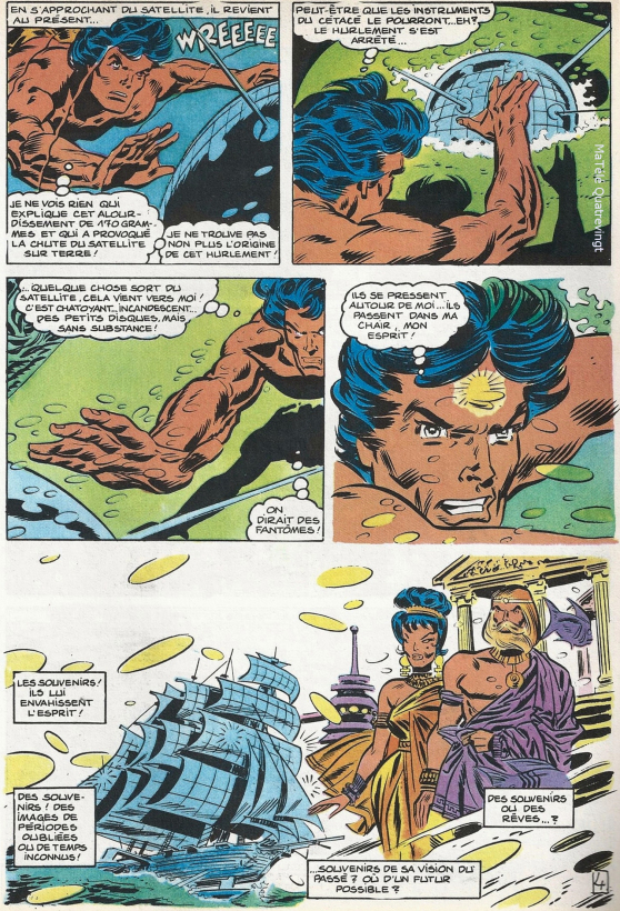 C’est Sébastien Carletti, mon co-auteur de Nos Années Strange, si je me souviens bien, qui m’a trouvé ce recueil contenant, sous une couverture inédite de Parras, trois épisodes (tronçonnés) des aventures BD de Mark Harris. J’ai donc lu ces aventures sur le tard. L’album contient les épisodes #2 à #4 de l’éphémère série Marvel, qui n’en comprendra que sept. Le site ComicsVF ne semble même pas connaître l’existence de cet album, c’est dire si, au final, l’album a été peu remarqué. Les deux premiers épisodes contiennent une énième confrontation avec Mister Schubert, vilain jamesbondien de la série, et la troisième partie raconte comment Mark Harris communique avec une espèce de spores extraterrestres à l’esprit de ruche. Les épisodes de l’époque faisaient dix-sept pages, mais la publication orchestrée par Télé Junior a procédé à quelques coupes assez violentes, même si la présentation évite la casse et que le récit ne perd guère en fluidité. La traduction cumule contresens et faux-amis, et s’impose comme un guide des choses à ne pas faire en matière d’adaptation. Mais malgré ses défauts, cette parution représente à ma connaissance la seule occasion à peu près accessible de lire en français la série Man from Atlantis.