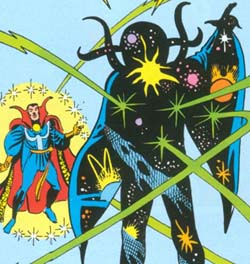 Mais pas plus que Ditko, Englehart n'est là pour écrire une thèse. La part indicible est vite renvoyée à un monstre lovecraftien, Shuma Gorath, et le côté « psychédélique friendly » est assumé par le biais d'une créature renvoyant directement à la chenille fumant le hooka sur son champignon d'Alice au Pays des Merveilles (et pour le sous-texte psychotrope d'Alice, je vous renvoie aux Jefferson Airplane et à leur White Rabbit qui vous expliquera tout ça bien mieux que je ne saurais le faire). Et la figure tutélaire de l'Ancien se don-juanifie d'autant plus qu'il se dissout dans le cosmos comme Don Juan dans le Nagual (et plus tard Obi-Wan Kenobi dans la Force) (et avant ça le Bouddha dans le Nirvana) (et après ça le chanteur de Nirvana dans son plafond, mais je m'égare).