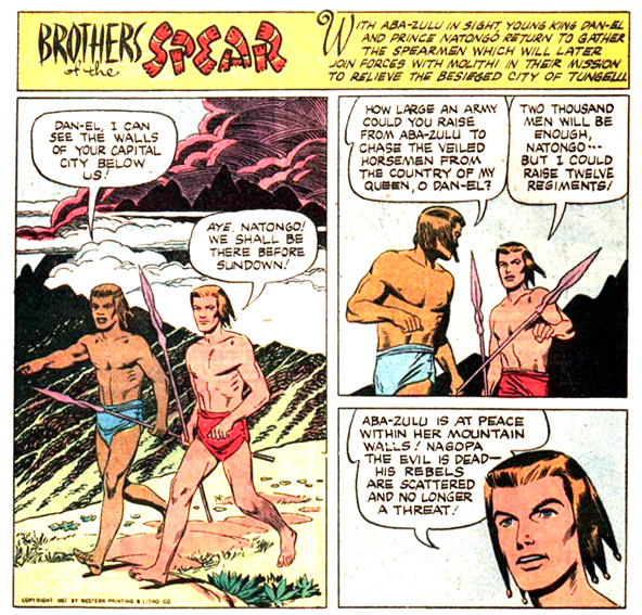 Seul maître à bord, il renoue pour l’essentiel avec un discours qu’il avait illustré au début de sa carrière, quand il travaillait sur la série Brothers of the Spear. Parue en back-up de Tarzan entre 1951 (#25) et 1966 (#161), cette série novatrice et progressiste raconte les aventures de deux jeunes guerriers africains, Natongo le noir et Dan-El le blanc, luttant côte à côte contre l’injustice. L’exploit n’est pas mince, dans l’Amérique de la ségrégation, que de présenter un héros noir sur un pied d’égalité avec son partenaire blanc.