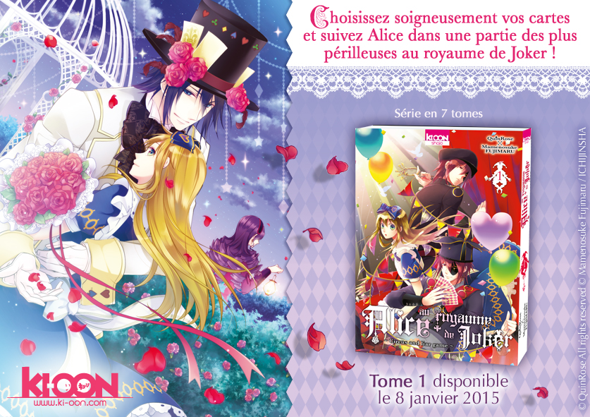 Après Alice au Royaume de Coeur et Alice au Royaume de Trèfle, Alice est de retour chez Ki-oon et va voir le Joker cette fois-ci dans Alice au royaume de Joker avec au dessin Mamenosuke FUJIMARU (Alice au Royaume de Trèfle) et au scénario toujours QUINROSE.
