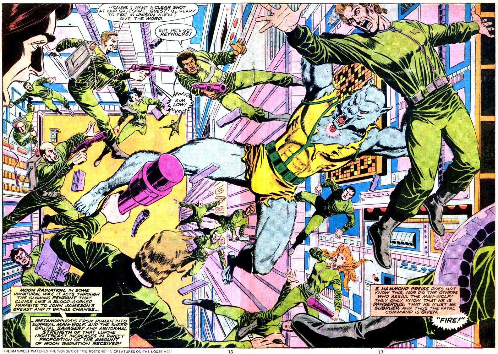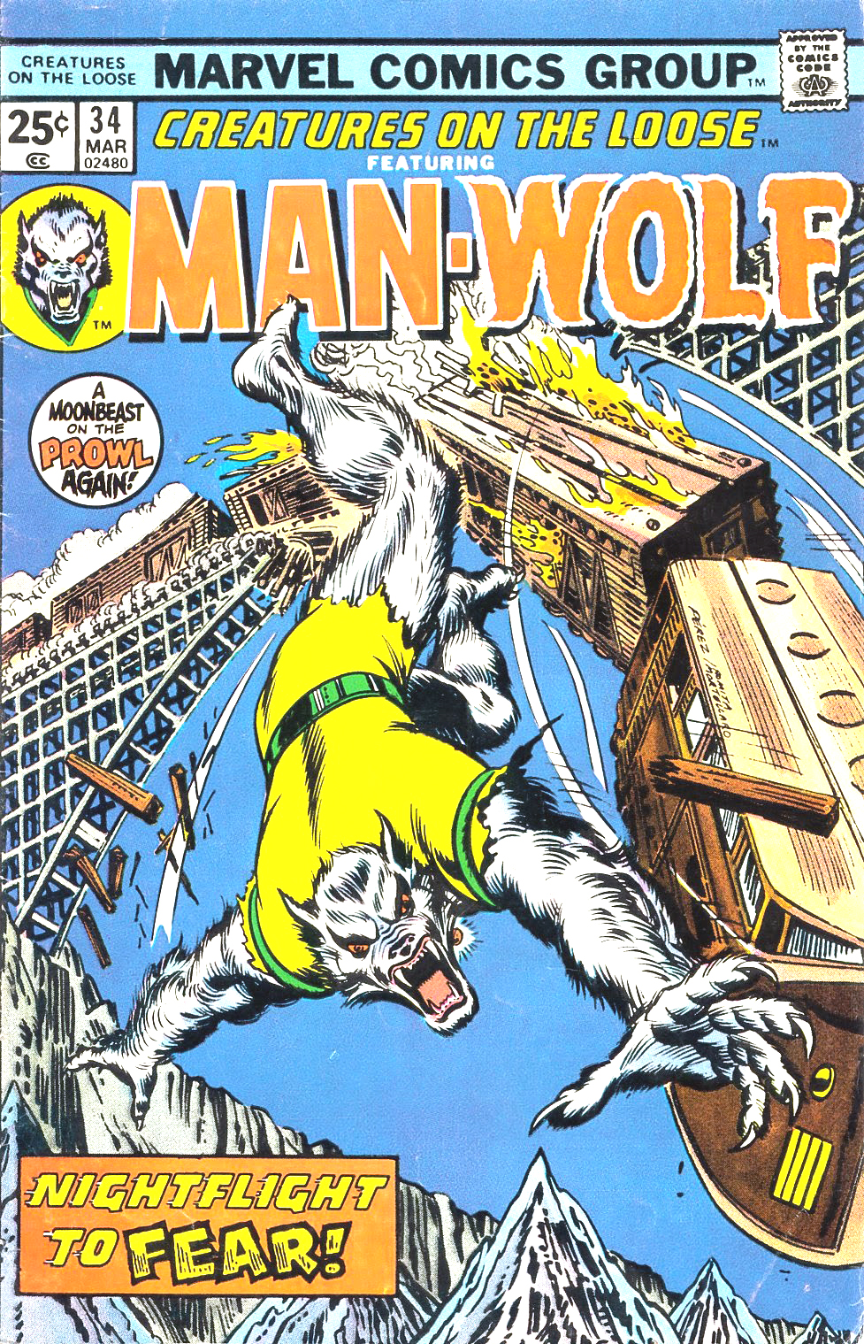 Et donc le Man-Wolf devient le héros de Creatures on the Loose. Les premiers épisodes sont rédigés par Doug Moench et Tony Isabella, qui modernisent le thème du loup-garou en plongeant l’Homme-Loup dans les canyons artificiels de la grande ville. Mais rapidement, David Anthony Kraft s’empare du feuilleton, lui donnant un ton inclassable et fou comme il le fera plus tard dans Defenders. Les premiers chapitres, se déroulant à New York, sont dessinés par George Tuska. Le tôlier de Diversion of the Grooy Kind semble ne s’intéresser qu’aux épisodes de Pérez (et pourtant, Tuska, c’est cool), puisqu’il n’entame la publication en ligne de la série qu’à partir du numéro 33. Les aventures continueront jusqu’au numéro 37, daté de septembre 1975, dernier numéro du titre. La suite ne paraîtra pas avant Marvel Premiere #45 et #46, datés de fin 1978 et début 1979.