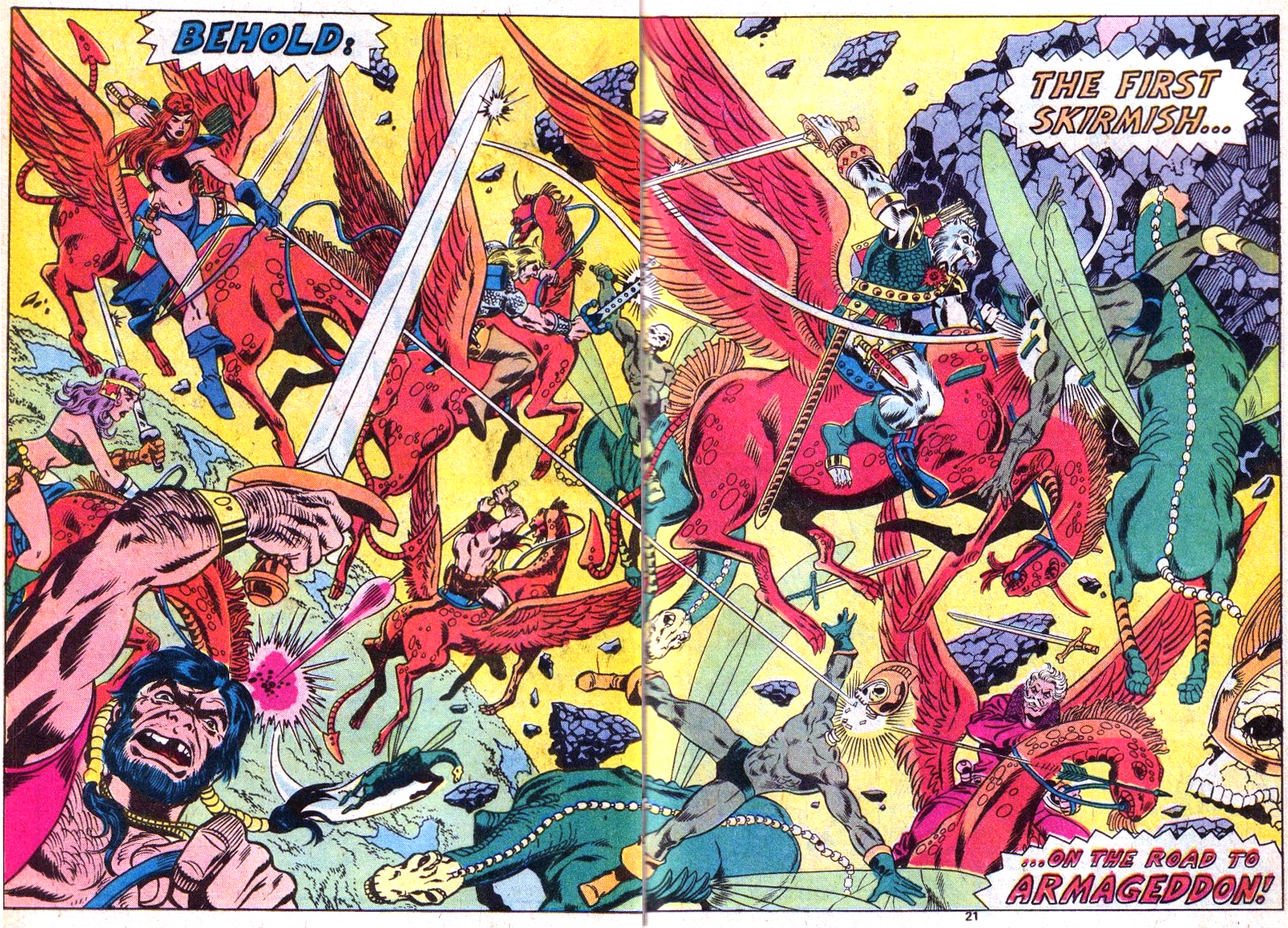 Pour ma part, la fréquentation de Diversions of the Groovy Kind m’a permis de redécouvrir la prestation de Kraft et Pérez. L’évolution de ce dernier est impressionnante. Les grands dessinateurs ont bien fait leurs armes quelque part, et il est toujours intéressant de les voir évoluer au sein d’une série régulière. Ainsi de John Byrne sur Iron Fist, ainsi de George Pérez sur Man-Wolf. Il développe une narration complexe, alternant petites cases et grandes illustrations, bandes serrées de cases étroites ornées de gros plans, bref, tout l’arsenal qui fera son style. Son dessin n’est pas encore au point dans les deux premiers épisodes, mais il prend forme, et Pérez développe rapidement les portraits de trois quarts et les décors fignolés jusqu’à l’obsession qui lui vaudront sa célébrité. Les deux derniers numéros de Creatures on the Loose sont complètement péreziens. Il signe notamment des doubles pages impressionnantes, remplies jusqu’aux marges de personnages en pleine action. Les progrès sont d’autant plus sensibles qu’il est encré par des styles différents, que ce soit Klaus Janson, Frank McLaughlin ou Fred Kida, puis Frank Giacoia et Ricardo Villamonte.