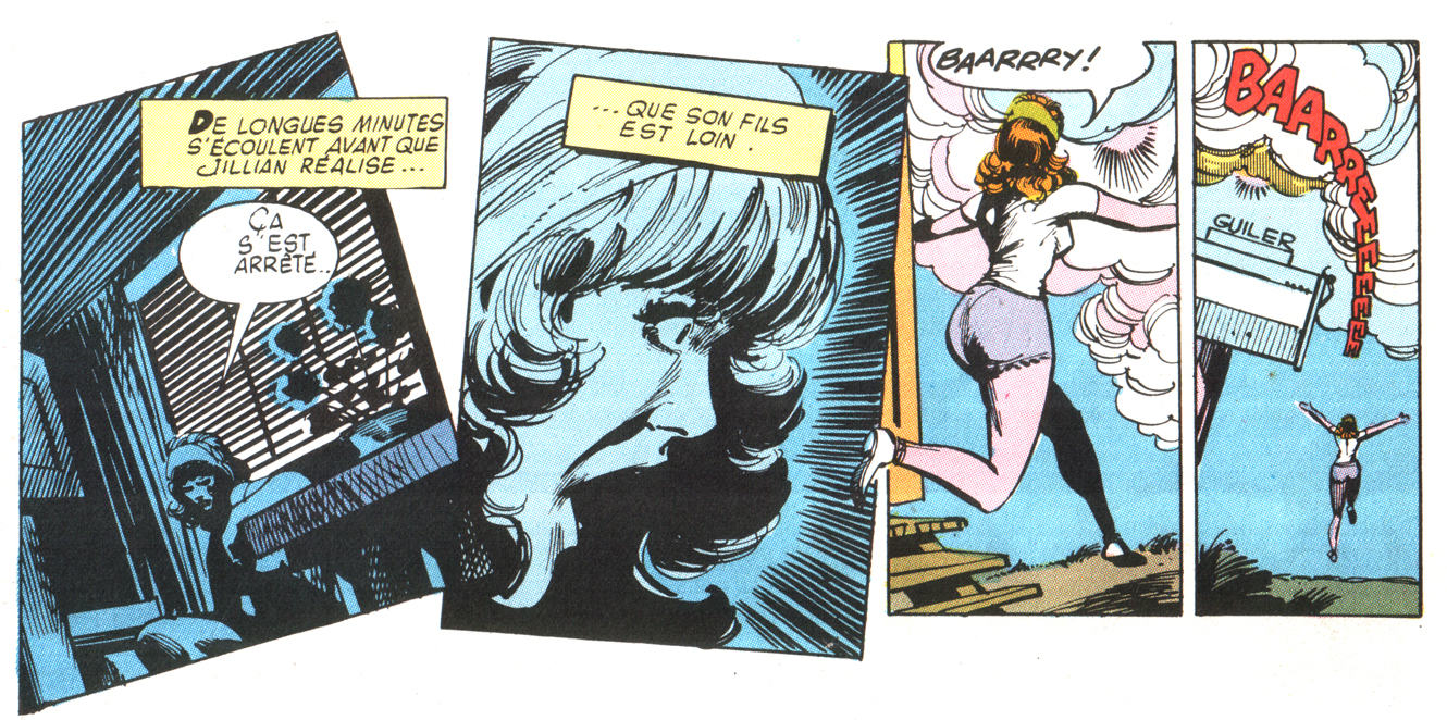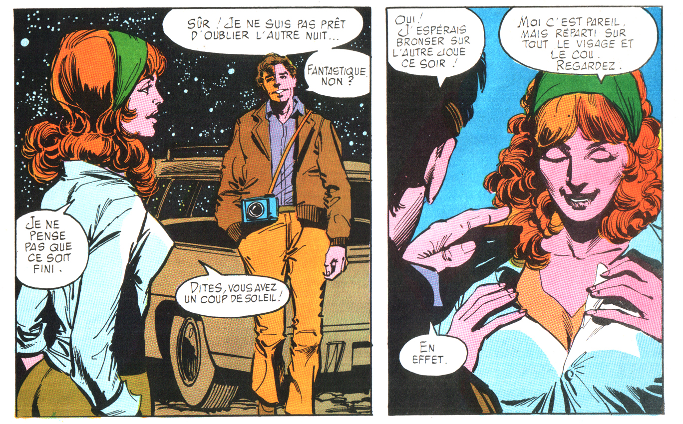 L’encrage de Klaus Janson, je le connais bien, notamment à cause de Daredevil (même avant Miller : j’adorais son encrage sur Gil Kane). Les couleurs (de Marie Severin), je les aimais beaucoup, malgré des choses étranges. Je garde en mémoire une scène où les deux héros découvrent qu’ils ont des coups de soleil, provoqués en pleine nuit par l’apparition bizarre derrière laquelle ils courent. Severin choisit étonnamment de représenter le coup de soleil… par du rose, suggérant une pâleur plus prononcée (en VF, les retouches proposées ne font qu’accentuer le phénomène). La contradiction entre les dialogues et l’image m’a laissé perplexe et sourcilleux. En revanche, certaines cases monochromes, où les teintes sont rendues par les trames utilisées par Janson, sont du plus percutant effet.