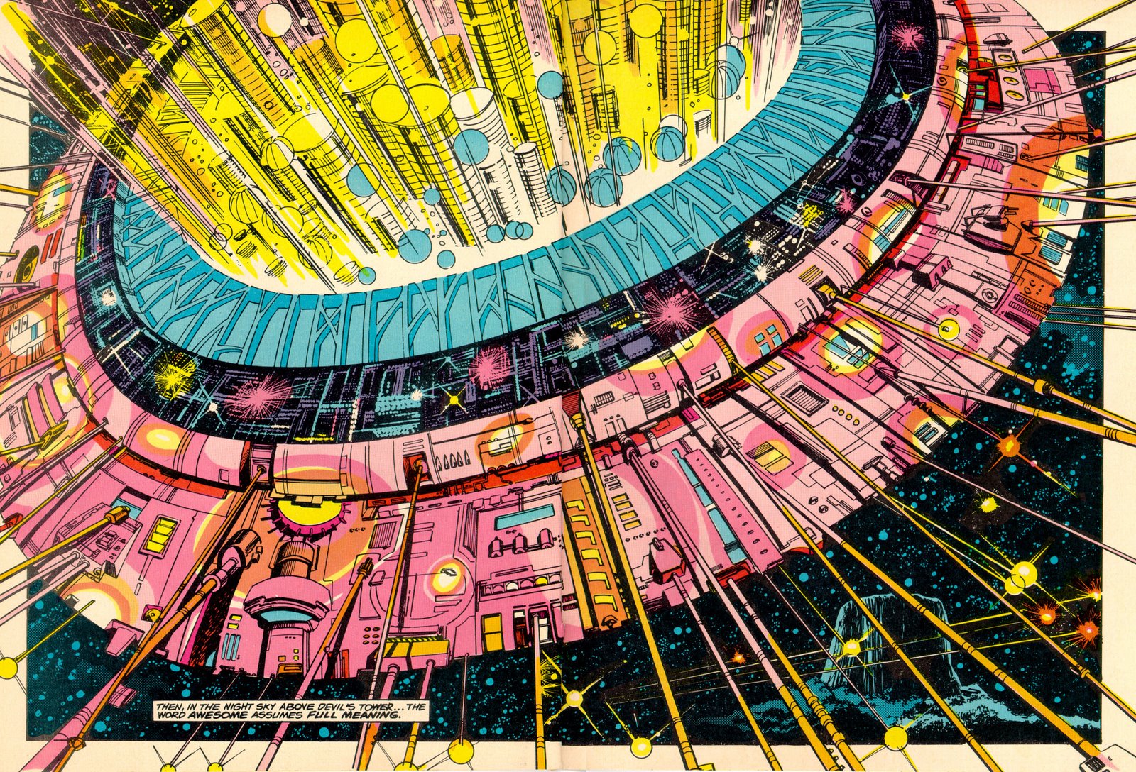 Le tour de force de l’ensemble est la double page marquant l’apparition (enfin) du vaisseau spatial extraterrestre. Baroque, géométrique, coloré, il est moins évanescent et plus technologique que celui du film (Simonson se rattrape en toute dernière page en offrant une masse d’ombre et de lumière), mais il est complètement simonsonien. Les tubulures qu’il dessine font écho aux rais de lumière, le vaisseau irradiant à la fois de couleur et de métal, confondant le solide et l’immatériel. La composition penchée, avec le vaisseau comme en déséquilibre au-dessus du mont, renforce l’étrangeté. Ses parties noires où brillent d’indéfinissables loupiotes renvoient au vide interstellaire piqué d’étoiles, en cercles concentriques vide / matière / vide / matière.