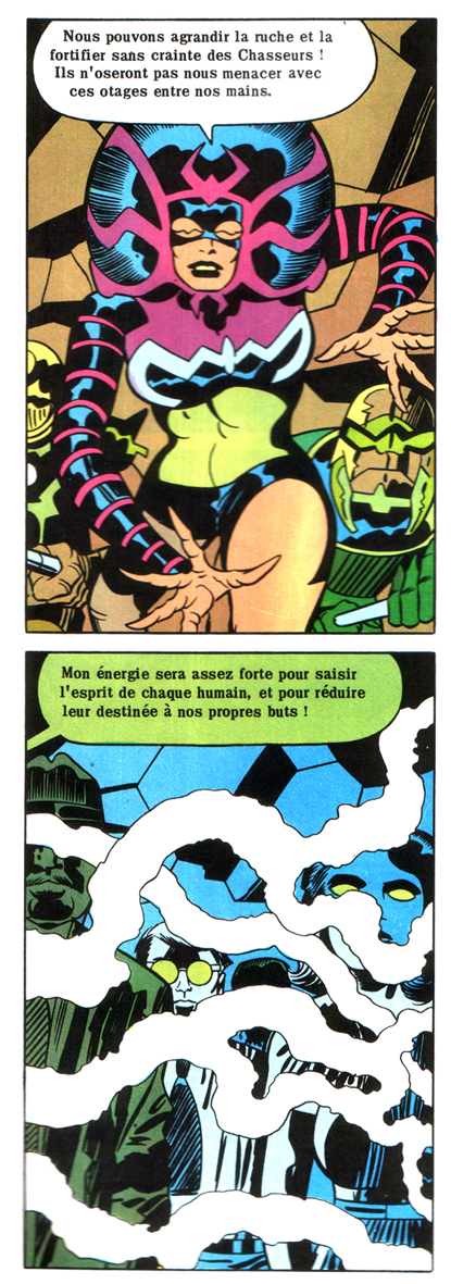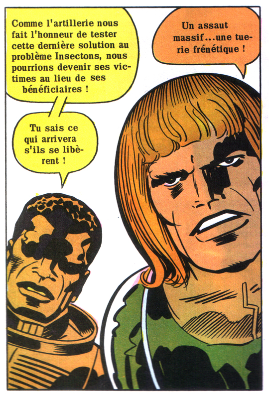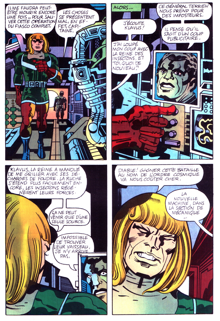 Plus étonnant encore, les deux albums présentent des planches entassant une douzaine de petites cases serrées, comme si Kirby avait plein de choses à raconter en trop peu de pages. Le processus est assez grossier et il est peu vraisemblable qu’un auteur maîtrisant à ce point la narration se soit livré à de telles retouches, les cases ayant été visiblement rétrécies. De même, il est fort à parier que ces remontages ne soient pas le fait d’Arédit, qui n’avait sans doute ni l’envie ni l’énergie de retoucher le matériel d’origine. Il reste la possibilité que Pacific Comics ait procédé à ces changements.
