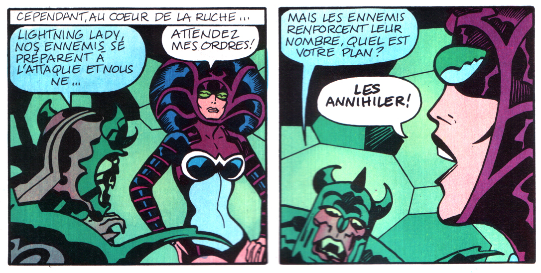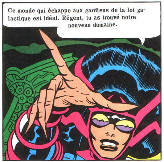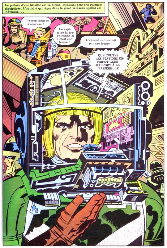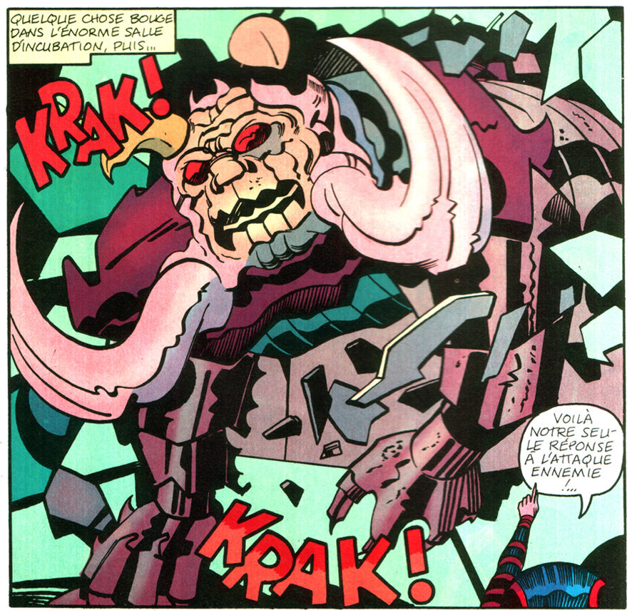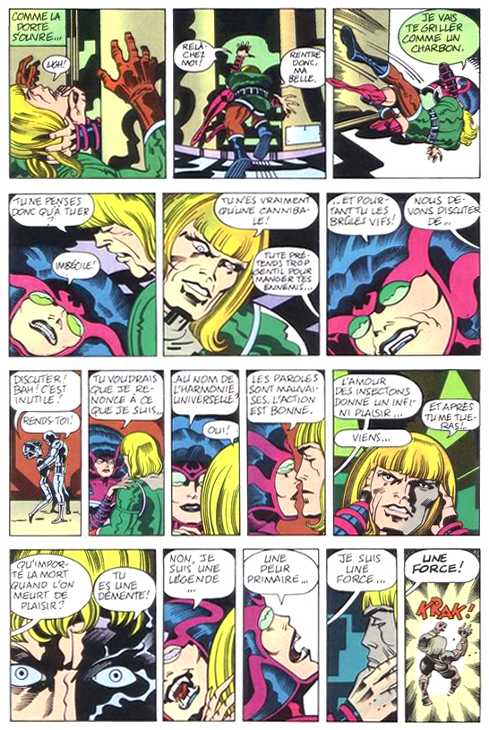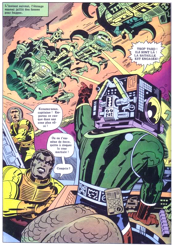 C’est cette série bouillonnante mais foutraque qu’Arédit adapte en 1983. L’accroche sur la couverture témoigne de l’enthousiasme de l’éditeur, confiant dans le nom du King, susceptible de rameuter plein de lecteurs. Hélas, l’expérience ne durera que deux albums géants, et seulement quatre épisodes sur la douzaine publiée en Amérique trouveront leur chemin jusqu’en France. Le format agrandi sert assez bien le trait du King. La traduction du premier tome, lettré hélas à la machine, est assez fidèle. Le deuxième numéro est lettré à la main dans une calligraphie large et ondulée, pas réellement désagréable à l’œil mais peu adaptée aux pages de bande dessinée. Et l’histoire se termine, comme le souligne Zaitchick qui a déjà consacré quelques papiers à la série sur le net, au début de la bataille, donc en plein suspense.