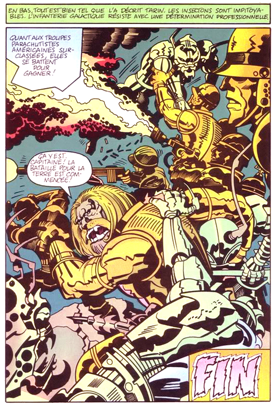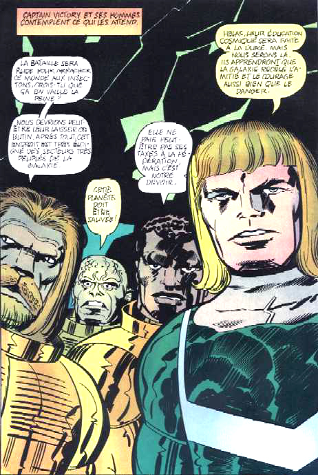 Néanmoins, la consultation de la « Graphite Edition », dont les textes d’accompagnement sont très éclairants, nous apprend que Captain Victory est un amas de nombreuses idées de Kirby (les Insectons rappellent un peu la menace des Autochrons dans Machine Man, les hommes de Victory évoquent ici Triton des Inhumans ou là les hommes-animaux du High Evolutionary…), mais également un collage de séquences réalisés à quelques mois d’intervalles, puis retouchés par l’éditeur. La longue tradition de massacre des œuvres du King se perpétue (jusqu’à son petit-fils, qui ne manque visiblement pas d’aplomb), et peut expliquer que Captain Victory, aux yeux du lecteur français de 1983, ait paru comme une œuvre mal maîtrisée d’un auteur apparemment sur le déclin. Hélas.