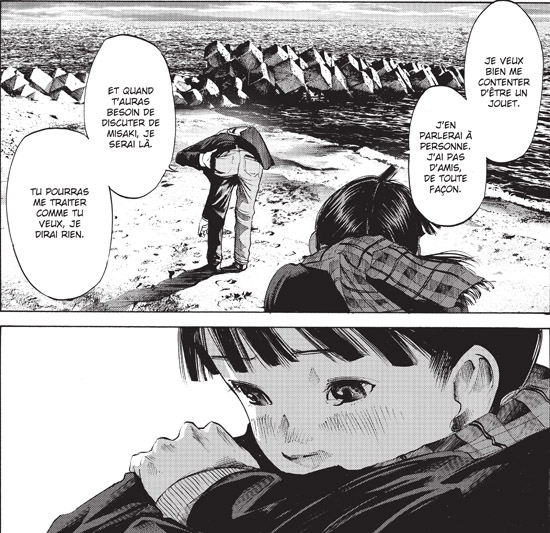 Graphiquement, c'est juste superbe. Tant au niveau des décors que des personnages. C'est fin, c'est expressif, retranscrivant parfaitement le peu de tendresse non-dite qu'il y a entre ces deux-là, l'ennui, le désespoir, les éléments déchâinés. On regrettera juste que, pour des adolescents censés avoir un physique banal (et l'auteur insiste lourdement là-dessus à plusieurs reprises), Koume et Isobe aient été représentés plutôt beaux l'un comme l'autre...
