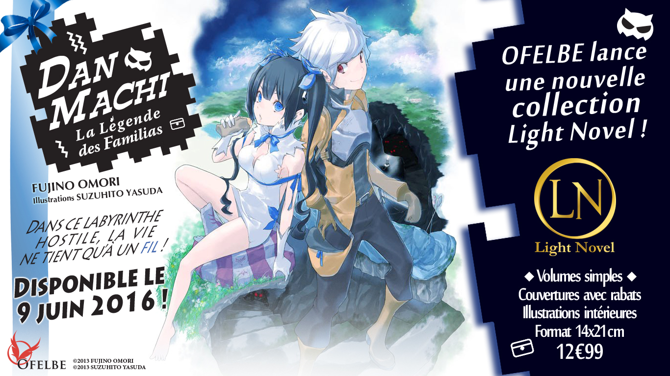 Les éditions Ofelbe ont annoncé la sortie du premier tome du light novel DanMachi – La légende des Familias (Dungeon ni Deai o Motomeru no wa Machigatte Iru Darou ka) pour le 9 juin 2016.
