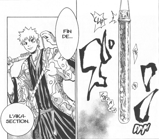 Au travers des différentes missions confiées à nos deux héros, nous allons découvrir la variété des Akatsuki. En effet, ils peuvent prendre des formes diverses et variées, de quoi laisser libre cours à l'imagination de l'auteur. Celui-ci nous explique d'ailleurs dans des pages bonus comment lui est venue l'idée du design de tel ou tel Akatsuki. C'est vraiment le point fort du manga à mon sens. Du coup les combats sont variés même s'ils sont un peu confus parfois. Par contre, pour rester sur les dessins, on sent que le trait de l'auteur n'est pas toujours très sûr, notamment sur les visages.