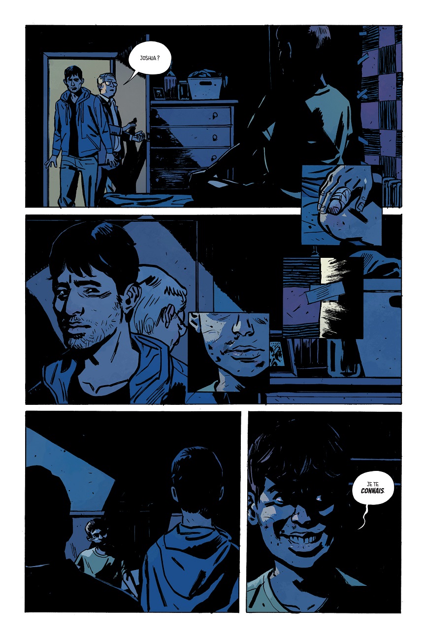 Donc, j’essaie toujours de filtrer la narration visuelle à travers la sensation des personnages. Kyle est vraiment tendu tout le temps. J’essaie de garder ça en tête lorsque je conçois les plans où il apparait en utilisant sa perspective. J’espère que ça se traduit [à la lecture], comme vous semblez le dire.