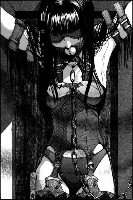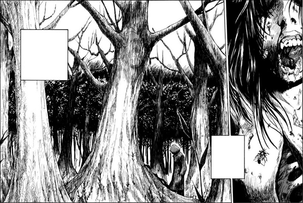Visuellement, si le manga n'a rien d'extraordinaire la majorité du temps, sans être laid pour autant, Ôiwa Kendi connaît son métier et maîtrise à la perfection la mise en scène, sublimant ainsi l'histoire. Pour commencer, sa gestion du cadrage et des angles de vue est remarquable. Plongée, contre-plongée, placement des onomatopées, rien n'est laissé au hasard. Ensuite, il nous offre de temps à autre des planches plus travaillées et sublimement glauques, à la hauteur des psychopathes mis en scène. A ne pas mettre entre les mains les plus sensibles, donc. Le mangaka fait enfin une utilisation judicieuse du décor dans le troisième chapitre, noyant les pages de feuilles d'érable virevoltantes, débordant des cases comme une parodie automnale des fleurs envahissant les shojo, accompagnant la descente aux enfers de l'un des personnages.