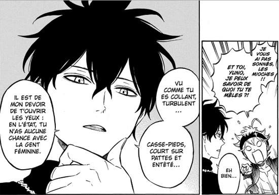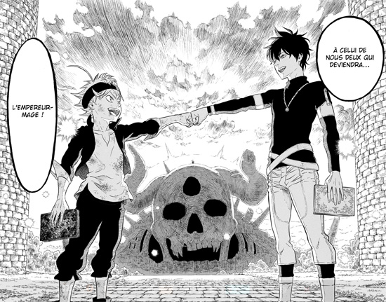 Si le jeune lecteur, qui découvrira les mangas par ce titre, ne trouvera sans doute pas grand-chose à reprocher à l’ensemble, le lecteur avec un peu plus de bouteille fera très rapidement le rapprochement avec deux prédécesseurs de Black Clover dans le Shonen Jump, Naruto et One Piece. Asta, notre héros, ressemble fortement à Naruto, notamment pour ce qui est de son caractère, et Yuno, son meilleur ami et compagnon d’orphelinat, rappellera, par exemple, Sasuke. Quant à l’incontournable « équipe » qui prendra place autour d’Asta, on sent quelques inspirations prises sur l’œuvre d’Eiichiro Oda, notamment dans le caractère farfelu et loufoque de certains rôles secondaires. En somme, une impression de déjà-vu, qui peut rebuter certes, mais qui n’est finalement pas si désagréable puisque l’auteur le fait avec un certain talent.