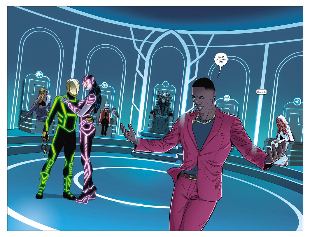 Lorsque les pages parviennent à Matt [Wilson], il se passe exactement la même chose. Je ne donne pas beaucoup de consignes, sauf lorsqu'il s'agit des couleurs vestimentaires ou lorsque je recherche un effet spécifique... Mais Matt fait partie intégrante de la conception. Il amène une tonne d'idées. Tu veux en parler ?