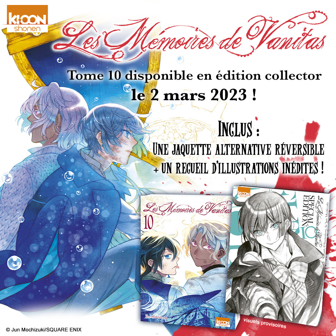 Après avoir proposé une édition collector pour le tome 5, Ki-oon va sortir le 2 mars prochain une édition collector pour le tome 10 de Les Mémoires de Vanitas de Jun Mochizuki. Cette édition contiendra bien entendu le tome 10 de la série, une jaquette alternative réversible ainsi qu'un livret d'illustrations inédites. De quoi profiter plus encore du magnifique dessin de l'autrice, et ce, pour un prix de 11,30€.