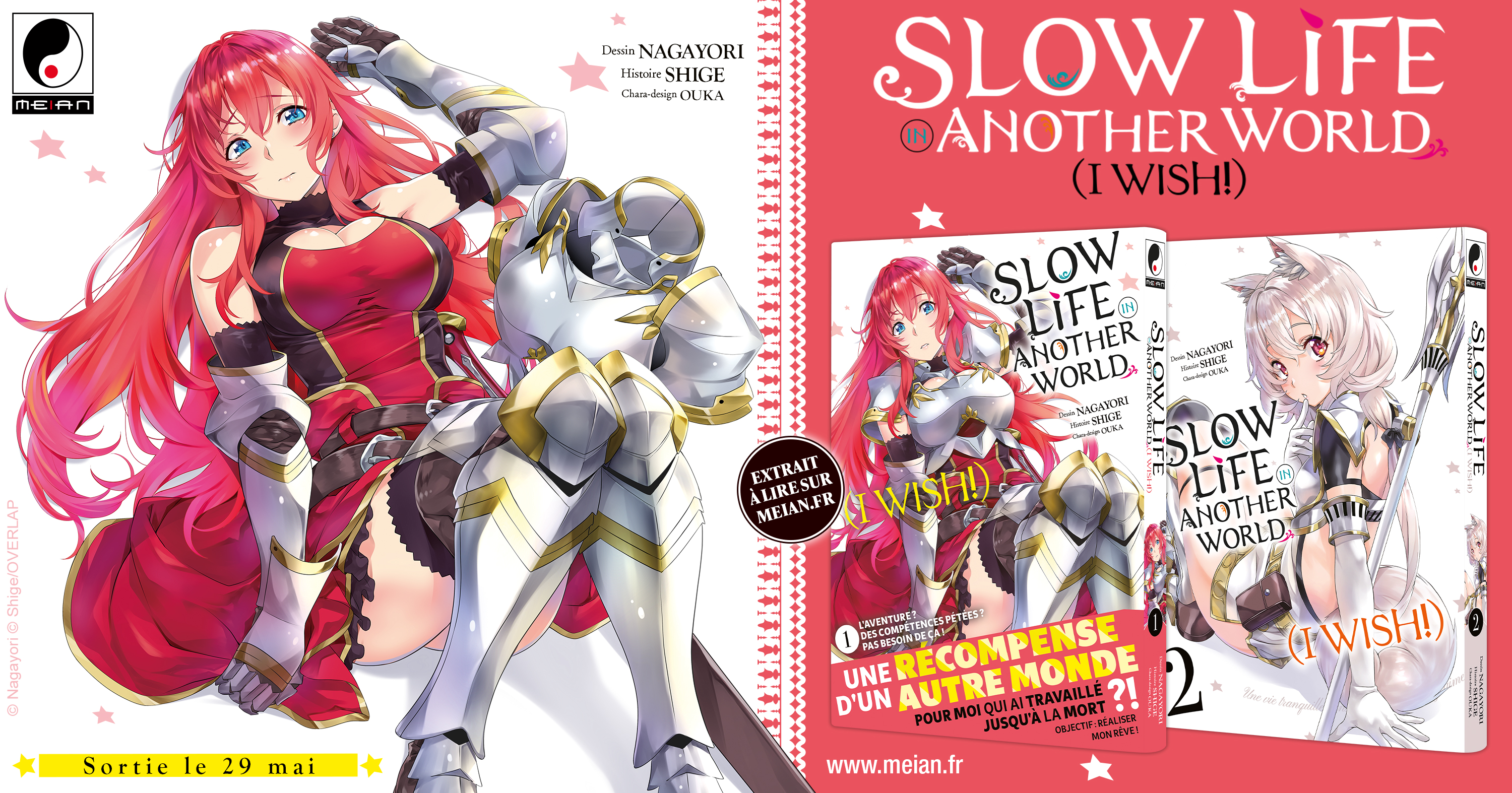 Avec 5 tomes parus au Japon à l'heure actuelle, la série Slow Life in Another World (I Wish!) va paraître dès le mois de mai aux éditions Meian. Nouvel isekai où l'aventure et l'action ne manqueront pas, il est signé de la patte graphique de NAGAYORI et d'une histoire de SHIGE.