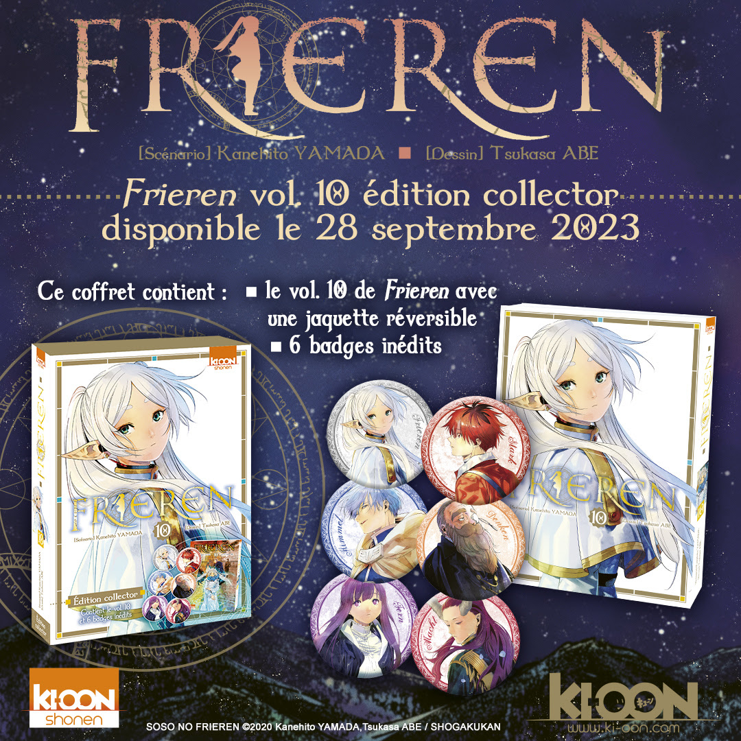 Alors que son adaptation animée approche à grands pas, le manga Frieren de Kanehito YAMADA et Tsukasa ABE va bénéficiera d'une nouvelle édition collector pour son tome 10 qui sortira en septembre prochain aux éditions Ki-oon. Le contenu de cette édition est le suivant : le tome 10 avec une jaquette réversible et un set de 6 badges, le tout pour un tarif de 11,90€.
