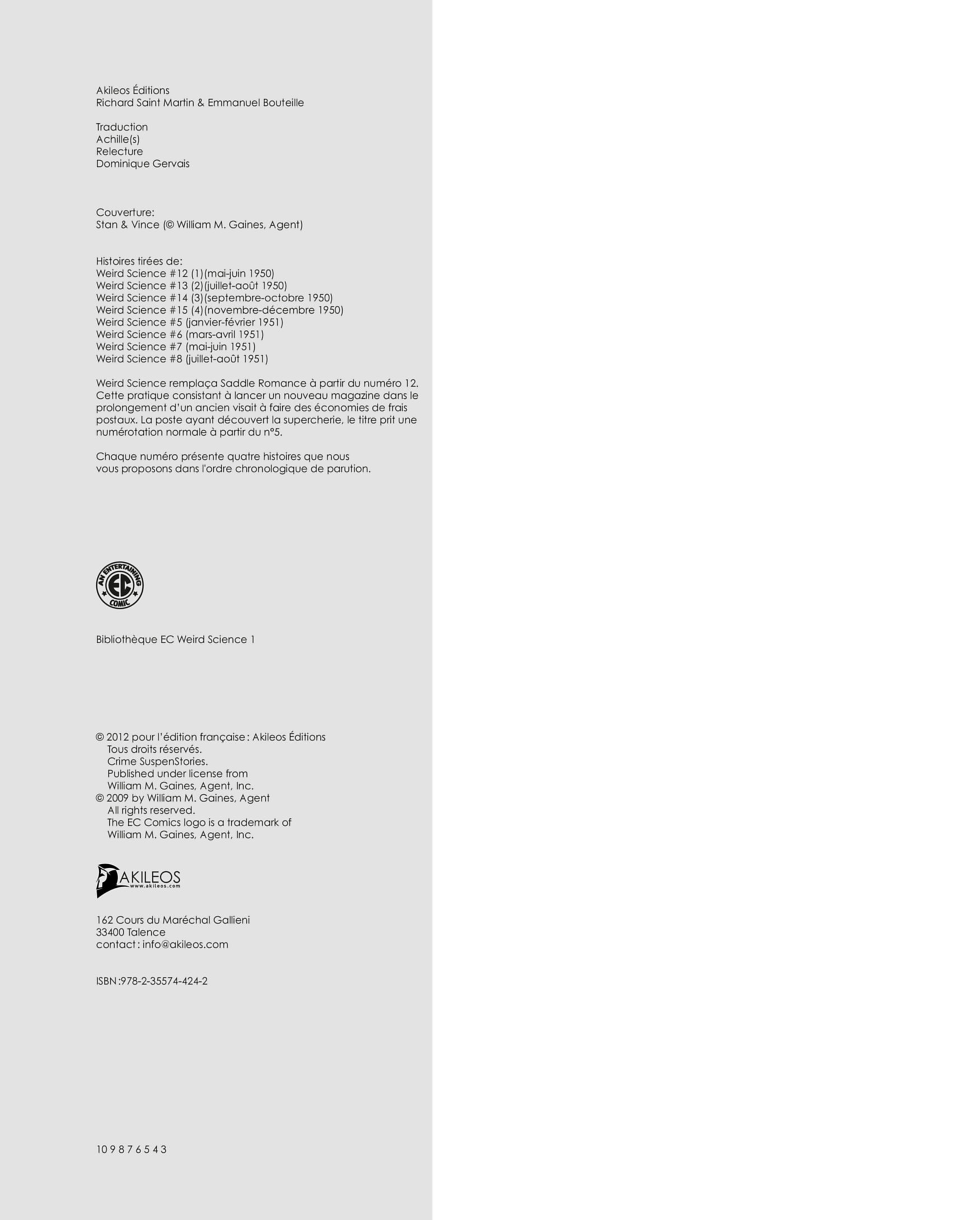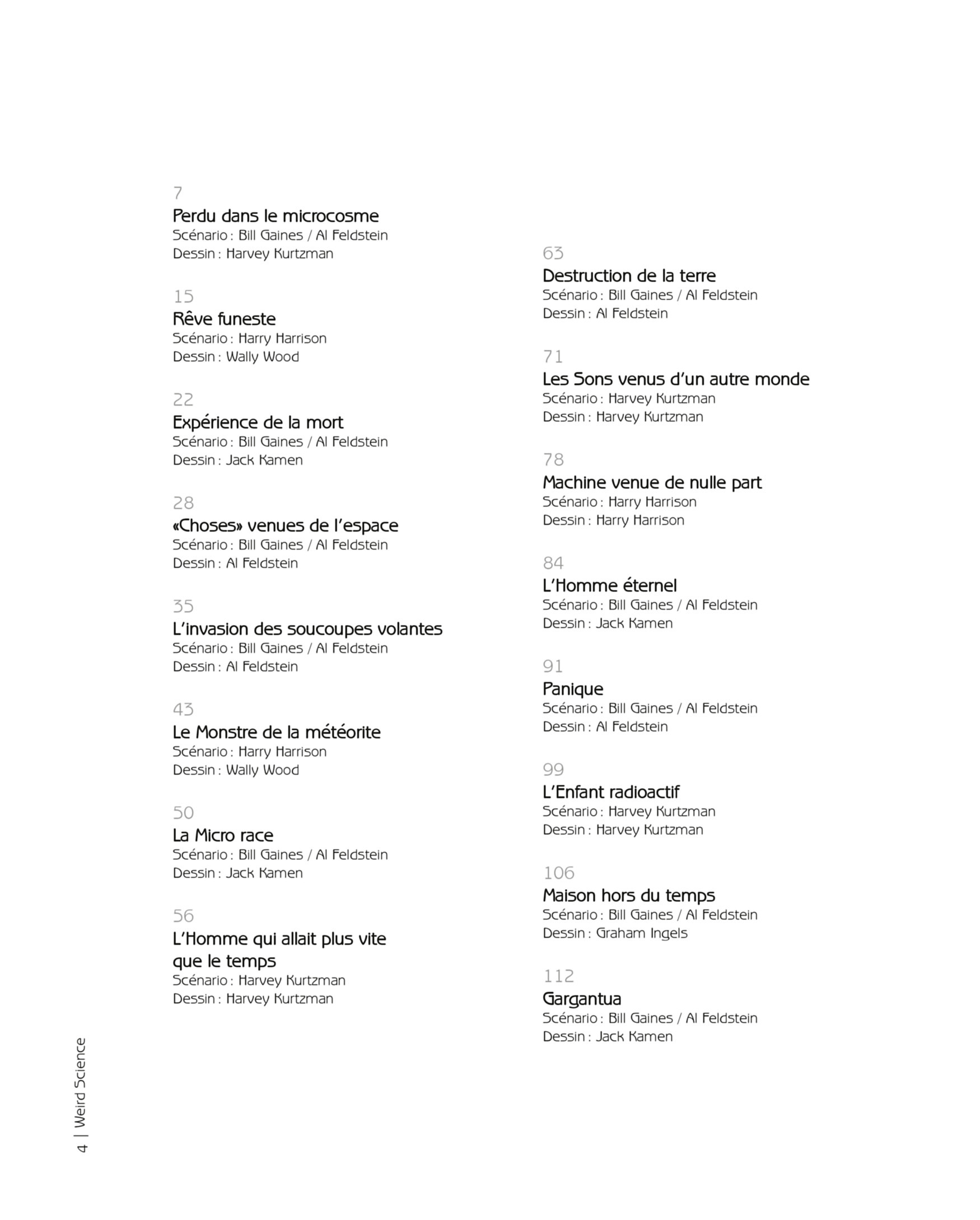 Anthologie de récits de science-fiction, Weird Science était un bimensuel publié par EC Comics, le label indépendant américain de William Gaines, de 1950 à 1953. Durant cette glorieuse période, vingt-deux numéros ont été publiés, soit 80 histoires, auxquels ont participé des auteurs aux talents immenses comme Harvey Kurtzman, Wally Wood, Jack Kamen, Al Williamson, Joe Orlando, Frank Frazetta... Des récits qui ont marqué toute une génération et influencé de nombreux artistes américains et européens au fil des décennies