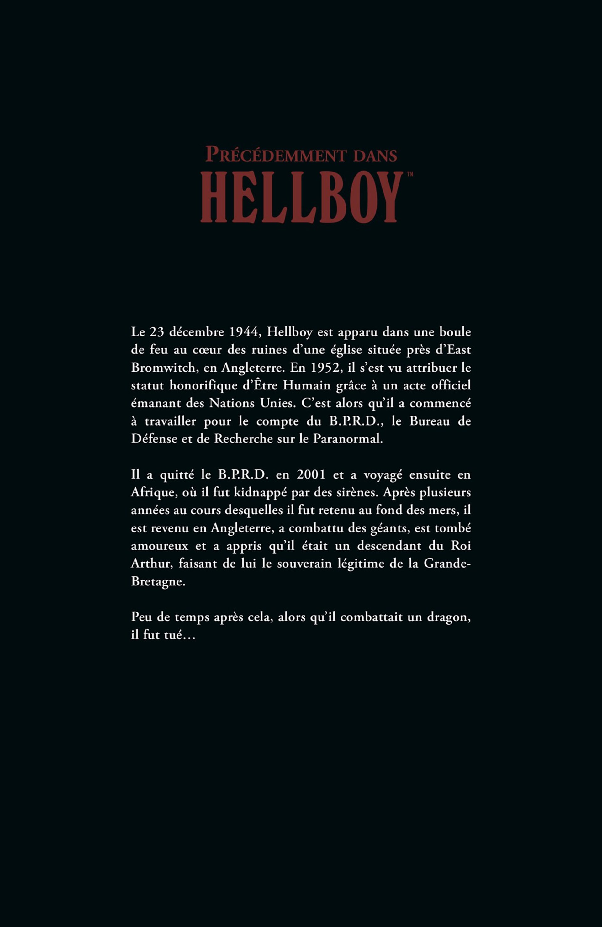 Après avoir sauvé l'Humanité, au sacrifice de la Grande- Bretagne et au péril de sa vie, Hellboy est mort. Condamné à rester en Enfer, il retrouve un certain nombre de visages connus, des âmes damnées, des fantômes du passé, et un trône qui n'attend que lui. Mais Hellboy est-il prêt à monter sur celui-ci pour régner sur les enfers ? Un voyage infernale assuré par le maestro Mike Mignola.