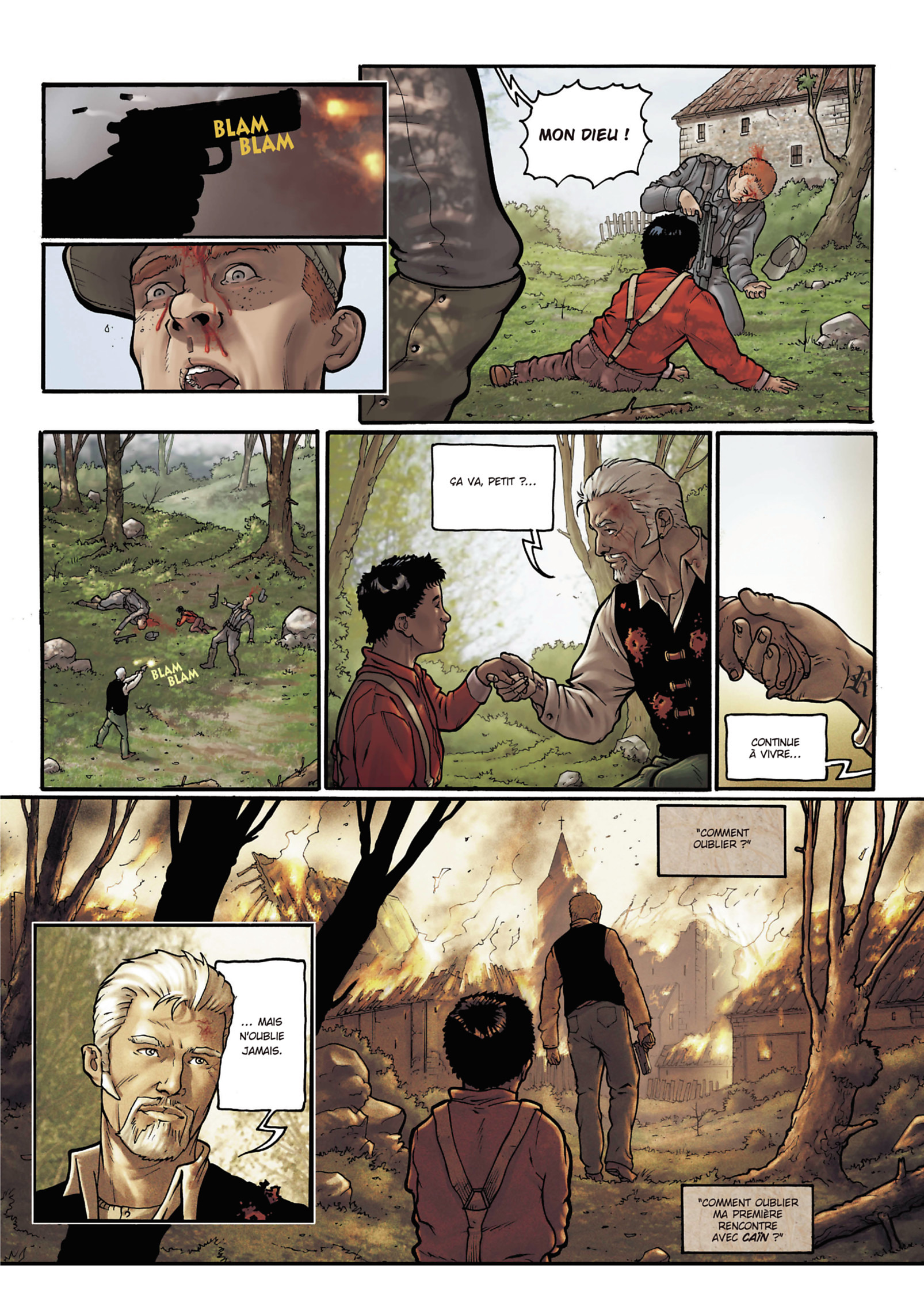 Juin 1944, France. Le retrait des troupes allemandes laisse présager la fin de l’occupation. Pourtant, un détachement de la division SS “ Das Reich” encercle le village d’Oradour, et massacre tous ses habitants. Tous sauf Victor Granger, un jeune garçon d’à peine six ans, sauvé par l’intervention miraculeuse d’un mystérieux inconnu insensible aux balles des SS… Cinquante ans ont passé. Victor, devenu théologien, s’intéresse à l’un des mythes fondateurs de la civilisation chrétienne. Et si l’homme dont il a croisé le chemin à Oradour, et qui traverse les âges sans altération, n’était autre que Caïn, frère et meurtrier d’Abel, condamné à l’éternité par Dieu ?…