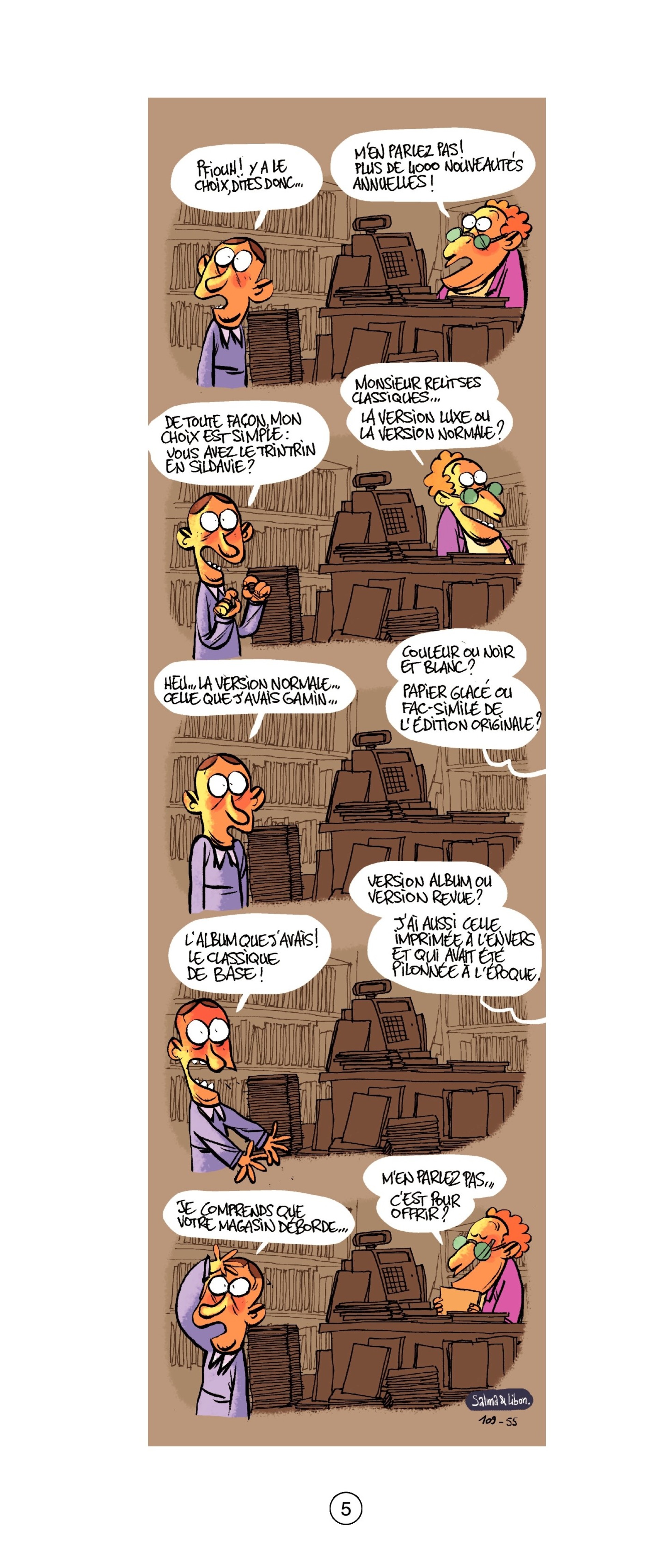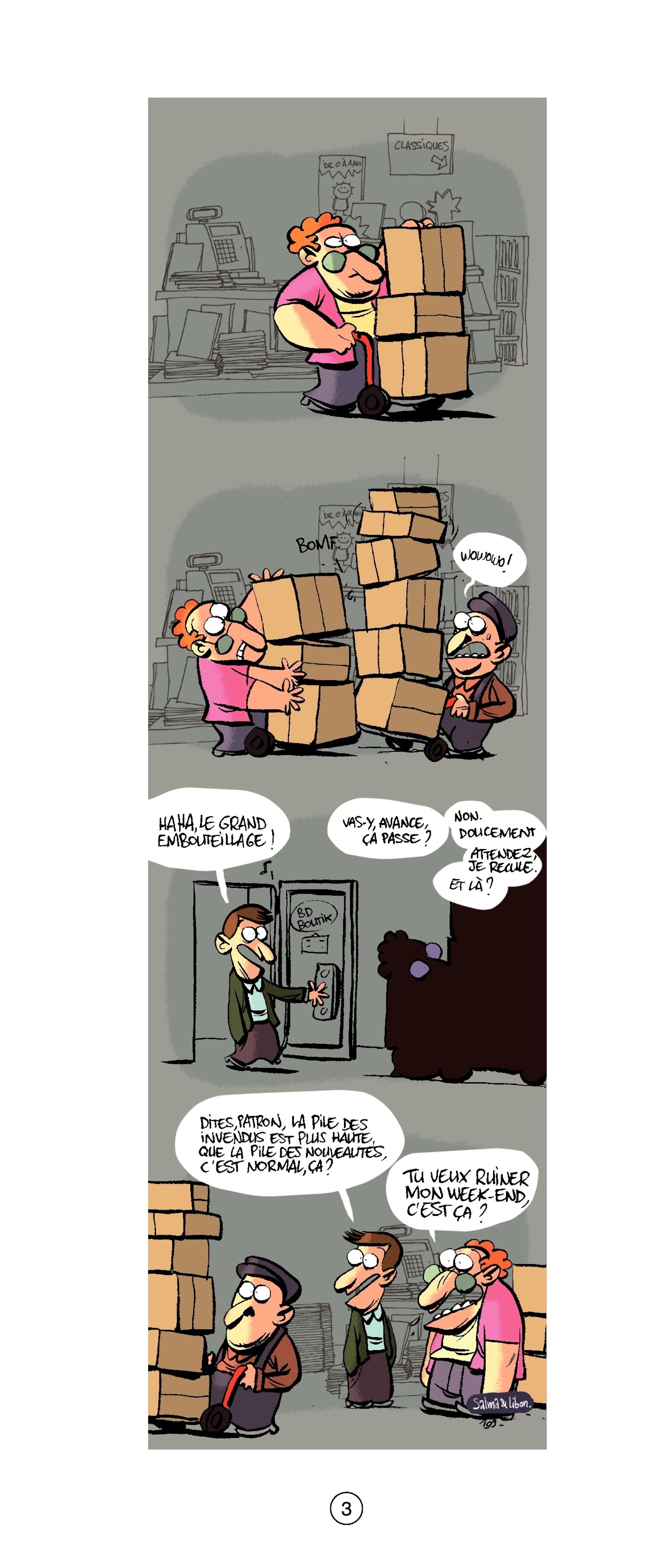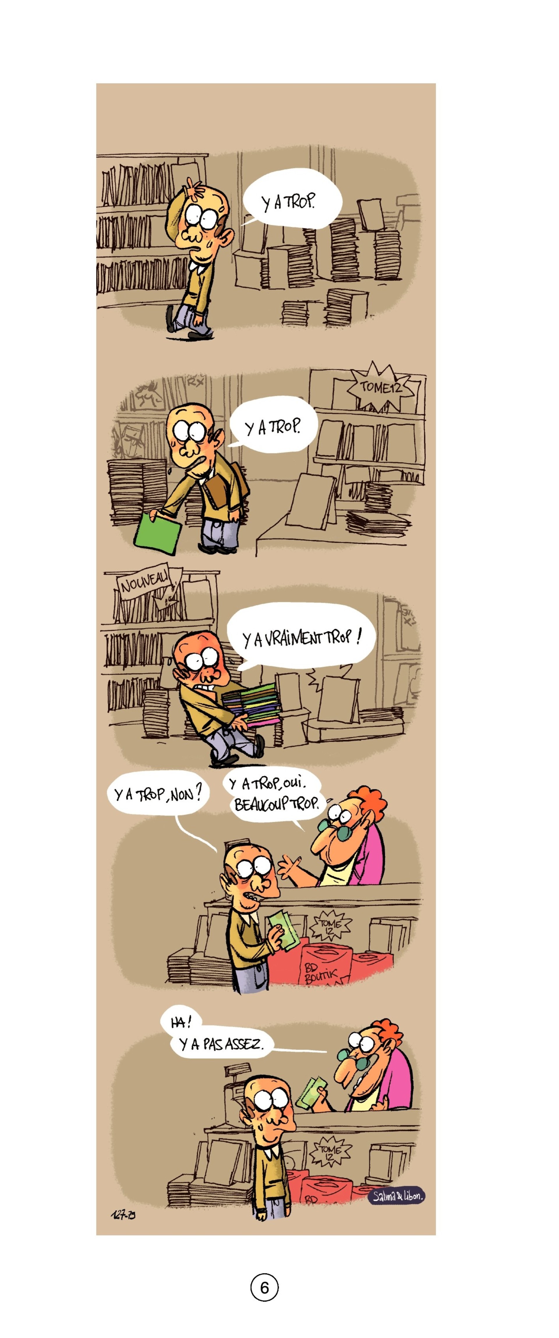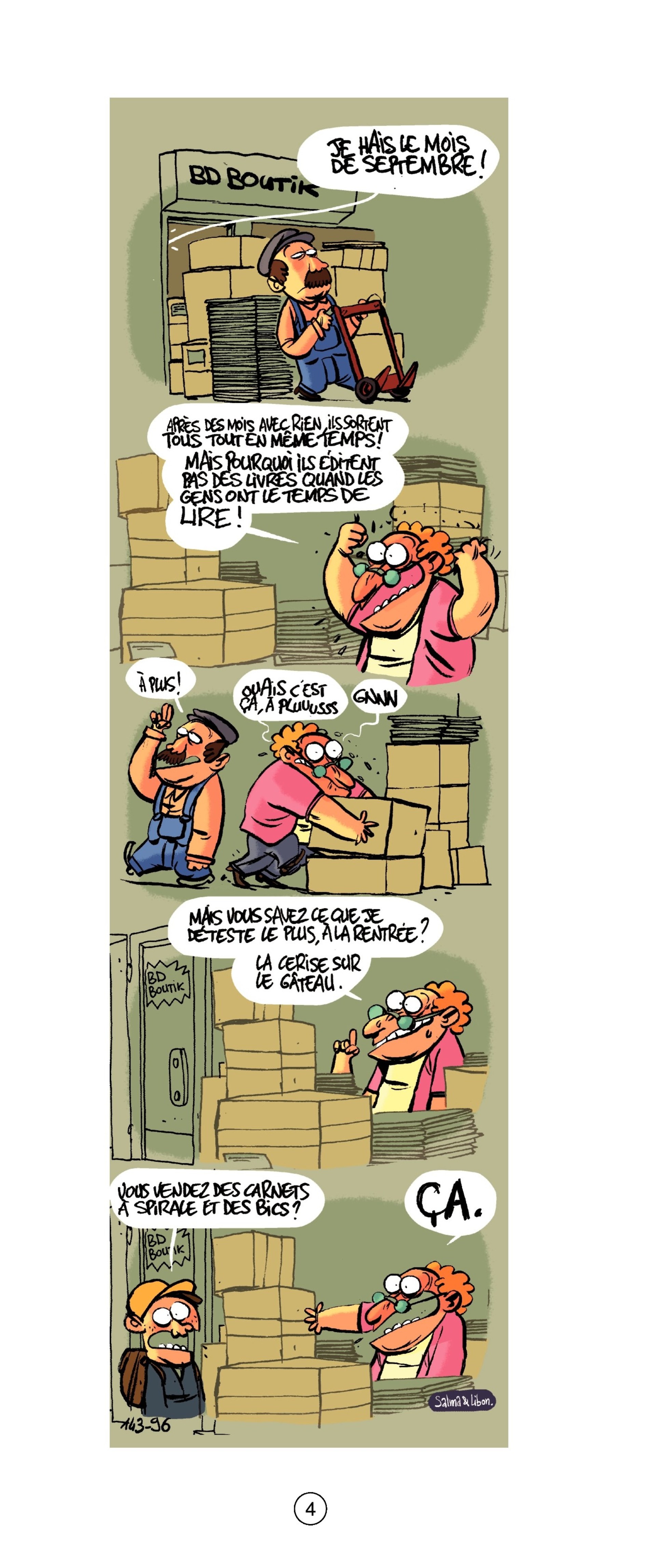 Format sympathique pour ce tome 6, en demi-A4 vertical. Faut-il le rappeler, la série raconte les tracas quotidiens d’une librairie spécialisée BD. Entre le nombre exorbitant de sorties qui ne permettent ni de les lire toutes, pour pouvoir les conseiller, ni même de les stocker dans le magasin, le planning incompréhensible avec un néant en été quand les gens ont le temps de lire et un pic en sep...