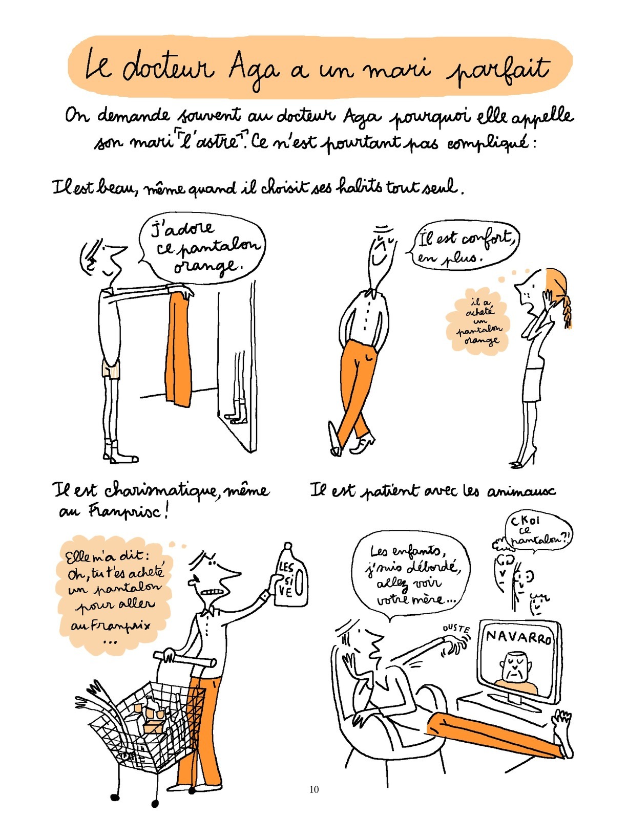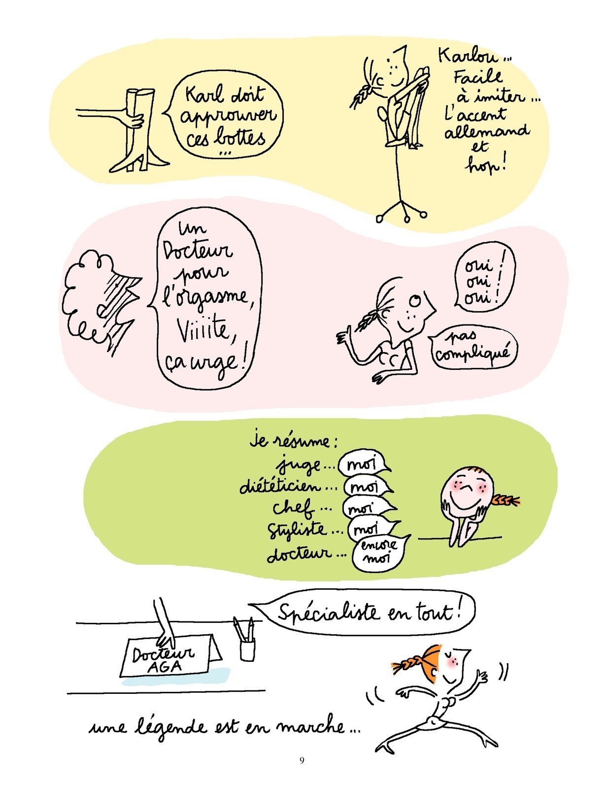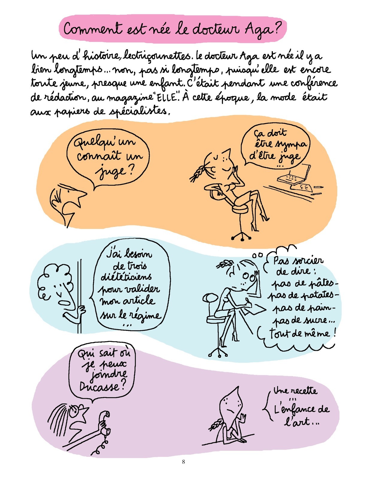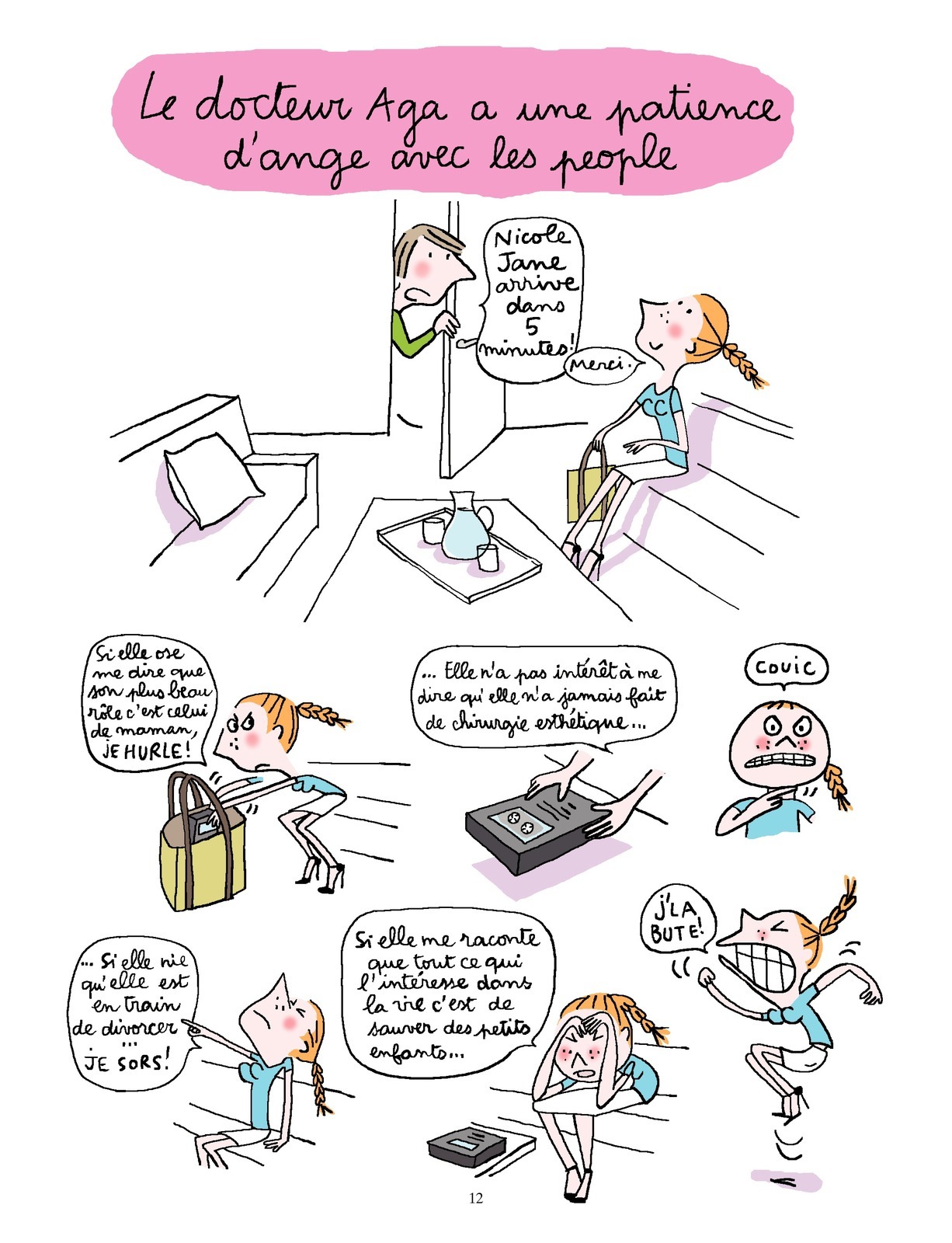 Après avoir solidement établi sa réputation dans la presse, le Docteur Aga devient un personnage de bande dessinée. Ensemble,Soledad et Alix Girod de l’Ain la suivent au jour le jour et avec humour dans sa vie quotidienne, sous la forme de courtes histoires en deux planches. Une manière de chronique souriante de l’air du temps, qui, l’air de rien, nous en dit bien plus long que tous les manuels de savoir-être.