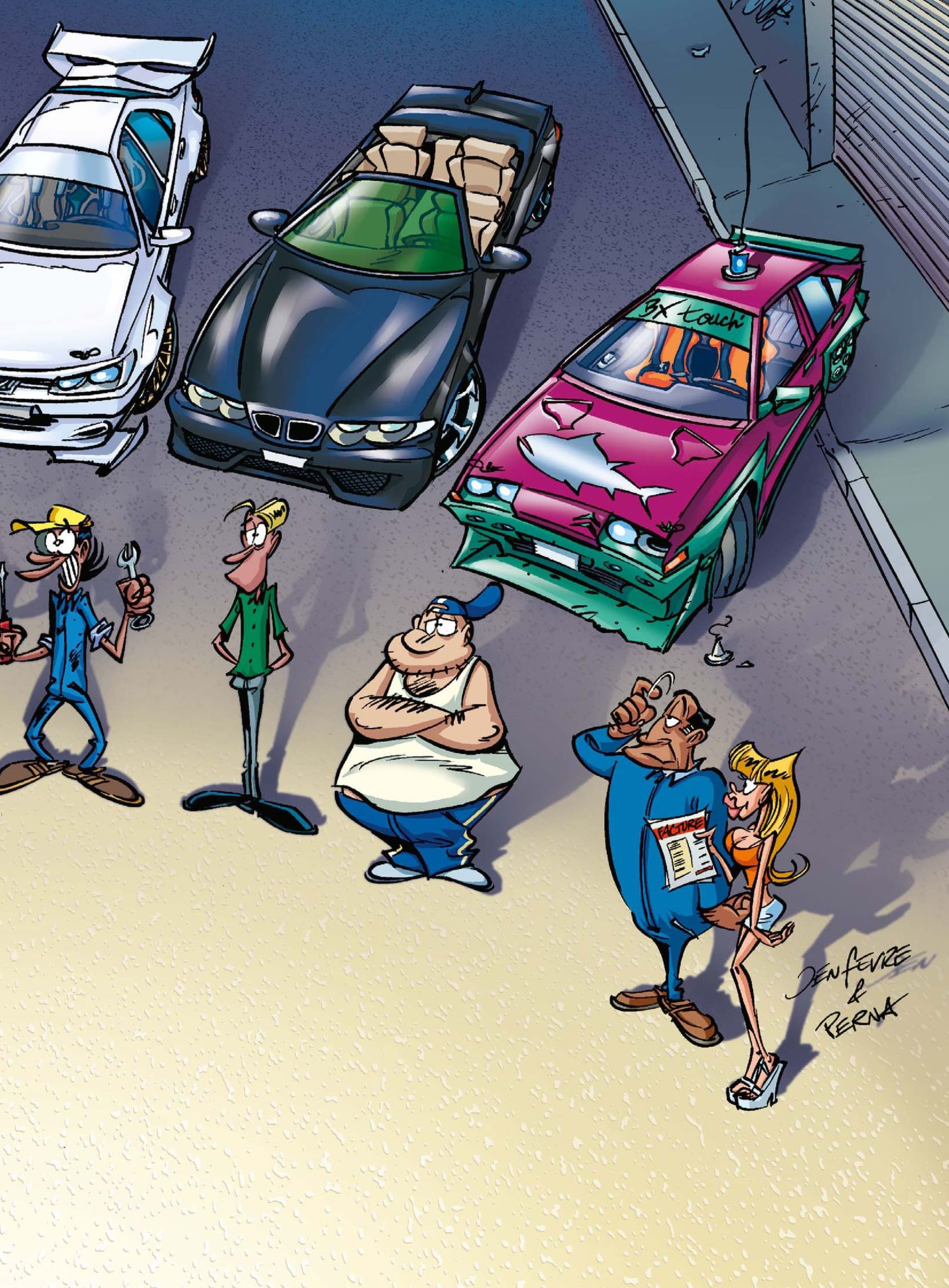 Leur principal lieu de rendez-vous est le petit garage de banlieue à l'ancienne tenu par m'sieur Nino, sorte de Ventura en bleu de travail. Là-bas, quand ils ne parlent pas tuning avec le petit mécano maculé de c ambouis qui répond au sobriquet de l'arpet, ils draguent comme des fous mademoiselle Agnès, la jolie secrétaire blonde, avec tout ce que ça a de caricatural...