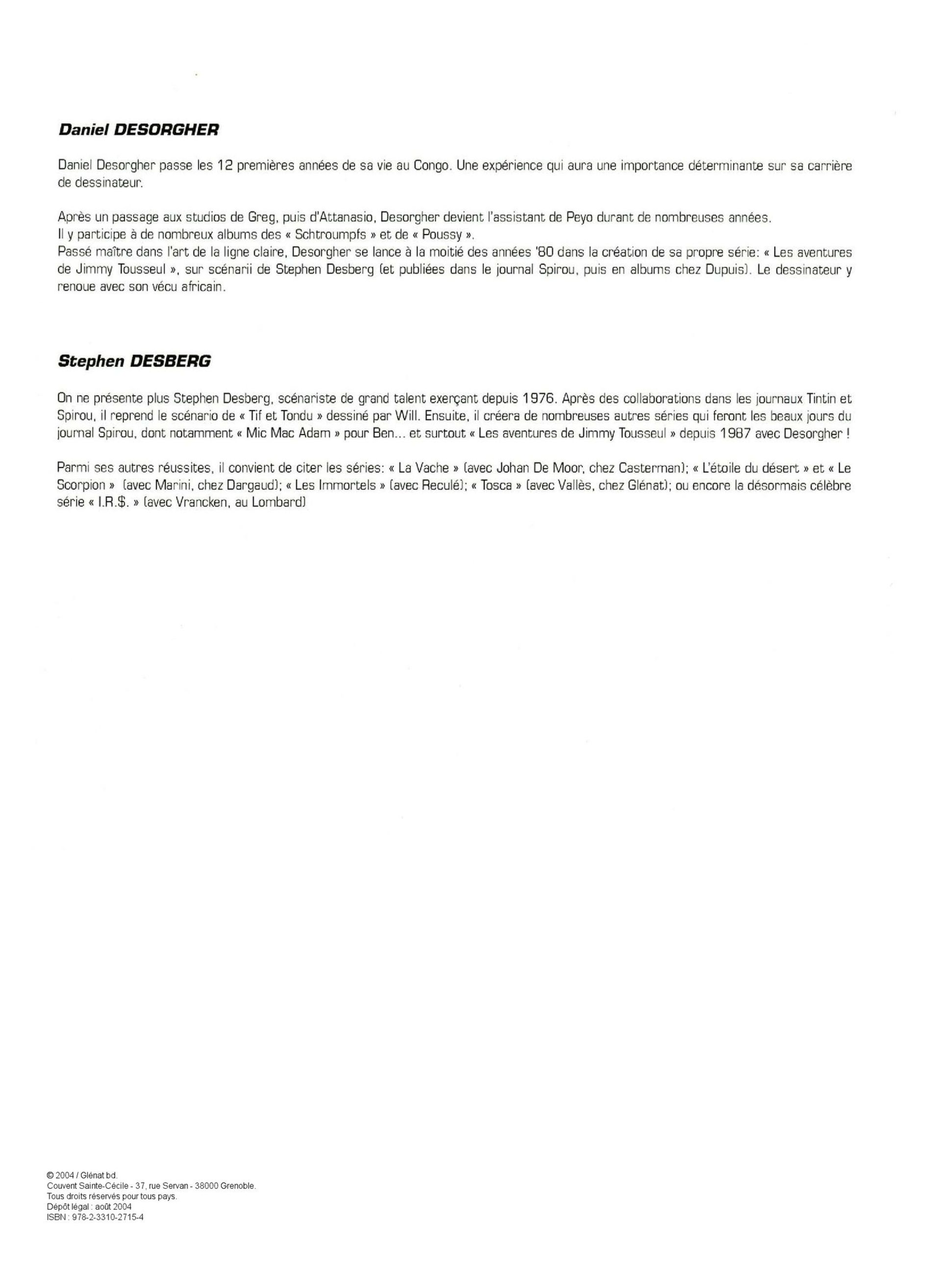 Jimmy Tousseul vous fera vivre ses aventures les plus folles, vous guidera dans l'Afrique des années 60 au travers d'histoires sensibles, documentées, bien ficelées et bourrées de personnages attachants. De la passion grandissante du tout jeune Jimmy pour l'Afrique à la concrétisation de son premier voyage vers ces terres... ces premiers tomes le lancent sur les traces de ses parents trop tôt disparus !
