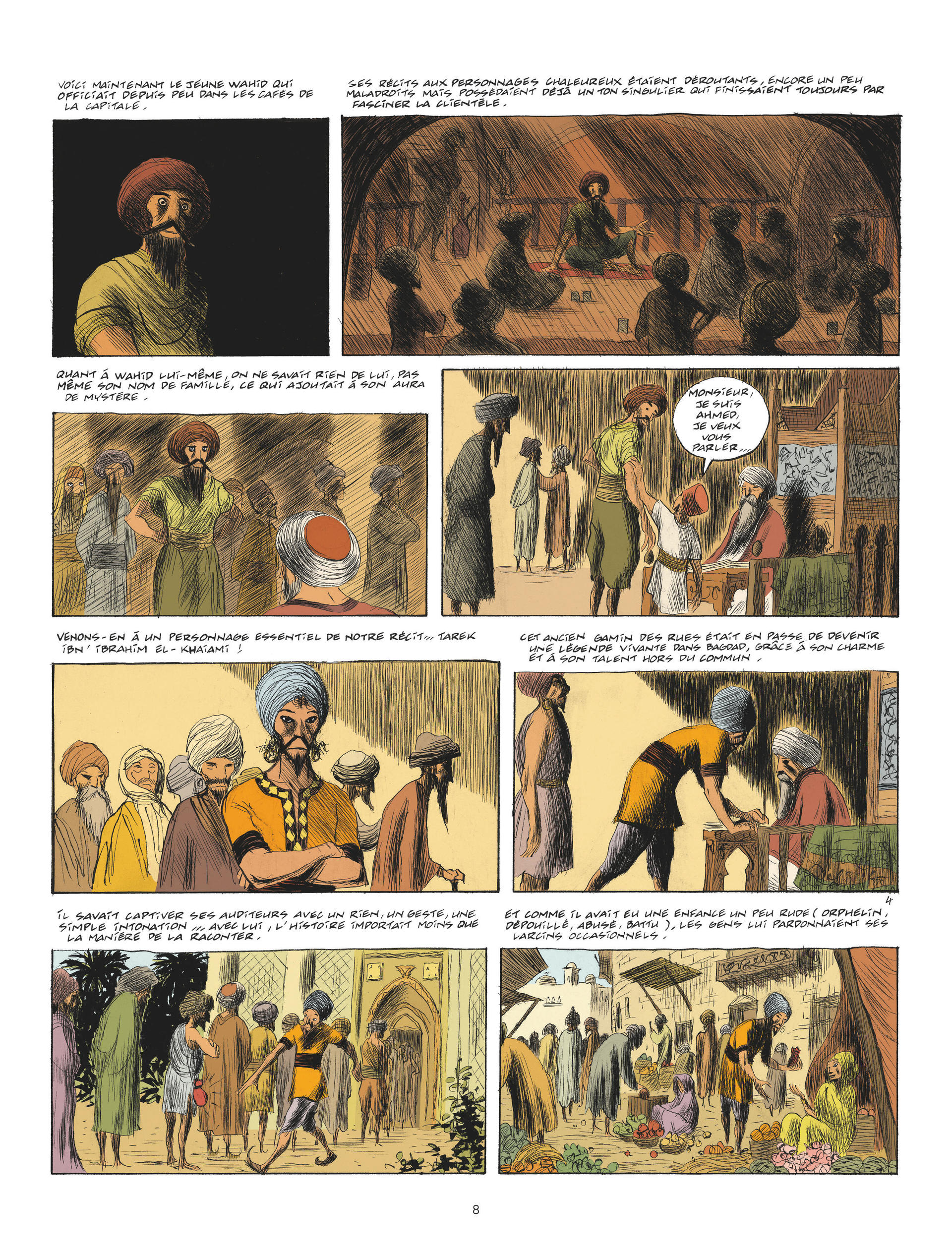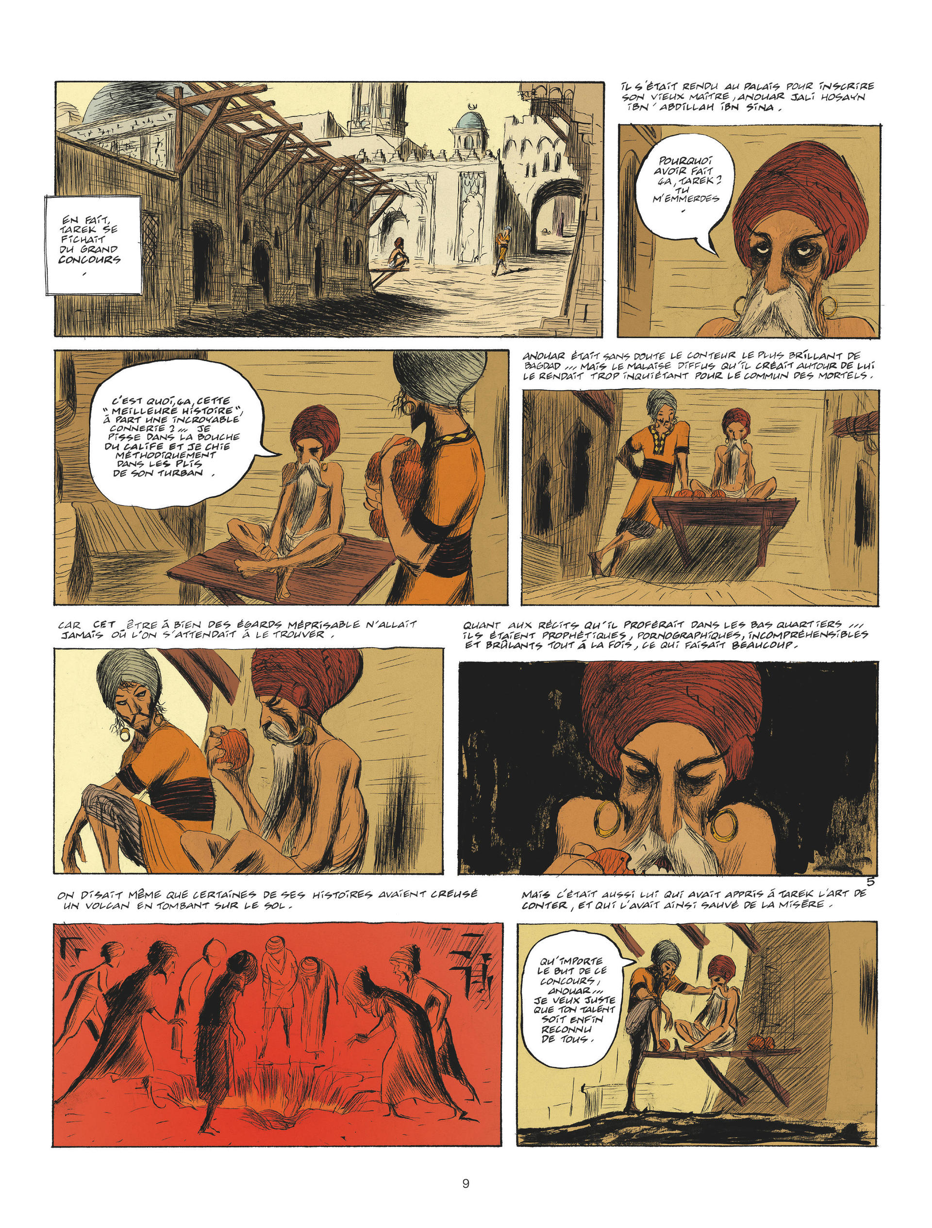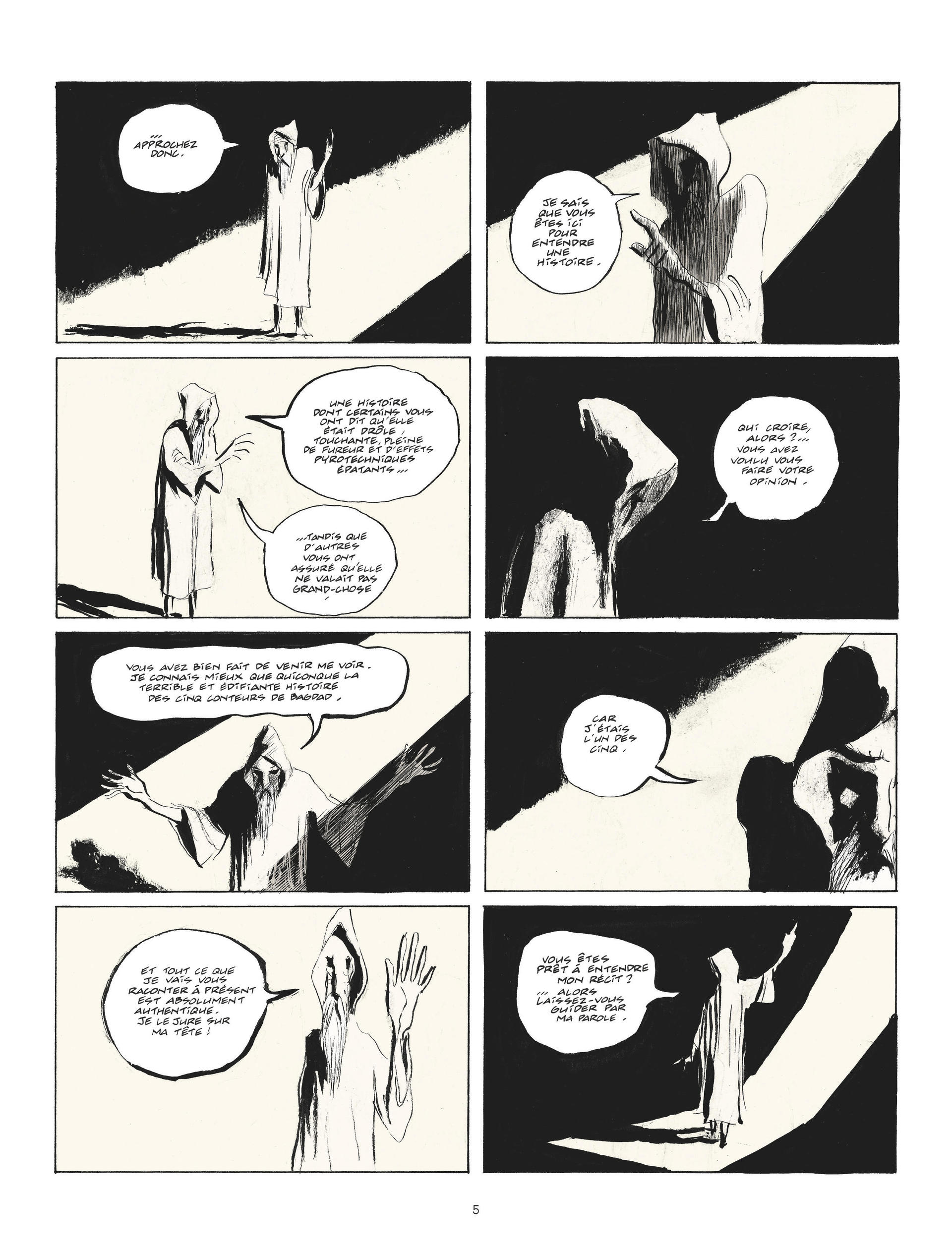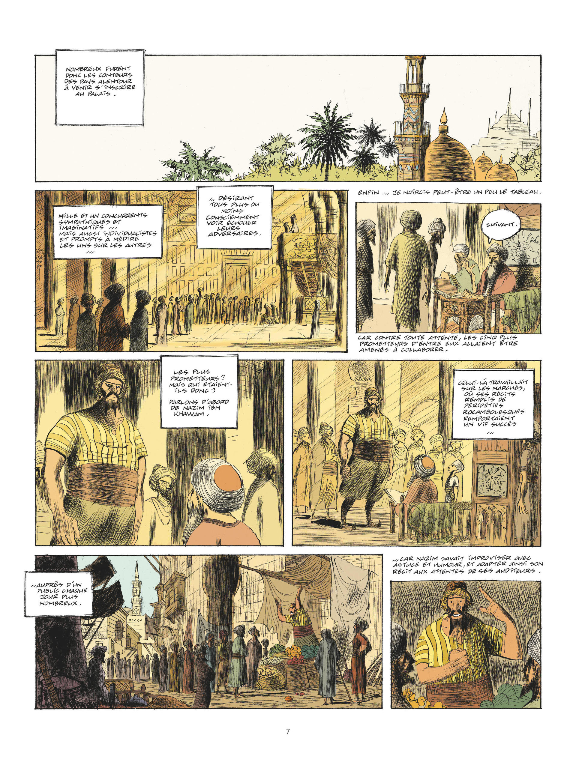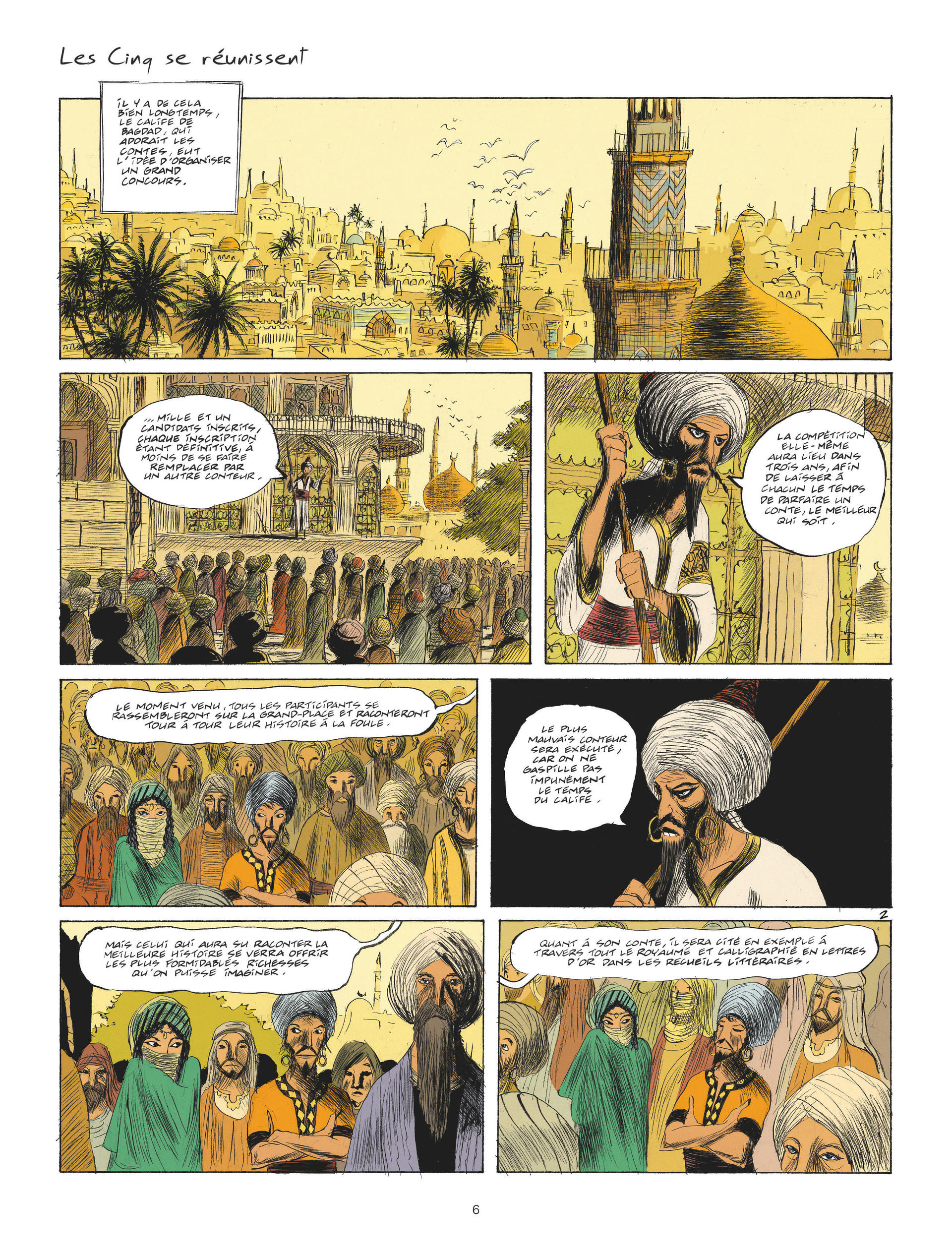 Grand amateur de contes, le calife de Bagdad organise un concours : dans trois ans, mille et un conteurs s'affronteront. Le gagnant connaîtra gloire et richesse, le perdant testera le supplice du pal. Donc, les cinq meilleurs conteurs de Bagdad partent pour un long voyage, histoire de raconter à leur retour, chacun à sa façon, ce qu'ils ont vu : Nazim, Tarek, Wahid (en réalité Wahida, une femme déguisée en homme), Ahmed, (l'enfant du calife) et Anouar, le vieux maître de Tarek – le meilleur conteur, aux histoires un peu trop inquiétantes pour le pékin moyen, qui refuse d'ailleurs de s'inscrire à cette "connerie" : "Je pisse dans la bouche du calife et je chie méthodiquement dans les plis de son turban", dit-il. Avant de partir, moyennant vingt dinars, nos héros consultent la meilleure devineresse de Bagdad et c'est une très mauvaise idée : vu que la prédiction inclut, entre autres calamités, le meurtre d'Anouar par le gentil Nazim et le mariage de Tarek avec Wahida, ils se mettent en route dans une ambiance plutôt lourde.