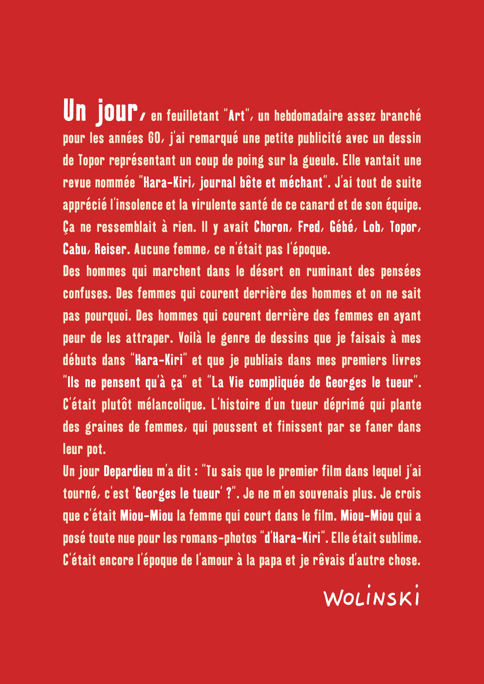 Wolinski est un fabuleux observateur de notre société qui sévit dans la presse française depuis ses premières armes dans "Hara-Kiri". Phallocrate autoproclamé, il a fait des relations hommes / femmes le fil conducteur de son travail, que ce soit dans "Charlie Hebdo" ou dans "L’Écho des Savanes". Il nous offre ici un panorama complet, ordonné par présidence (car sexe et politique ont partie liée !), de l’évolution des mœurs de notre société sur les 50 dernières années, de De Gaulle à Sarkozy en passant par Pompidou, Giscard, Mitterrand et Chirac. Depuis les années 60, où le mariage était encore de rigueur et les tabous nombreux, à nos années 2000 où le sexe est porté en étendard et où la capote, le mariage gay ou la condition féminine ont été discutés à l’Assemblée, Wolinski porte un regard tendre et mordant sur ce thème qui nous concerne tous.