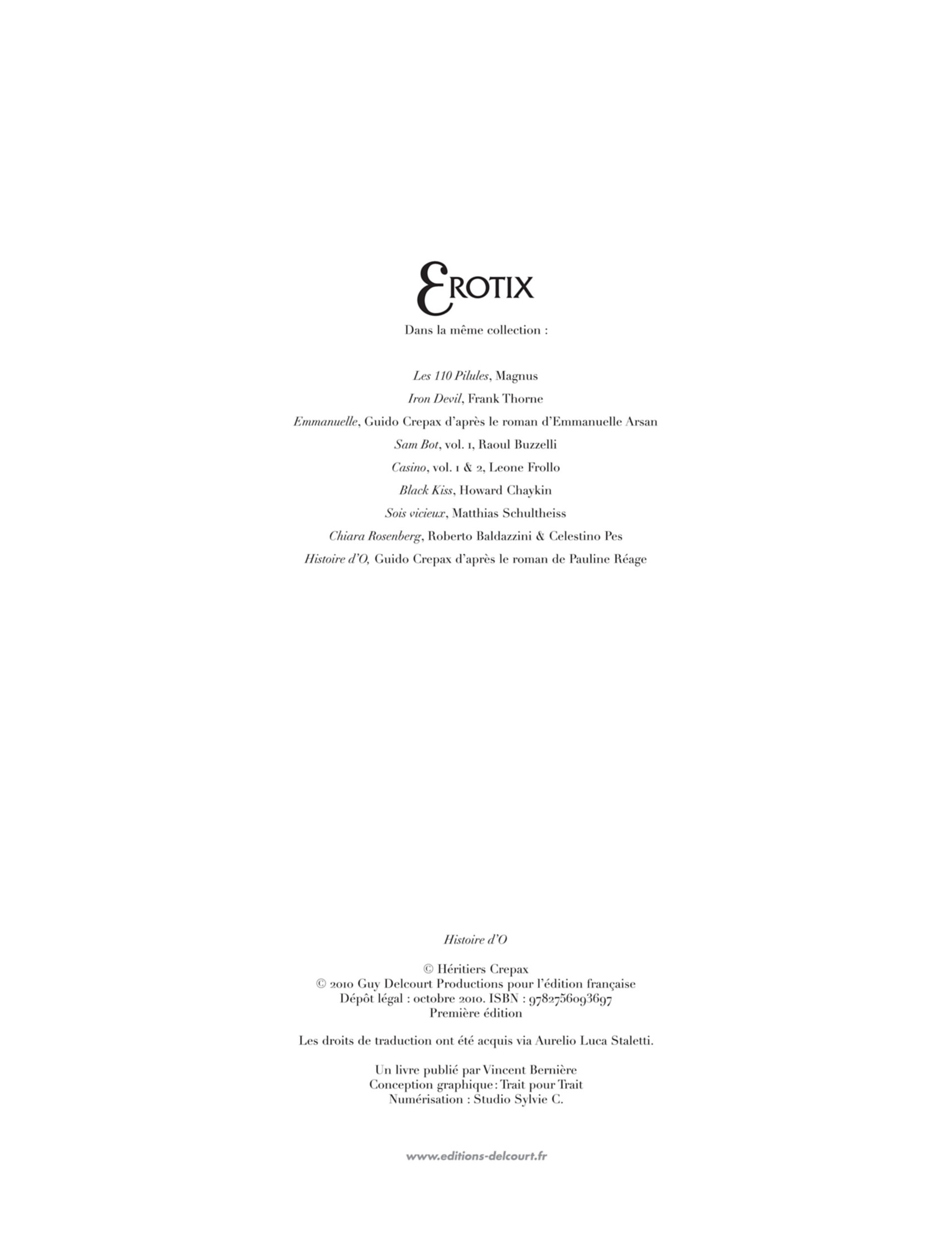 Après Emmanuelle, Guido Crepax reprend dans une version élégante un autre chef-d'oeuvre de la littérature érotique : Histoire d'O ou l'histoire d'une jeune femme indépendante emmenée par son amant dans un château où l'on dresse les femmes. De son plein gré, elle devient esclave. Marquée au fer rouge aux initiales de son maître, elle accepte de s'en remettre entièrement à lui, quelle que soit l'issue...