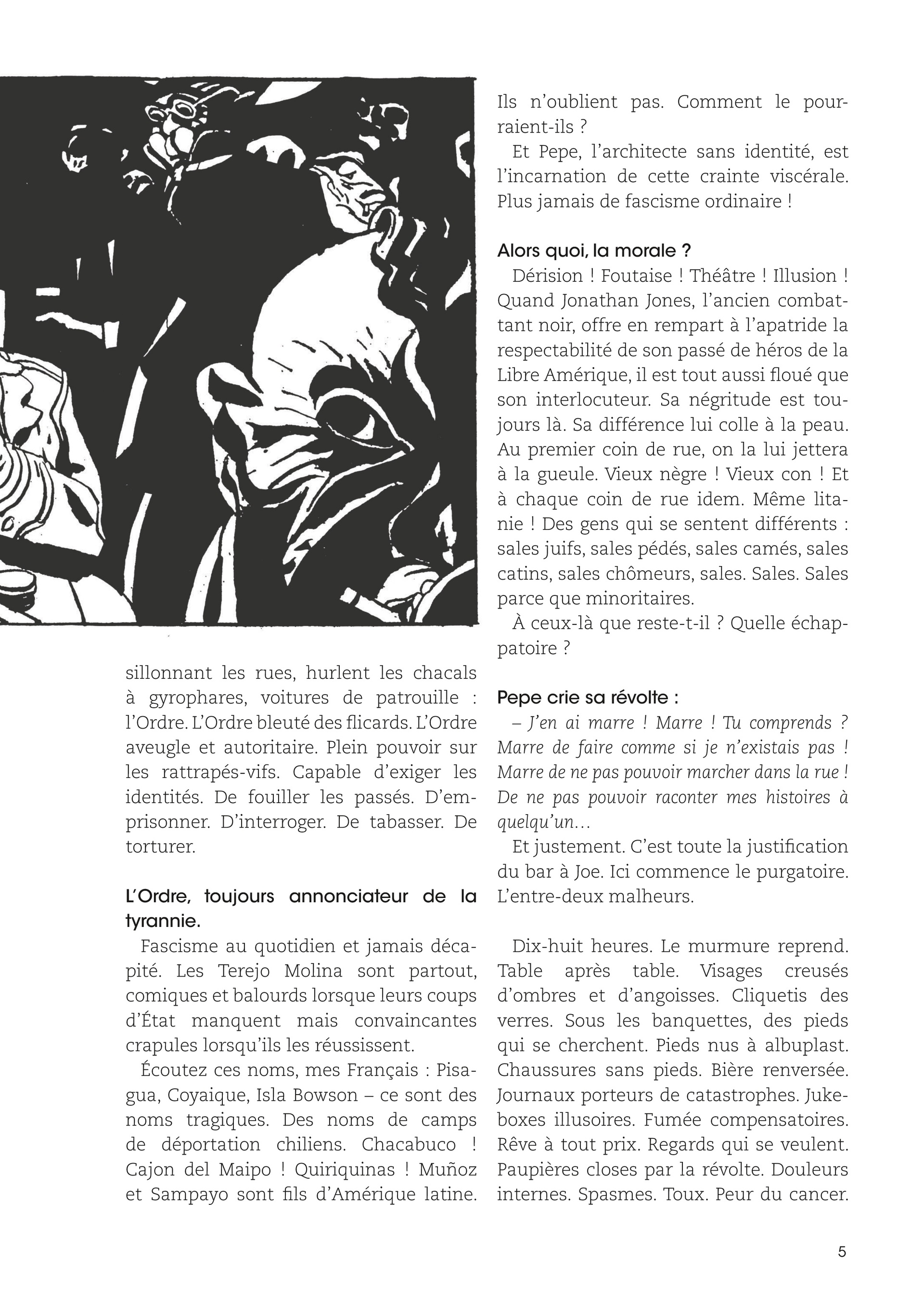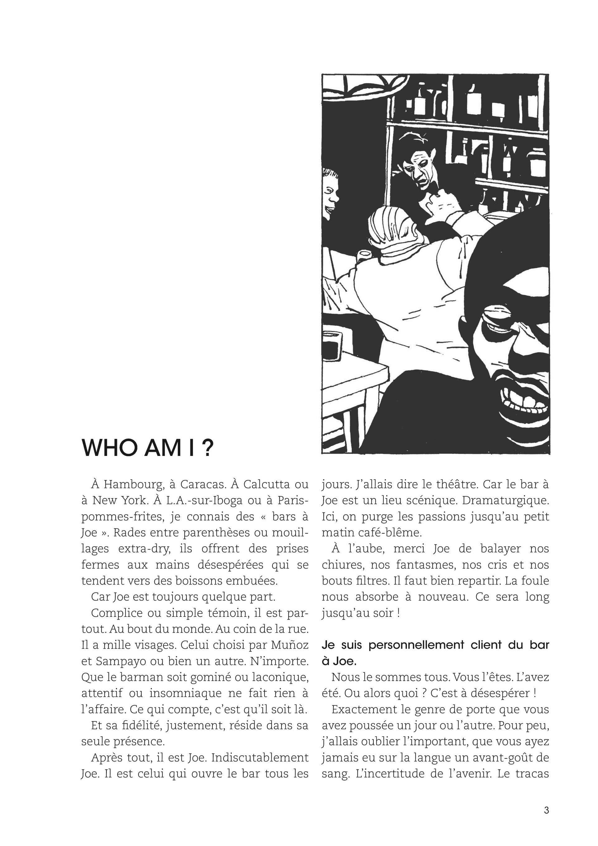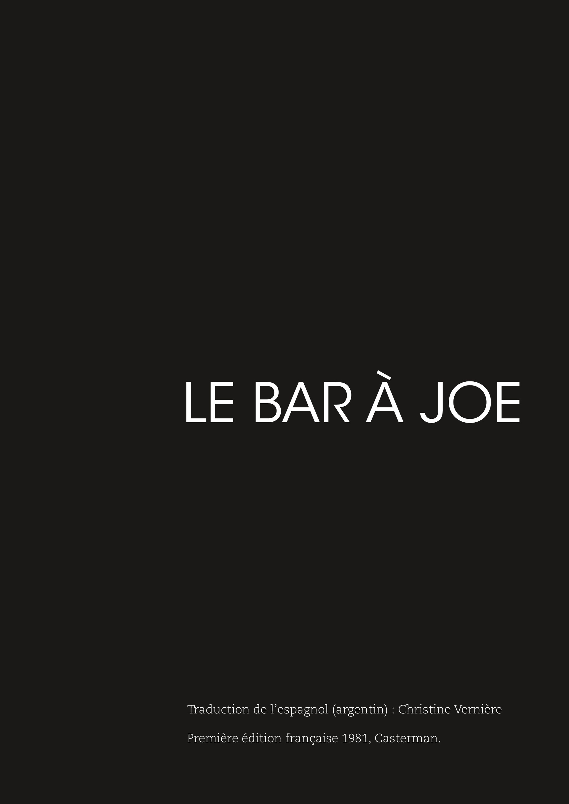 Où peut-il bien se trouver le bar à Joe, pour que tant d'êtres si différents s'y croisent, glissant l'un à côté de l'autre sans savoir quel drame est en train de traverser le type de la table en face... Au bar à Joe, on trouve de tout : anciens boxeurs sur le retour, photographes, tueurs, médecins, philatélistes... Comment expliquer que tant de destinées se jouent entre les allées et venues au “Bar à Joe”?