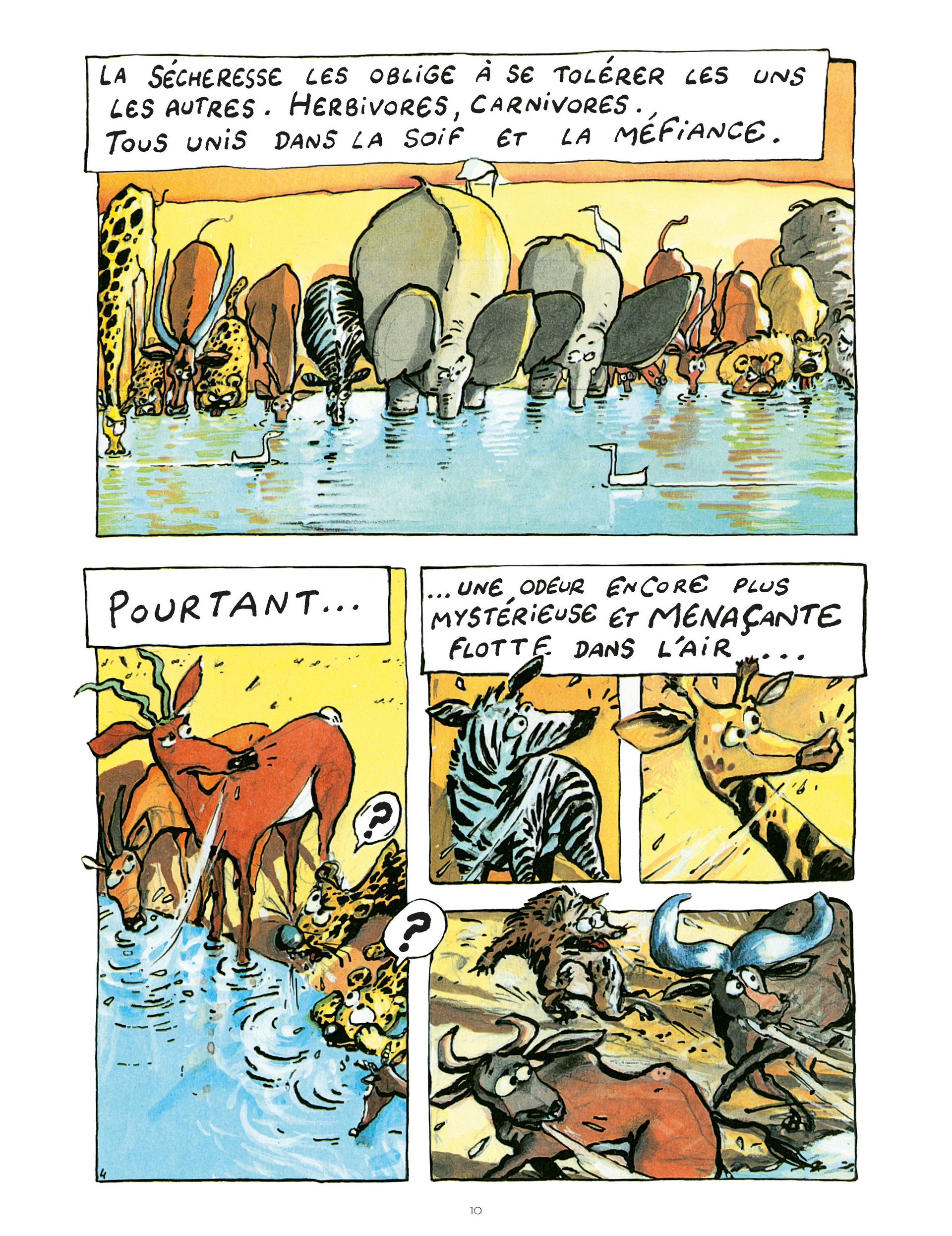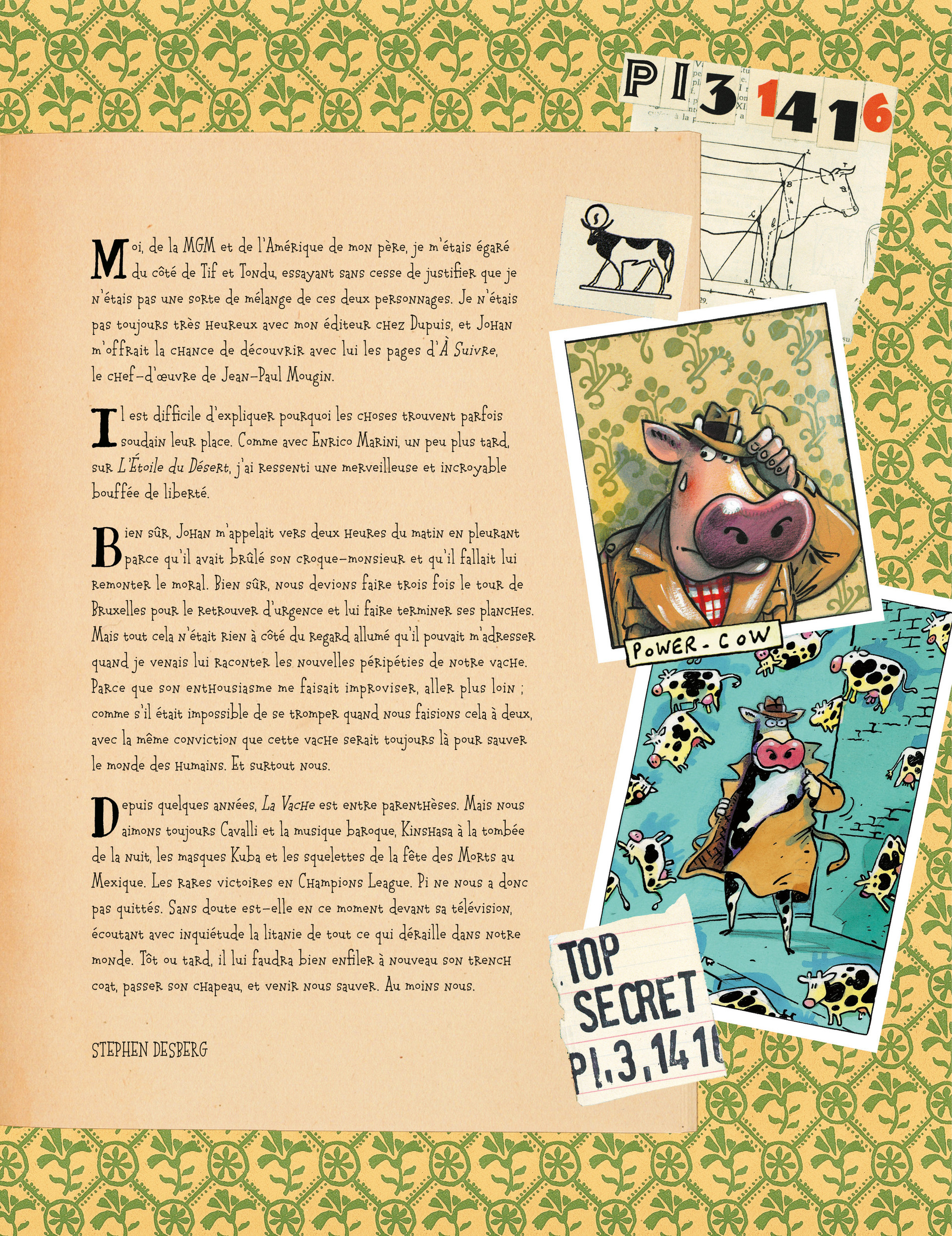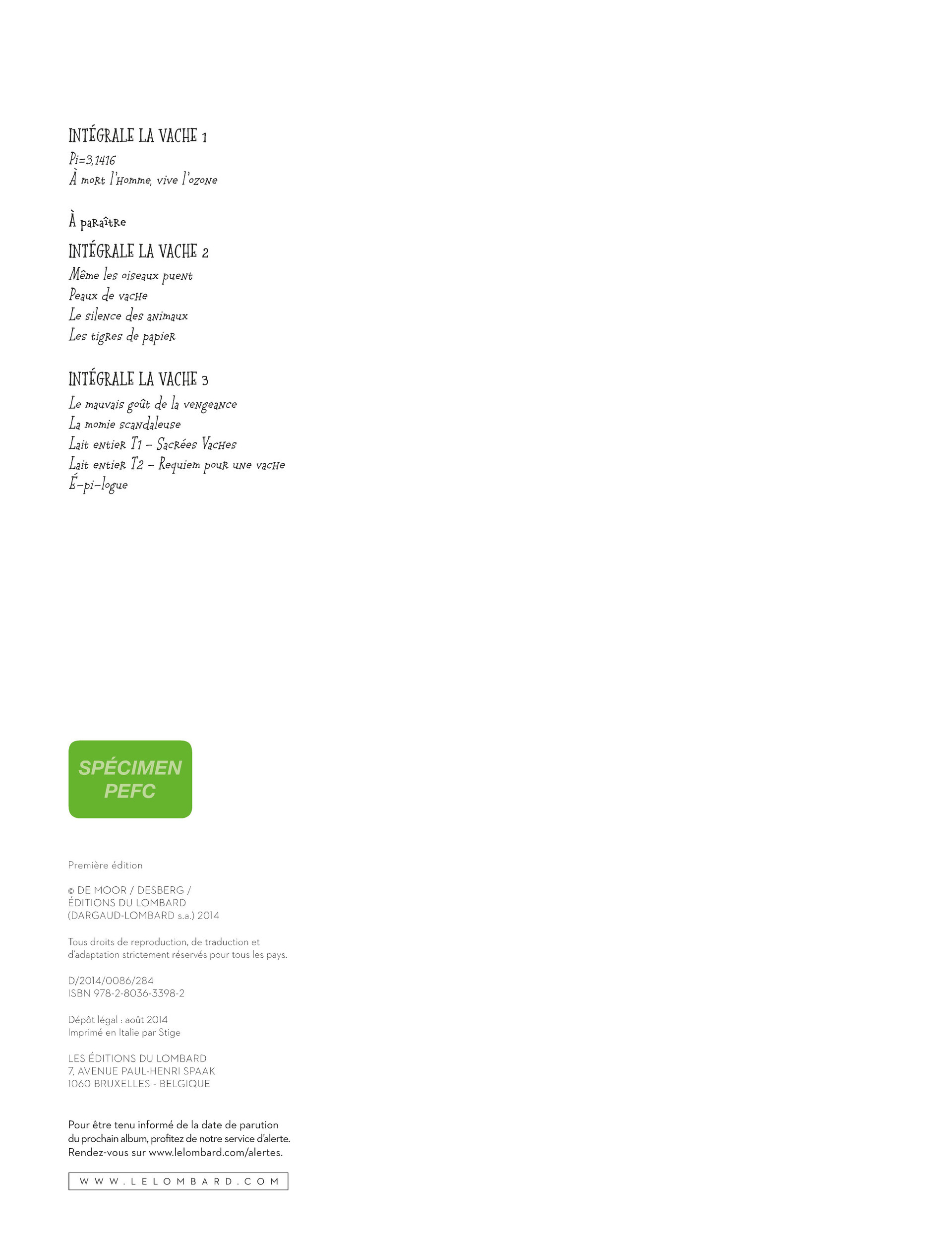 La vache Pi 3,1416 fait tout son possible pour que les humains n'apprennent pas que les animaux parlent. Qui sait ce qu'ils feraient faire aux animaux ?? C'est une série d'humour absurde qui est tout à fait réjouissante. Les BD mêlant animaux et humains sont rares. Attention, les humains n'y ont pas vraiment le beau rôle !! Les dessins de De Moor sont aussi d&eac...