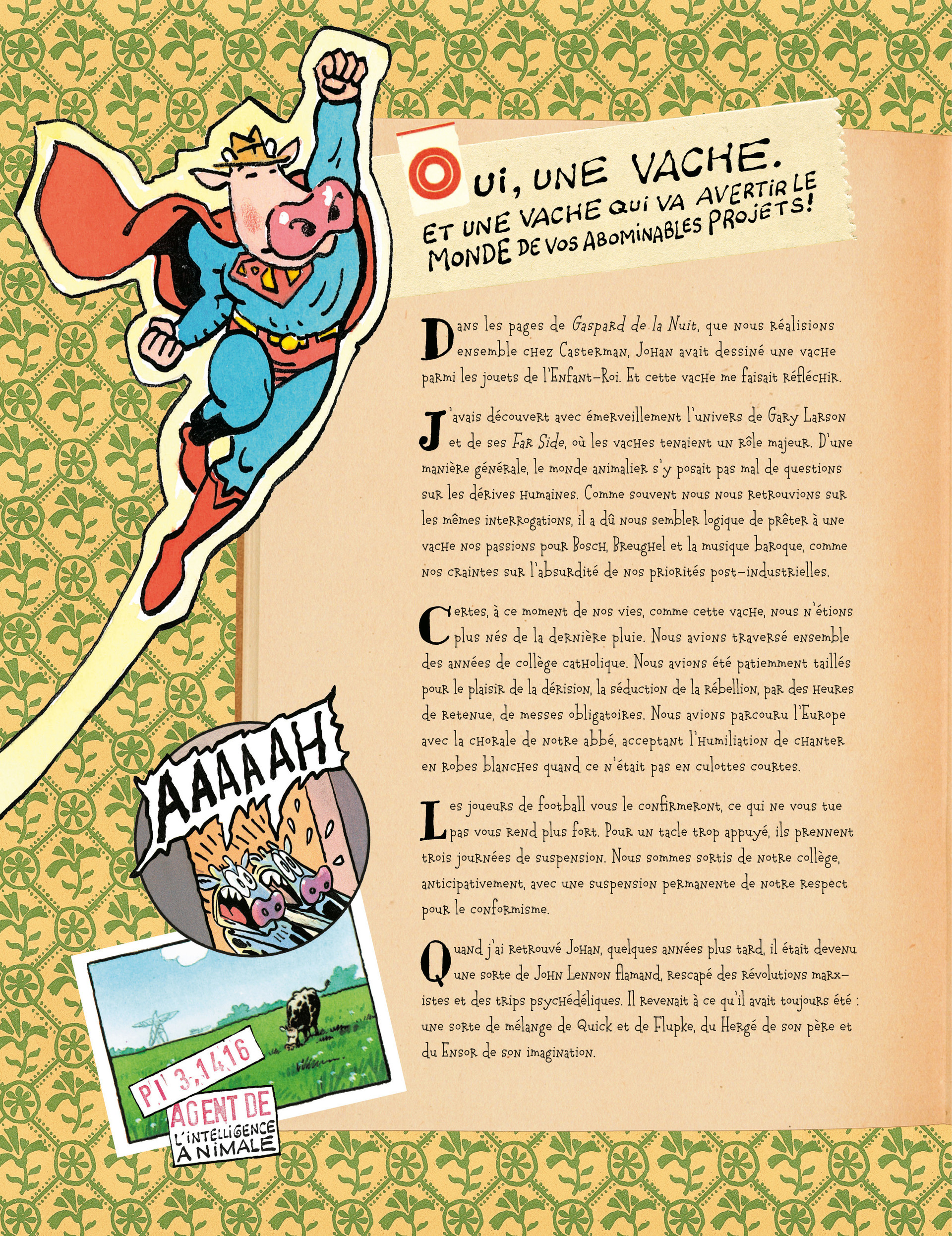 Agent secret issue du monde des animaux, La Vache Pi 3,1416 enquête incognito dans le monde des humains. Dans ce premier volume, notre héroïne sauvera les animaux de la vengeance du féroce Konsianz Kourt, mais elle devra aussi s'opposer à une bande de carnivores affamés afin de sauver les humains et, accessoirement, la couche d'ozone.