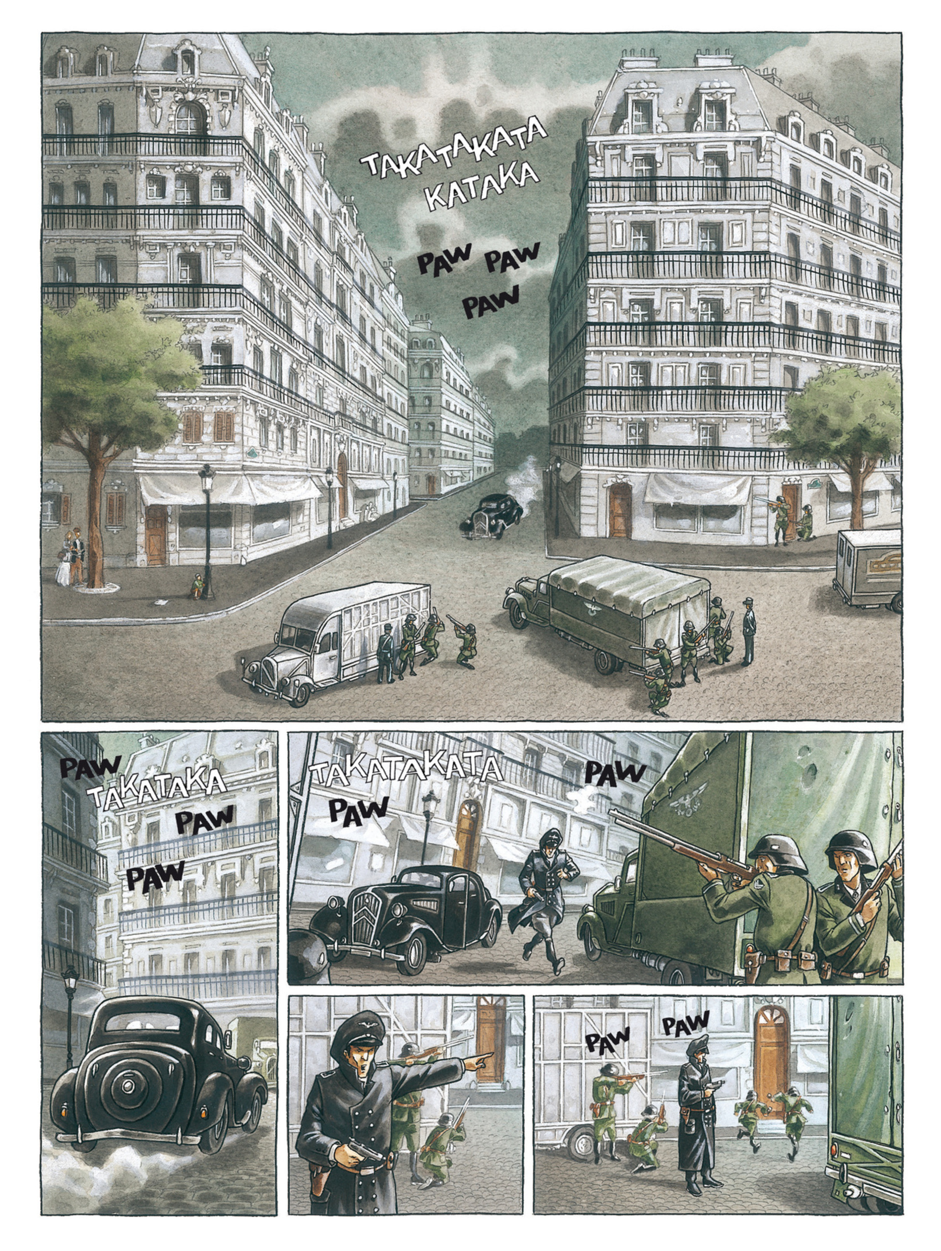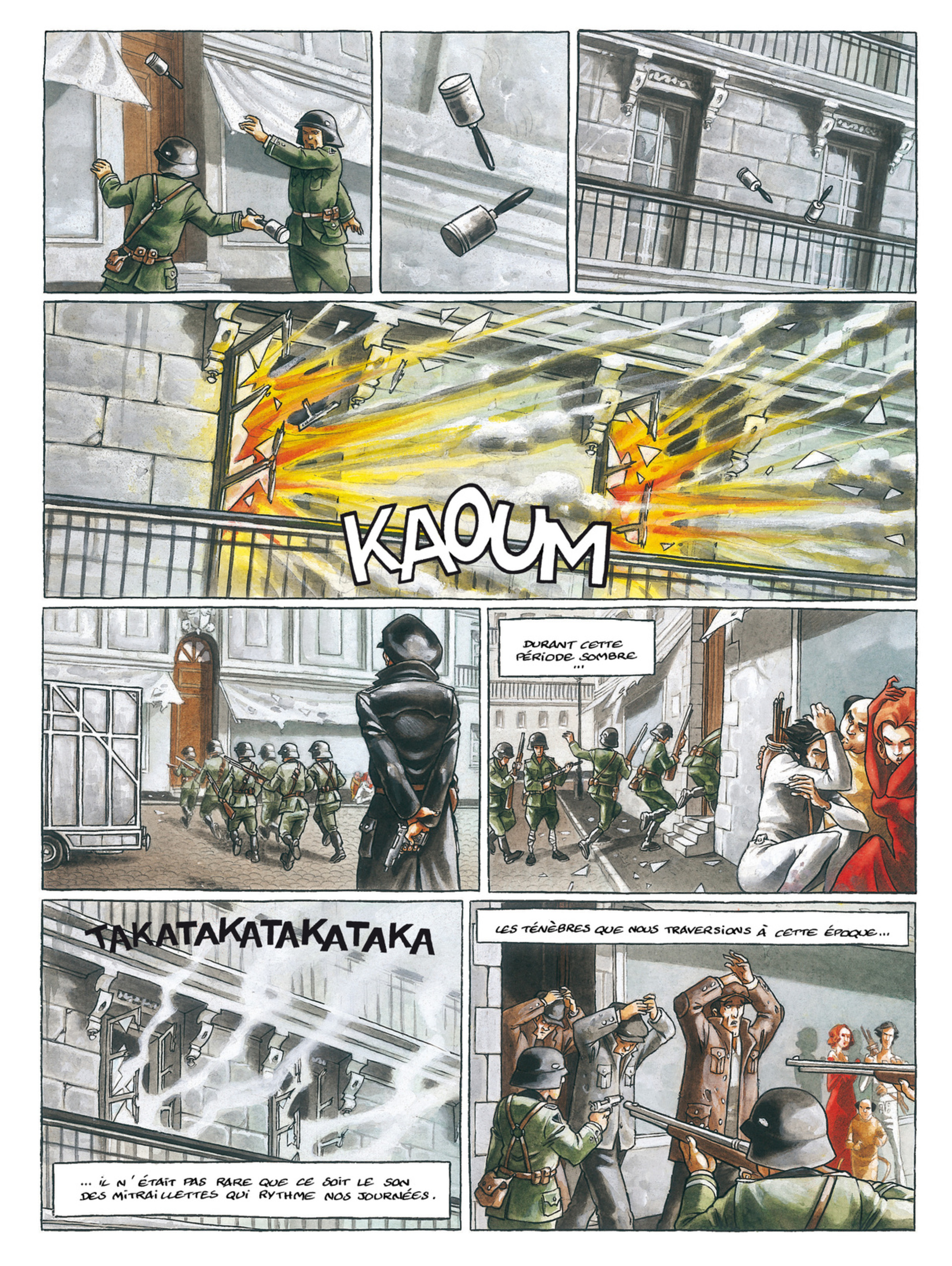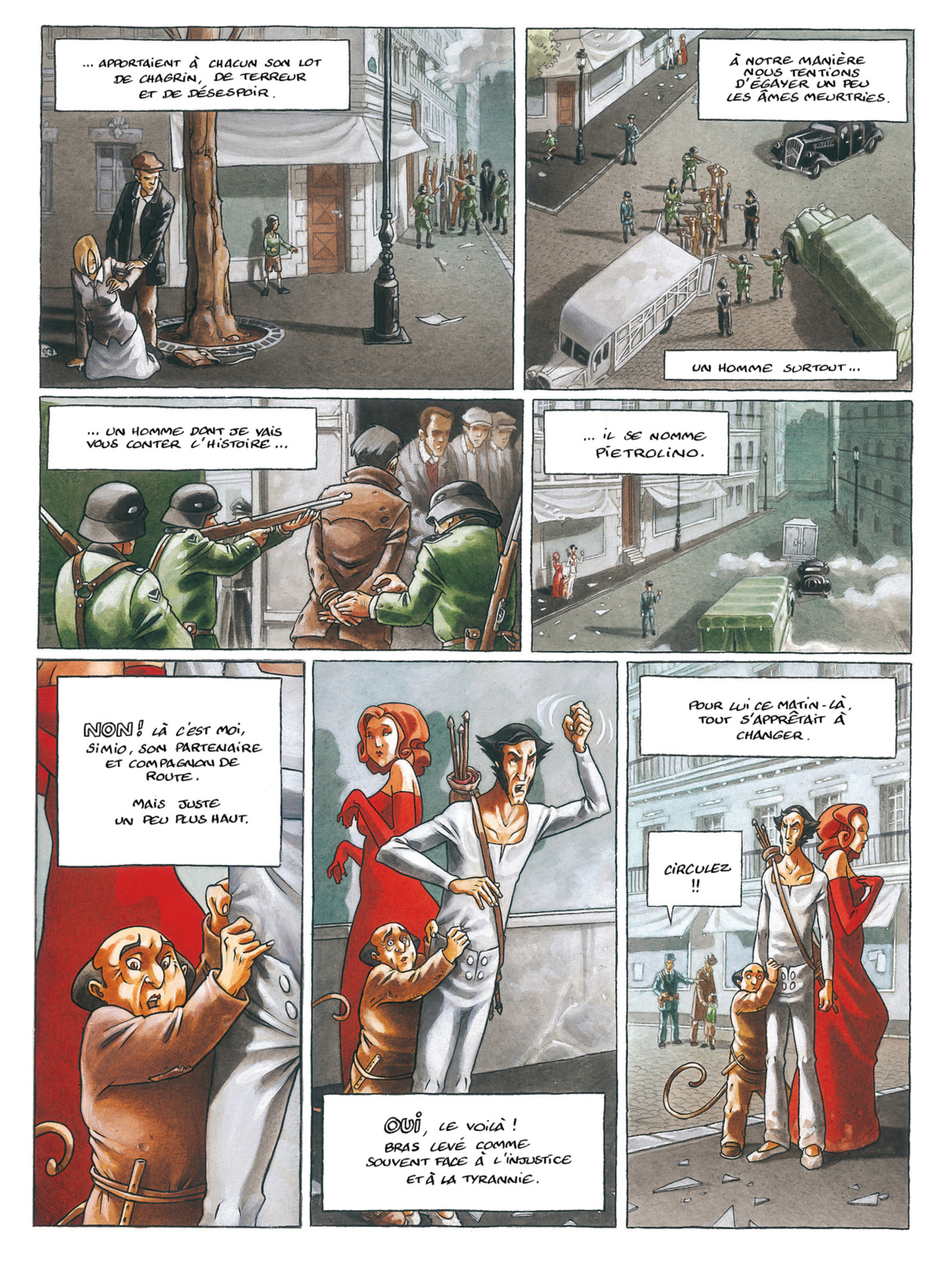 Dans les rues, les nazis font régner la terreur. Témoins impuissants de la barbarie, deux hommes et une femme tentent de survivre. L’un d’eux s’appelle Pietrolino. Il est mime. Il sait faire oublier la grisaille de ces années de plomb par la seule magie de ses mains. Son partenaire et compagnon de route a pour nom Simio. Petit homme plein de ressources, au physique ingrat mais à la débrouillardise infinie, il est le narrateur de cette histoire. Une femme, Colombella, les accompagne à contrecoeur, ponctuant leurs pérégrinations de ses disputes incessantes avec Simio.