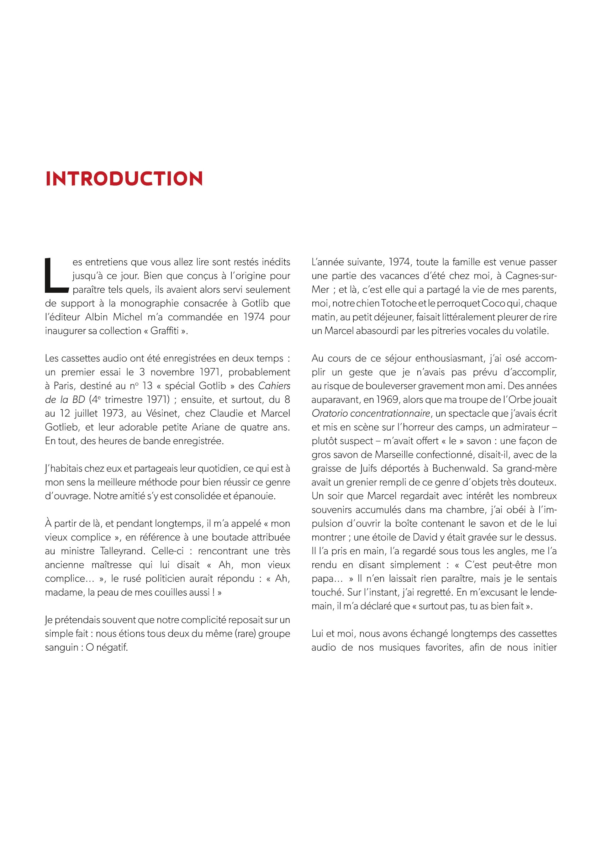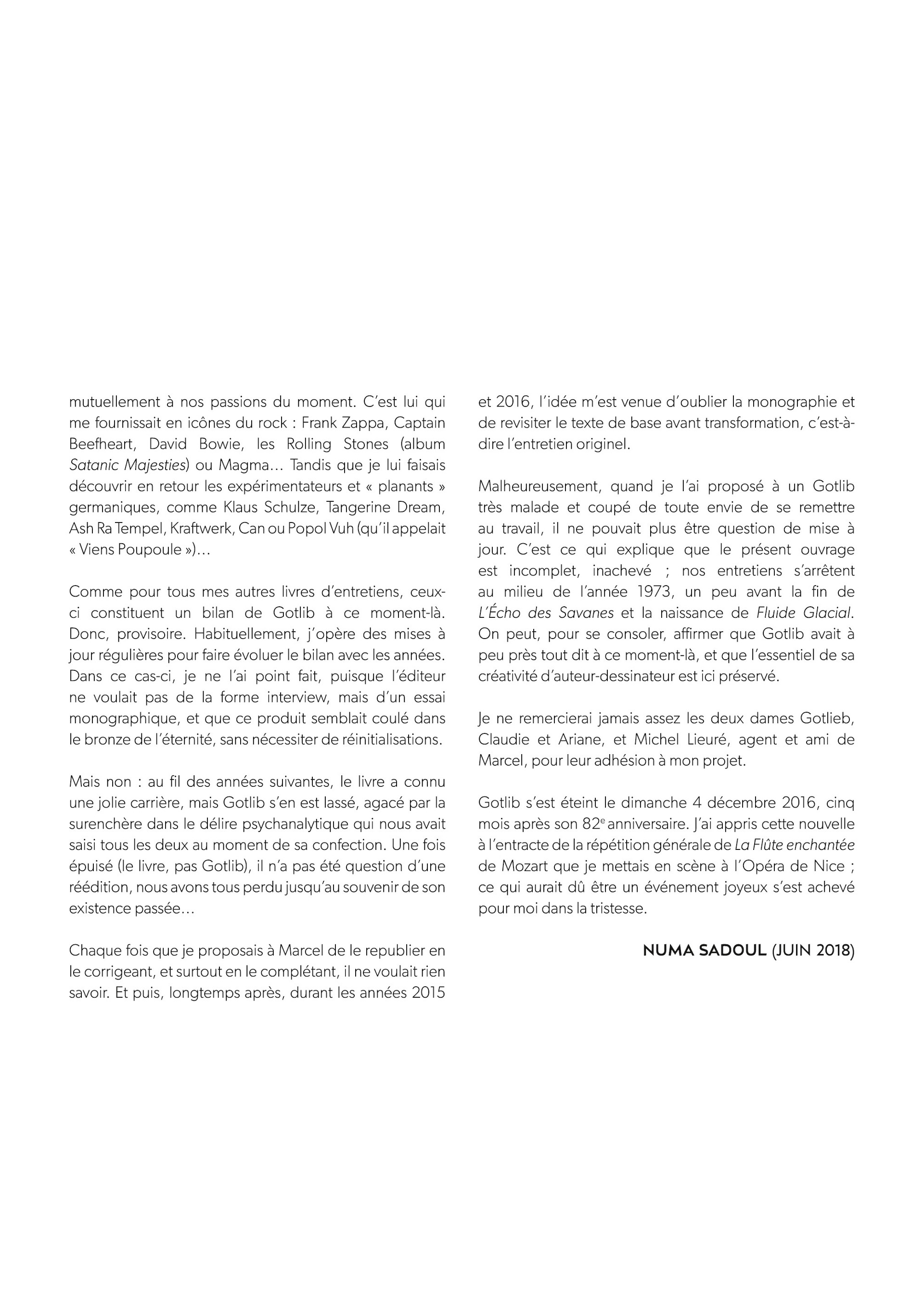 Numa Sadoul est notamment connu pour avoir mené des entretiens en profondeur avec les plus grands auteurs : Franquin, Hergé, Giraud et Gotlib. Il réalisa en 1973 ces entretiens avec l'immense Marcel mais l'éditeur de l'époque, Albin Michel, ne souhaita pas les retranscrire tels quels. Les voici donc enfin dans leur forme originelle, permettant de découvrir un auteur qui n'hésite pas à s'ouvrir, abordant tous les sujets. Réactualisés, agrémentés de documents photographiques inédits, ces entretiens ont été réalisés durant une année à un moment-clé de la vie de Gotlib, après Pilote, avant Fluide et au moment où il créa L'Écho des Savanes avec Bretécher et Mandryka