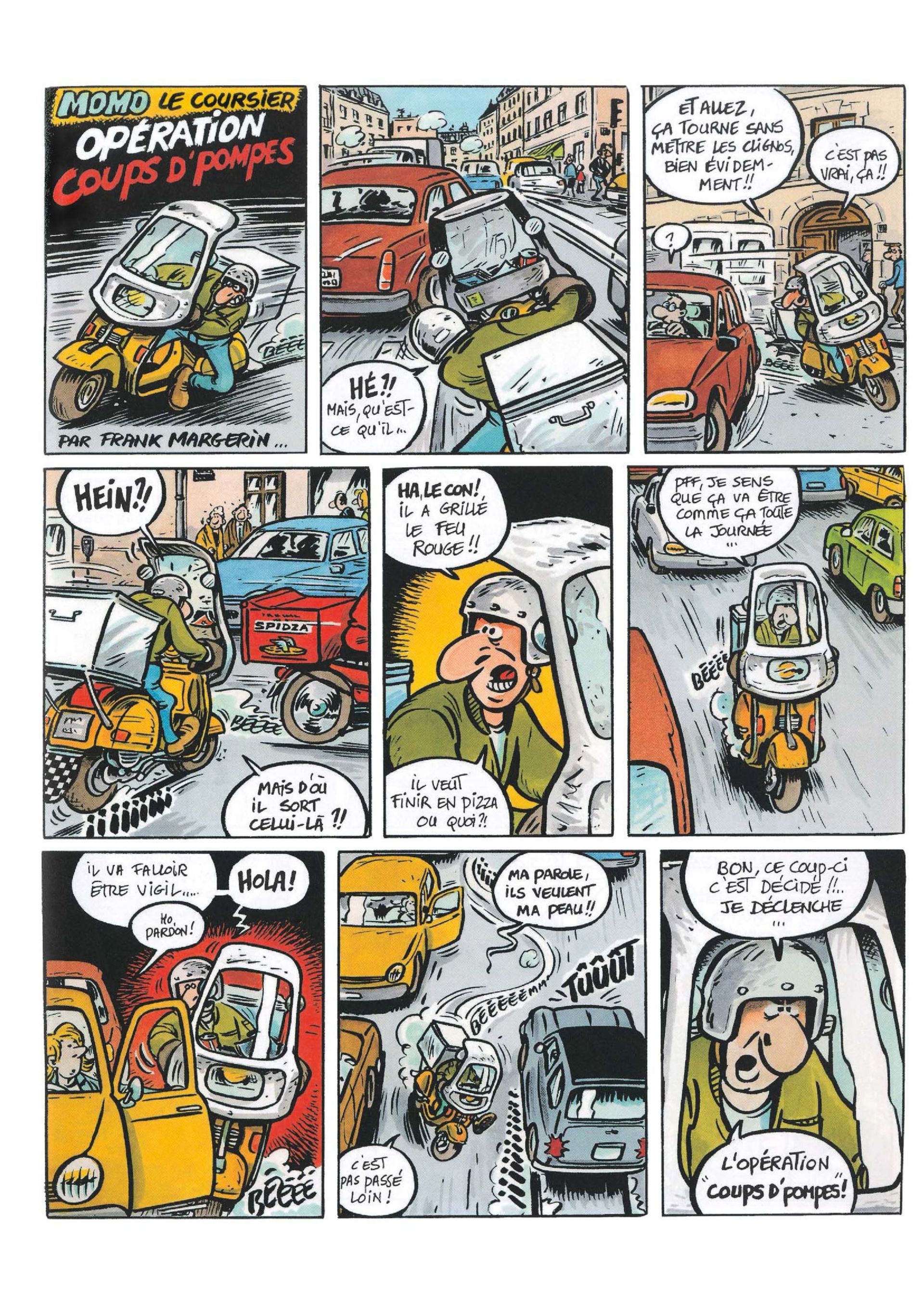 Momo un est coursier au grand cœur. Son théâtre, c'est la rue avec sa cohorte de rencontres et de dangers : les voitures bien sûr mais aussi les piétons, les vélos, les chiens... Momo voit beaucoup de gens, ceux qui lui confient des plis urgents, des colis délicats, des missions secrètes où l'avenir entier des sociétés est entre ses mains. Tout se passerait très bien si le sympathique Momo n'était pas aussi terriblement lourdaud, gaffeur et un peu frimeur...