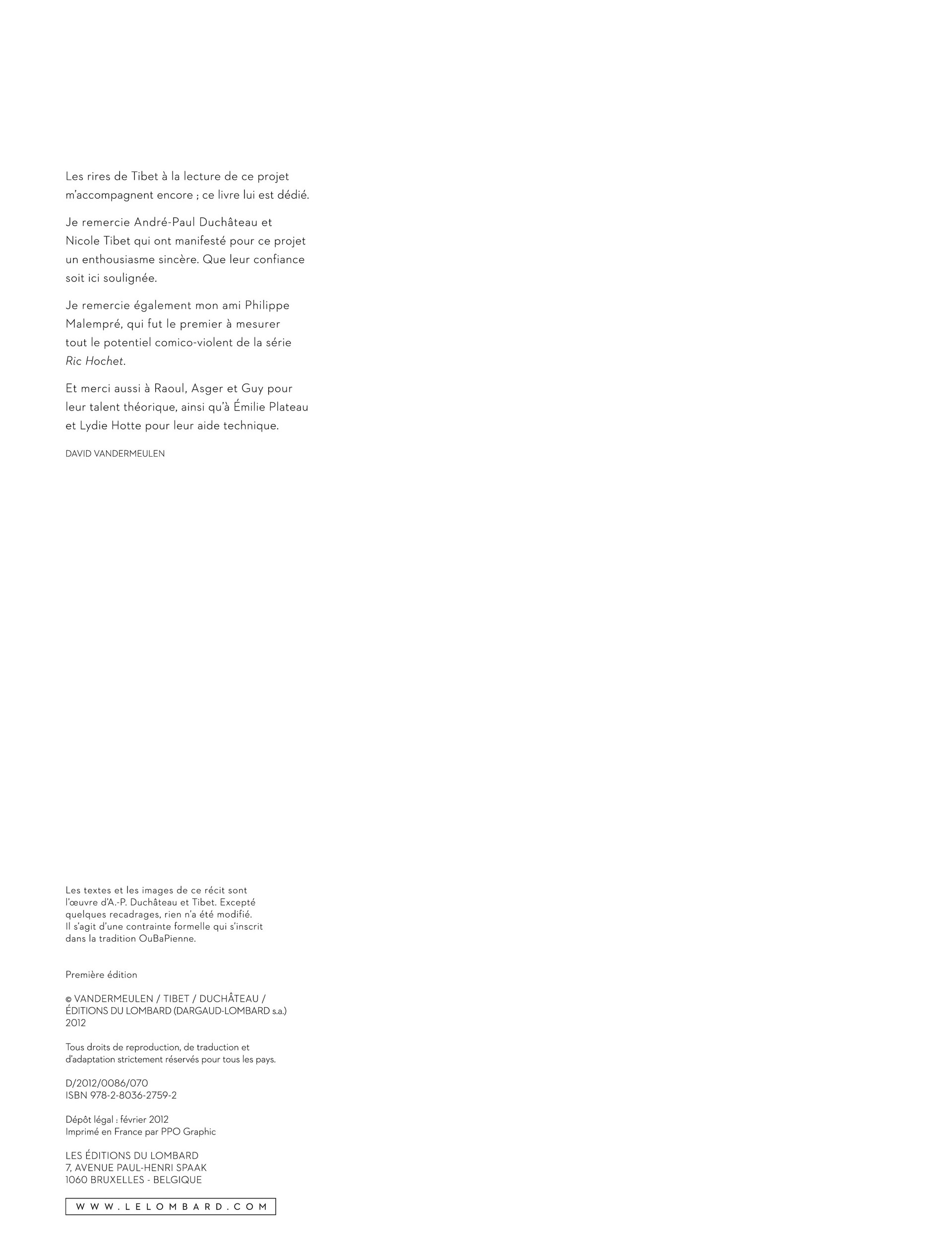 Cet album étonnant résulte de la démarche toute particulière de David Vandermeulen. Sous le regard amusé et bienveillant de Tibet et Duchateau, il a reconstruit une nouvelle aventure de Ric Hochet à partir de cases extraites des albums existants.