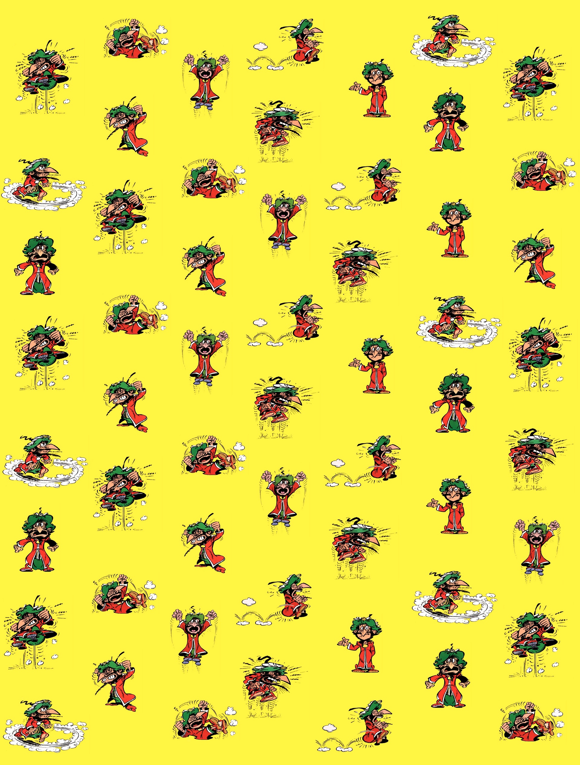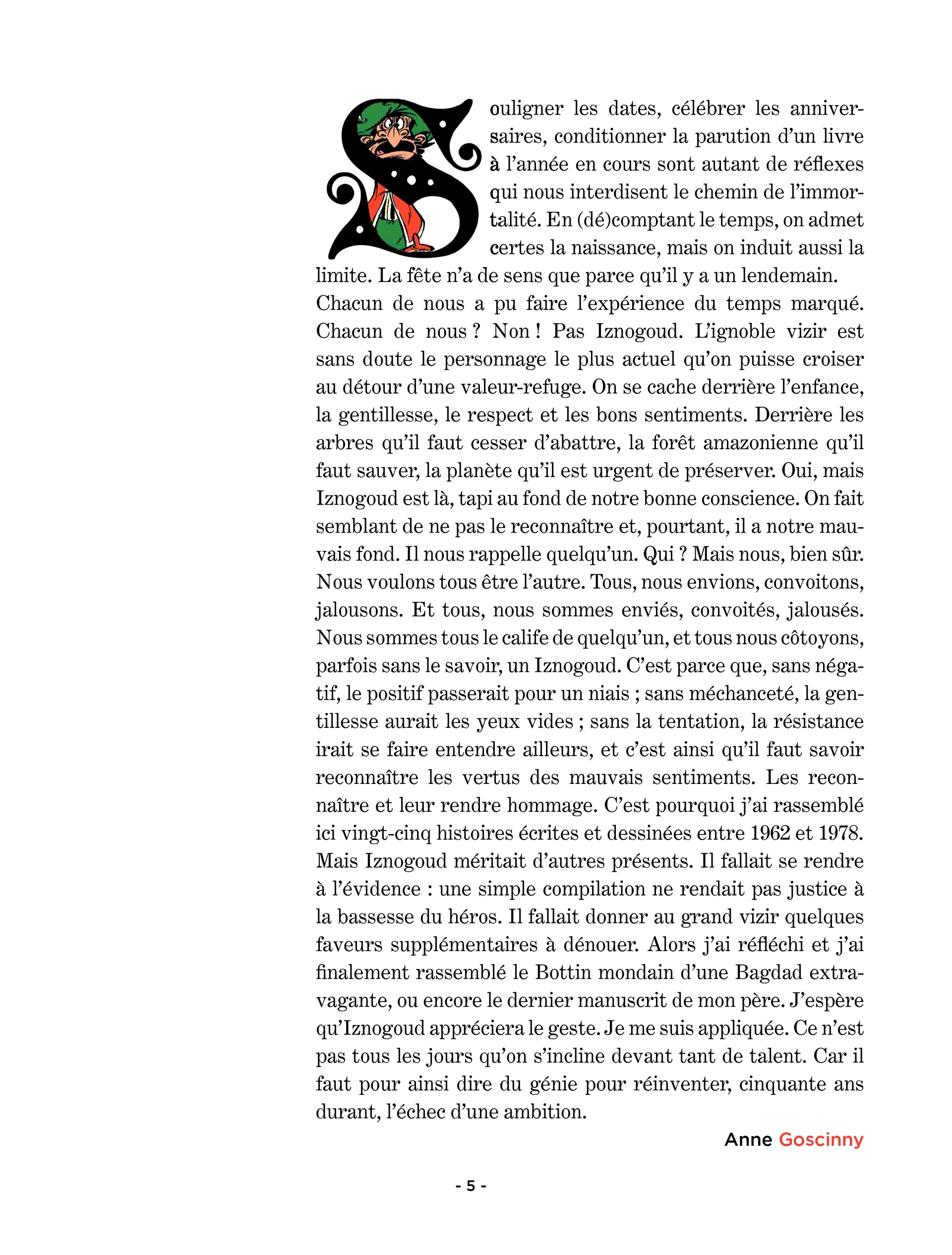 "Deux personnages sont les vedettes de cette série : Haroun El Poussah, calife de Bagdad, qui est très bon, très gros, pas très intelligent, qui ne fait rien, et le fait bien. Le grand vizir Iznogoud, qui est petit, maigre, et horriblement méchant. Iznogoud n'a qu'un rêve : devenir calife à la place du calife." René Goscinny