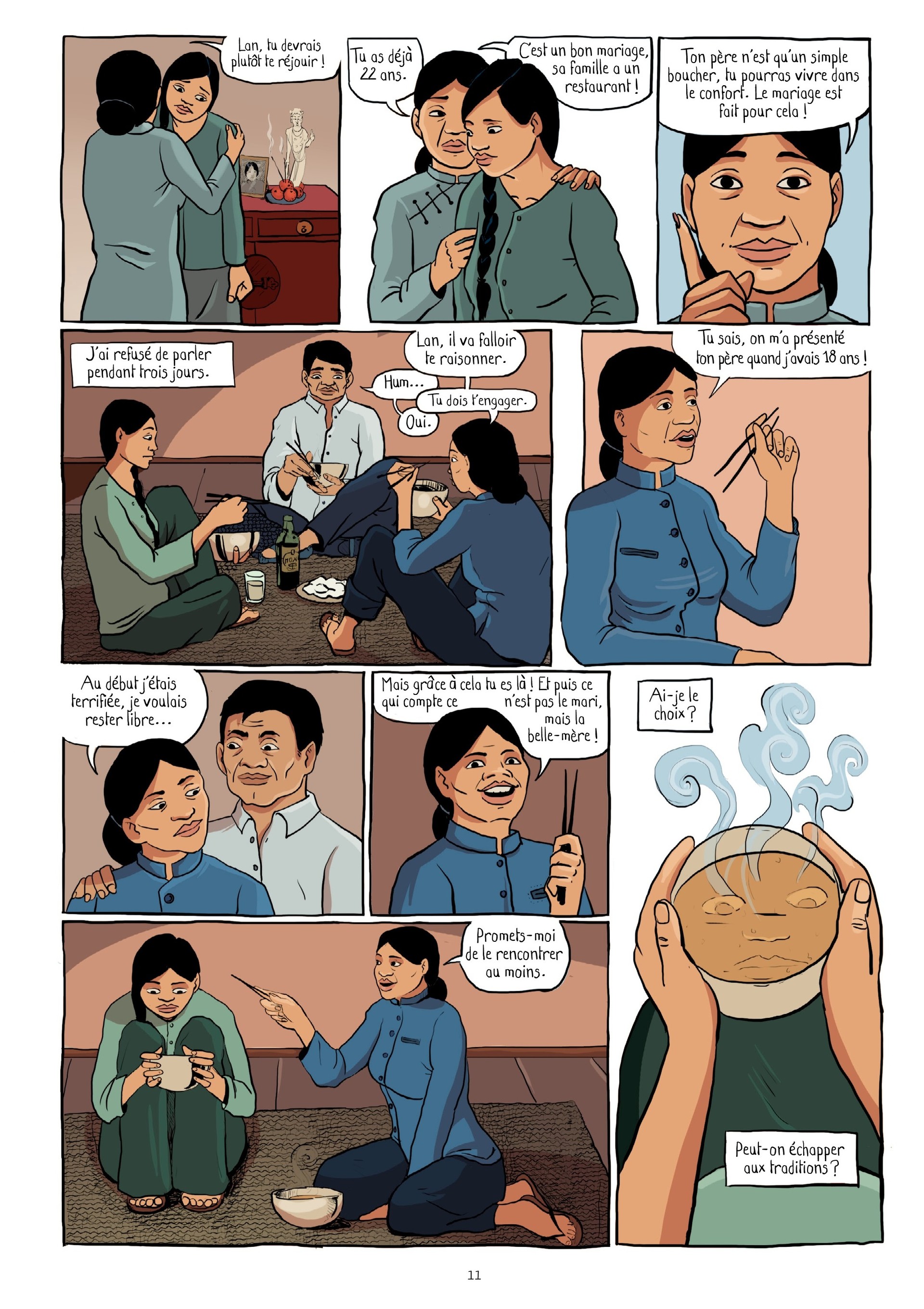 En cinq chapitres consacrés chacun à un personnage de l'histoire et au couple principal, on découvre comment Pad, une jeune fille vietnamienne, quitte sa montagne pour devenir l'épouse d'un jeune chinois. Le 1e chapitre concerne la vie de la belle-mère de Pad, Lan : jeune chinoise de l'ère de l'enfant unique (un garçon bien sûr!!). Le 2e chapitre présente la jeunesse de la mère de Pad, Huong, e...