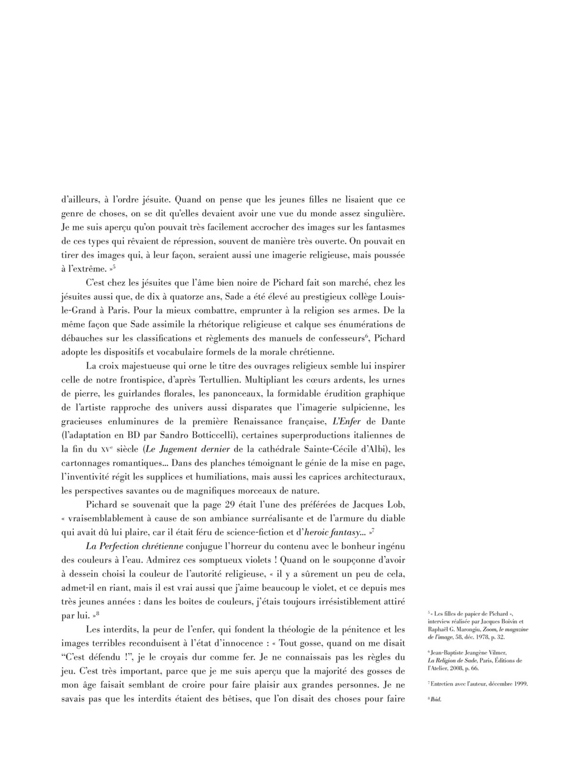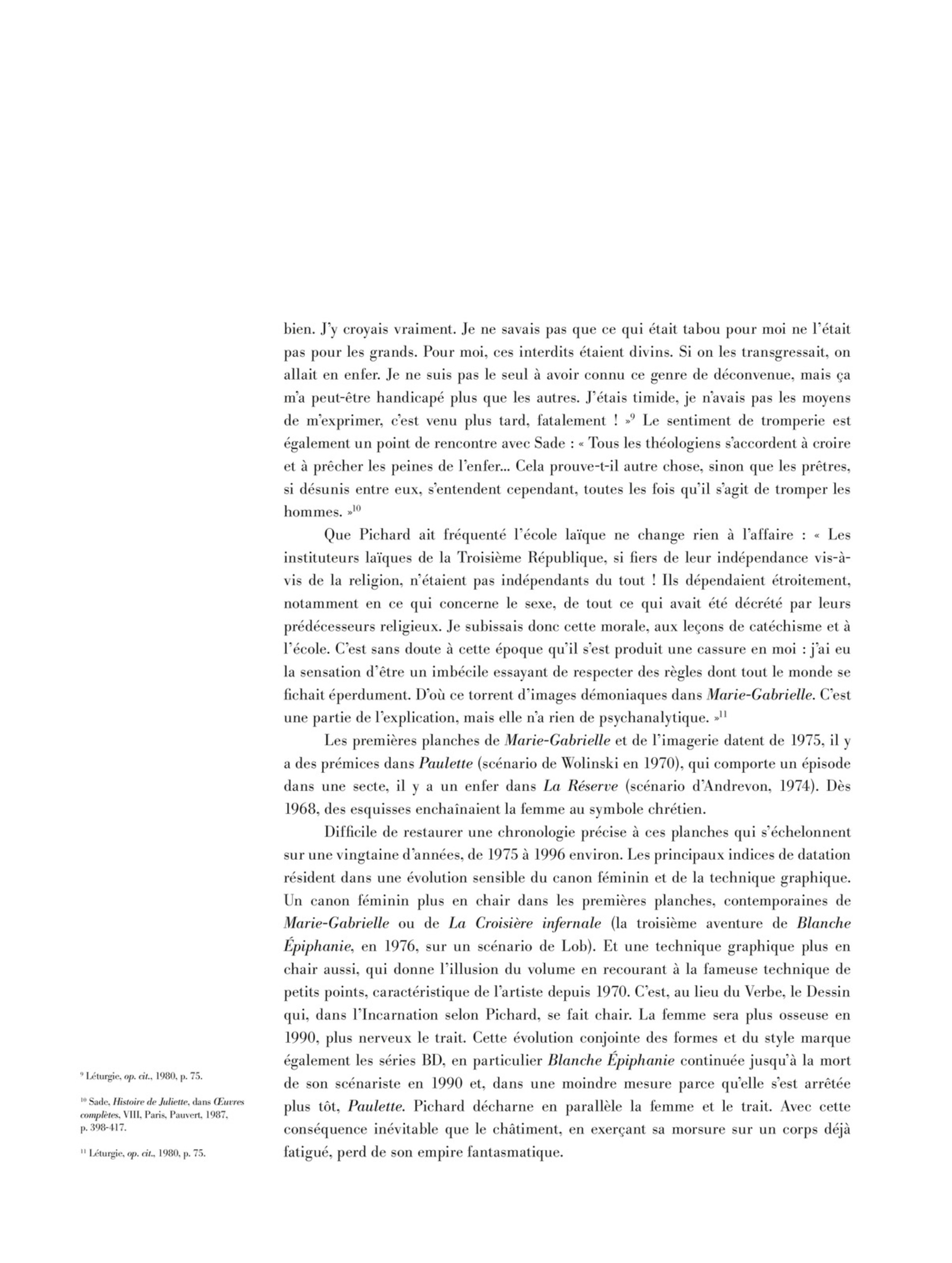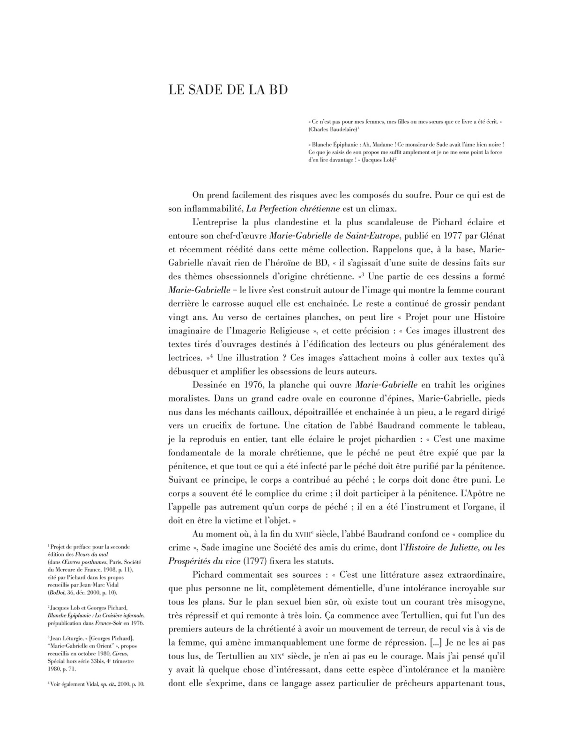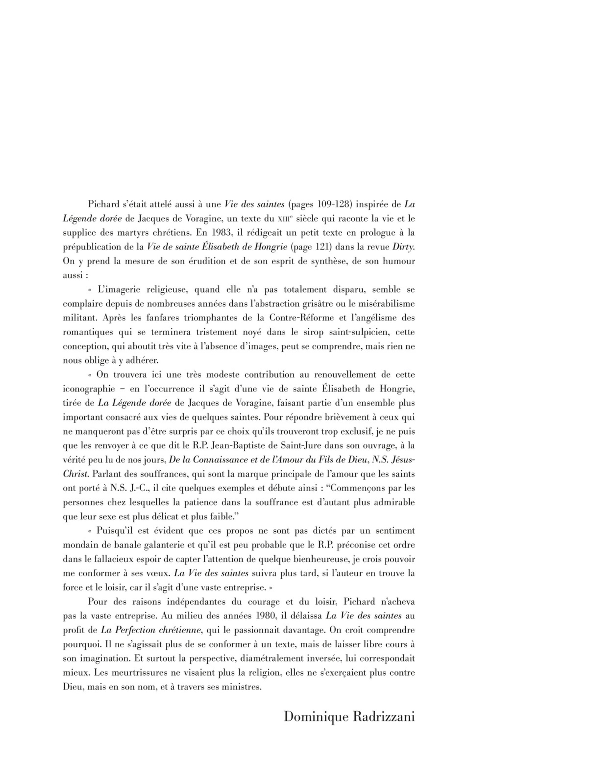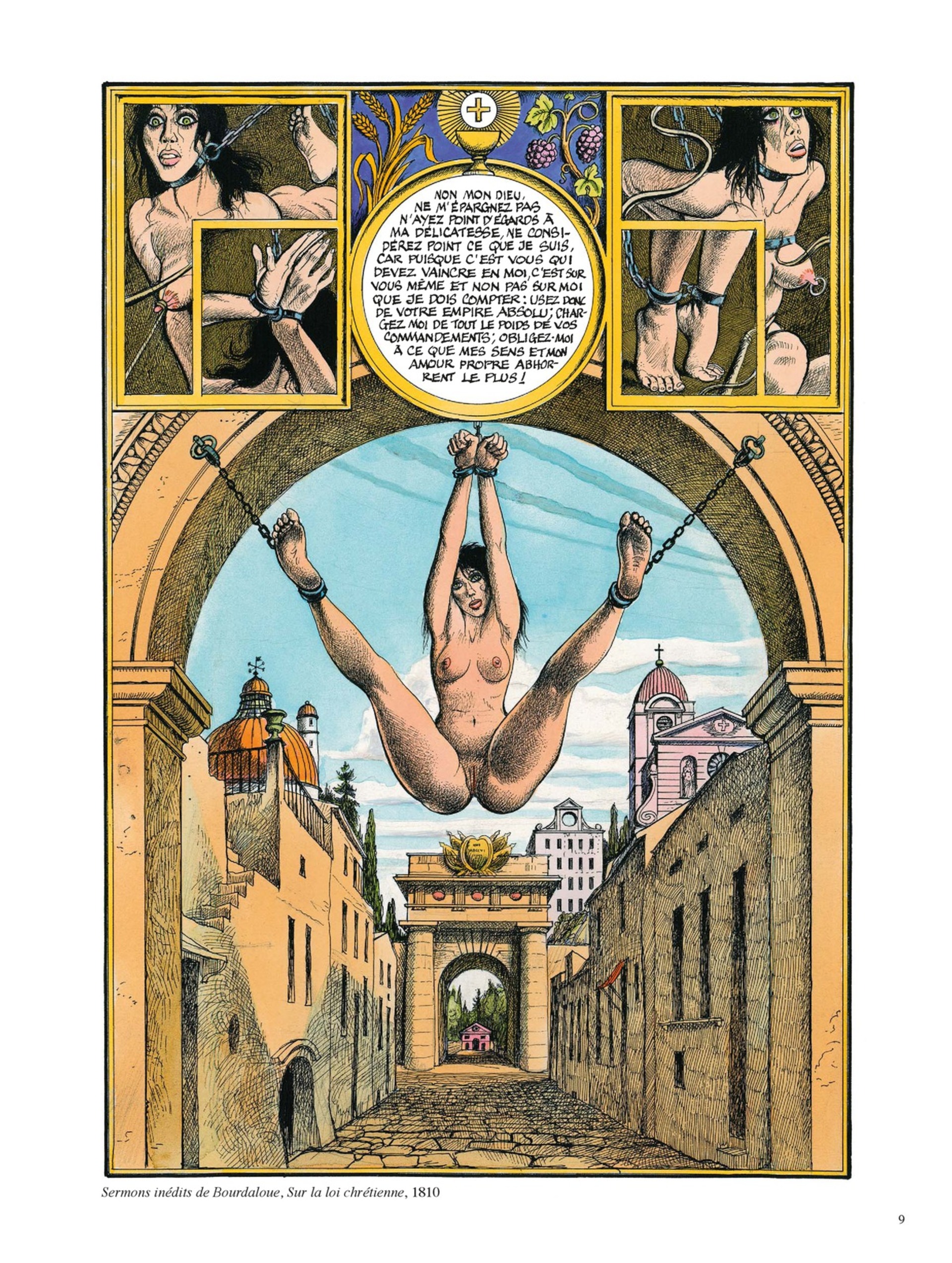 Georges Pichard, immense dessinateur, fut le professeur, entre autres, de Joann Sfar, de David B. et d’Annie Goetzinger, et un talentueux pornographe, disciple du divin Marquis de Sade. Les éditions Glénat sont très fières de pouvoir offrir à ses assidus lecteurs un livre complètement inédit de l’auteur de Marie-Gabrielle de Saint-Eutrope. Il est constitué de plus de 120 pages jamais montrées et secrètement préservées des regards jusqu'à aujourd'hui. Pichard y transgresse de nouveau l’imagerie religieuse, puisqu’il propose une sorte de bréviaire des Saintes de la chrétienté, en y accentuant les scènes de torture… L'écart entre douleur et plaisir se fait ténu, tout comme celui entre fascination et dégoût. Une œuvre marquante, dont certaines pages, uniquement crayonnées, donneront à voir les coulisses d’un grand auteur dont le travail graphique est aisément comparable à celui de Jacques Tardi ou de Robert Crumb.