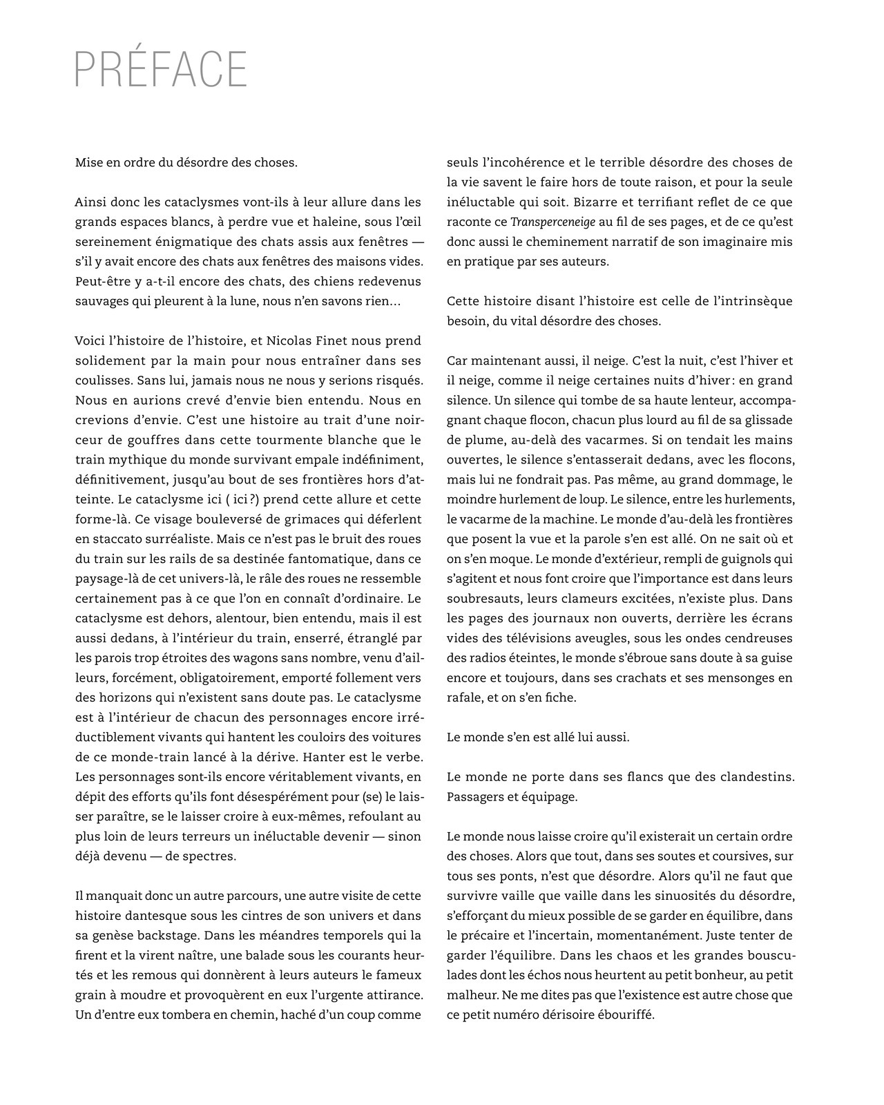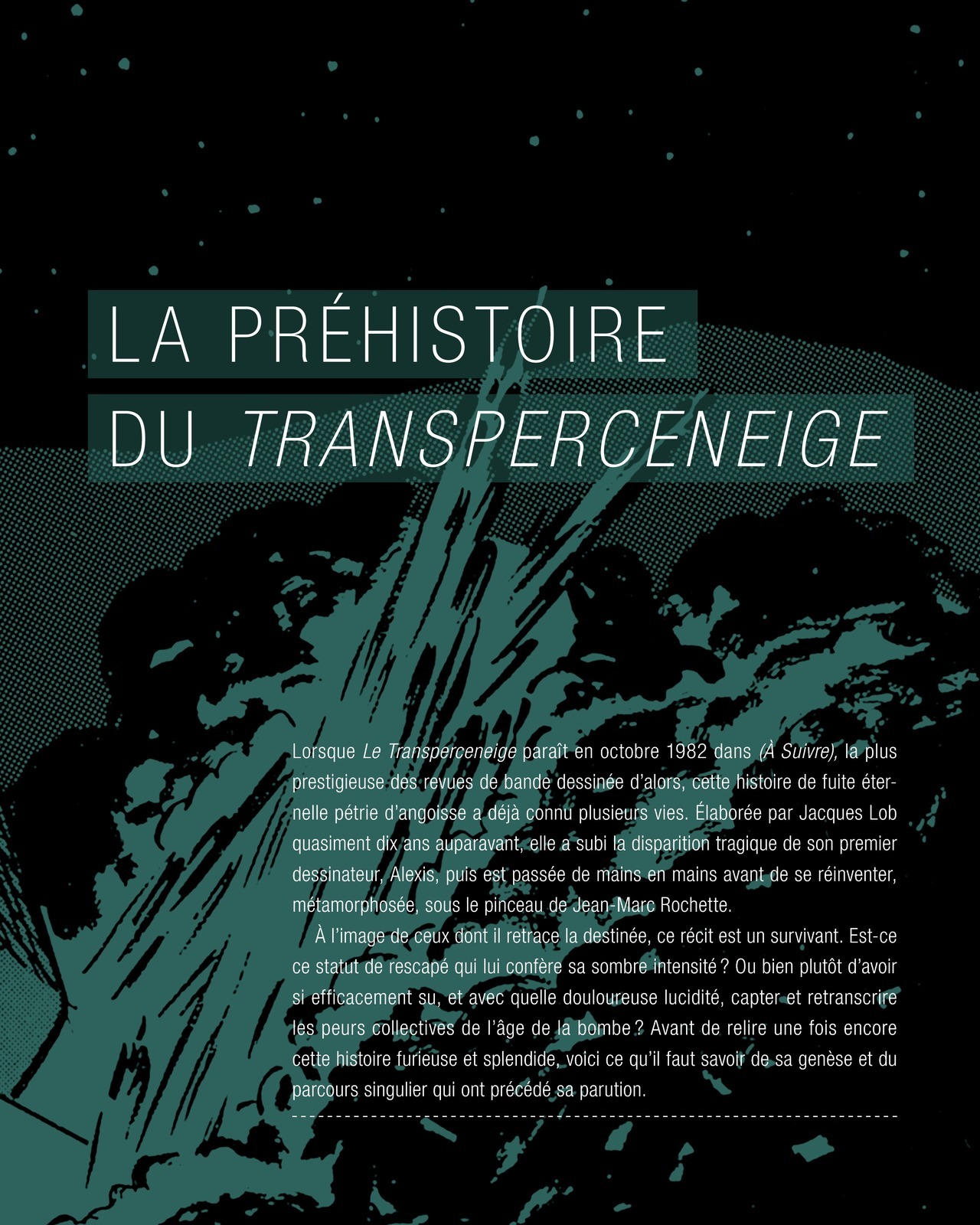 Le parcours éditorial et cinématographique du Transperceneige est exactement à l’image de ce que raconte son scénario : une histoire de rescapés. Conçu dès le milieu des années 70, ce grand récit typique des angoisses de la fin du millénaire précédent a survécu contre toute attente à la disparition soudaine de son premier dessinateur (Alexis) puis à celle de son premier scénariste Jacques Lob, avant de renaître trente ans après sa première publication sous la forme d’une ambitieuse adaptation cinéma dont l’aboutissement, lui aussi, tient littéralement du miracle. C’est cette très étonnante saga à rebondissements, pleine de détours, de surprises et de coups de théâtre que retrace Nicolas Finet dans ces Histoires du Transperceneige. Nourri d’entretiens, de recherches et d’anecdotes souvent inédites, un grand livre illustré pour explorer et comprendre toutes les facettes, les recoins et les incarnations d’une oeuvre peu commune, en écho à la sortie sur les écrans du film Snowpiercer de Bong Joon-ho, à la fin de l’été, et de la publication de la trilogie de Rochette, Lob et Legrand sous la forme d’une intégrale.