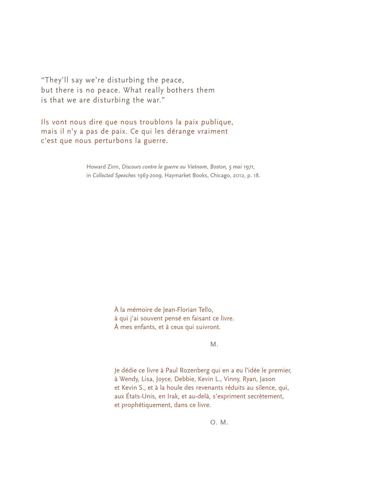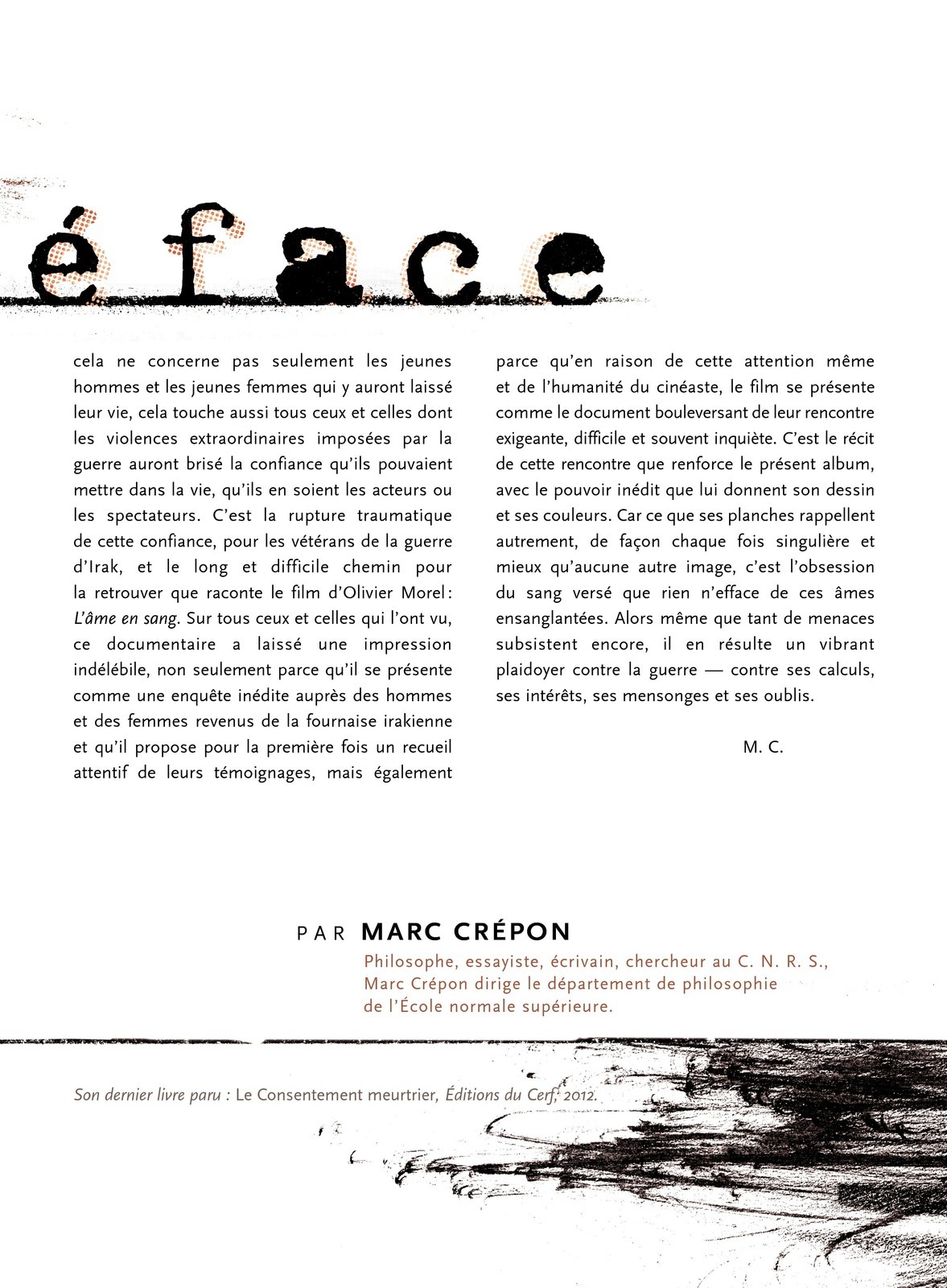 Olivier Morel a réalisé un film, L’Ame en sang, qui parle des vétérans de la guerre d’Irak atteints du trouble de stress post-traumatique. Ce film poignant, utile, diffusé sur Arte en 2011, et dans de nombreux festivals aux États-Unis et en Europe, rappelle que le nombre de suicides de vétérans est aujourd’hui supérieur à celui des soldats tués sur le sol irakien. Revenants n’est pas le livre du film.