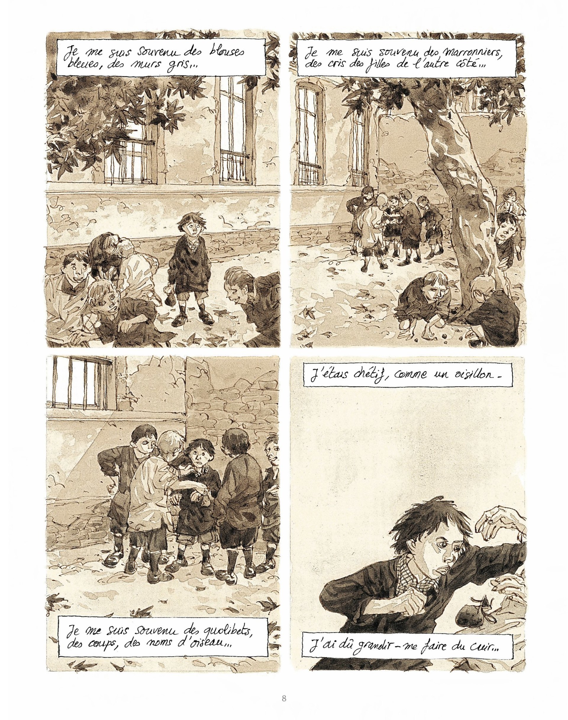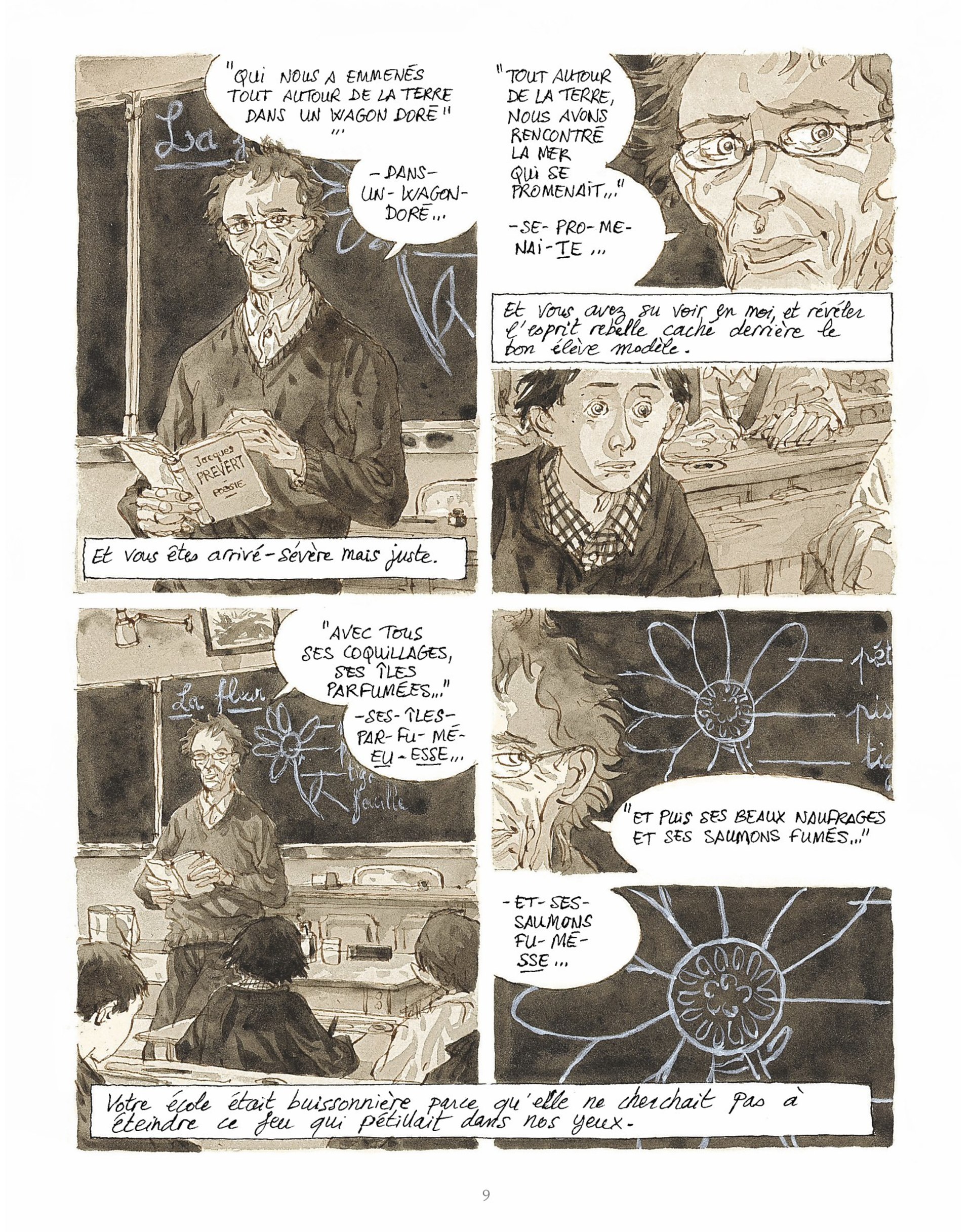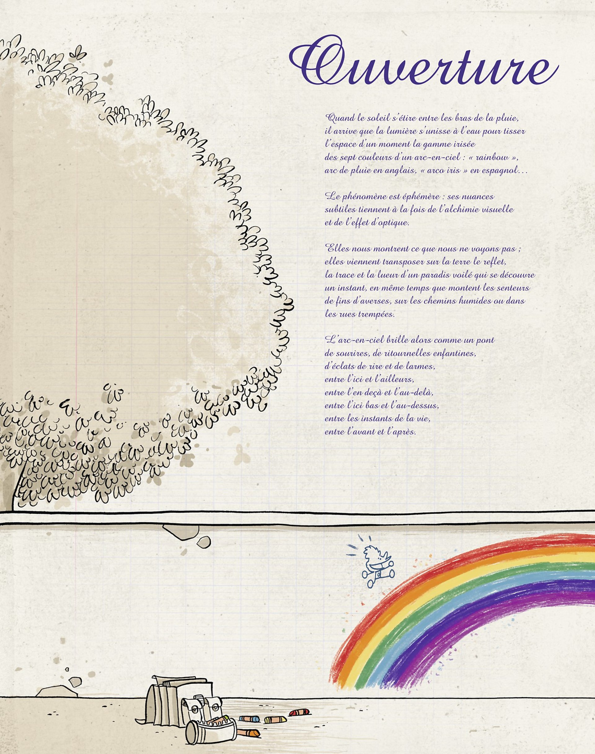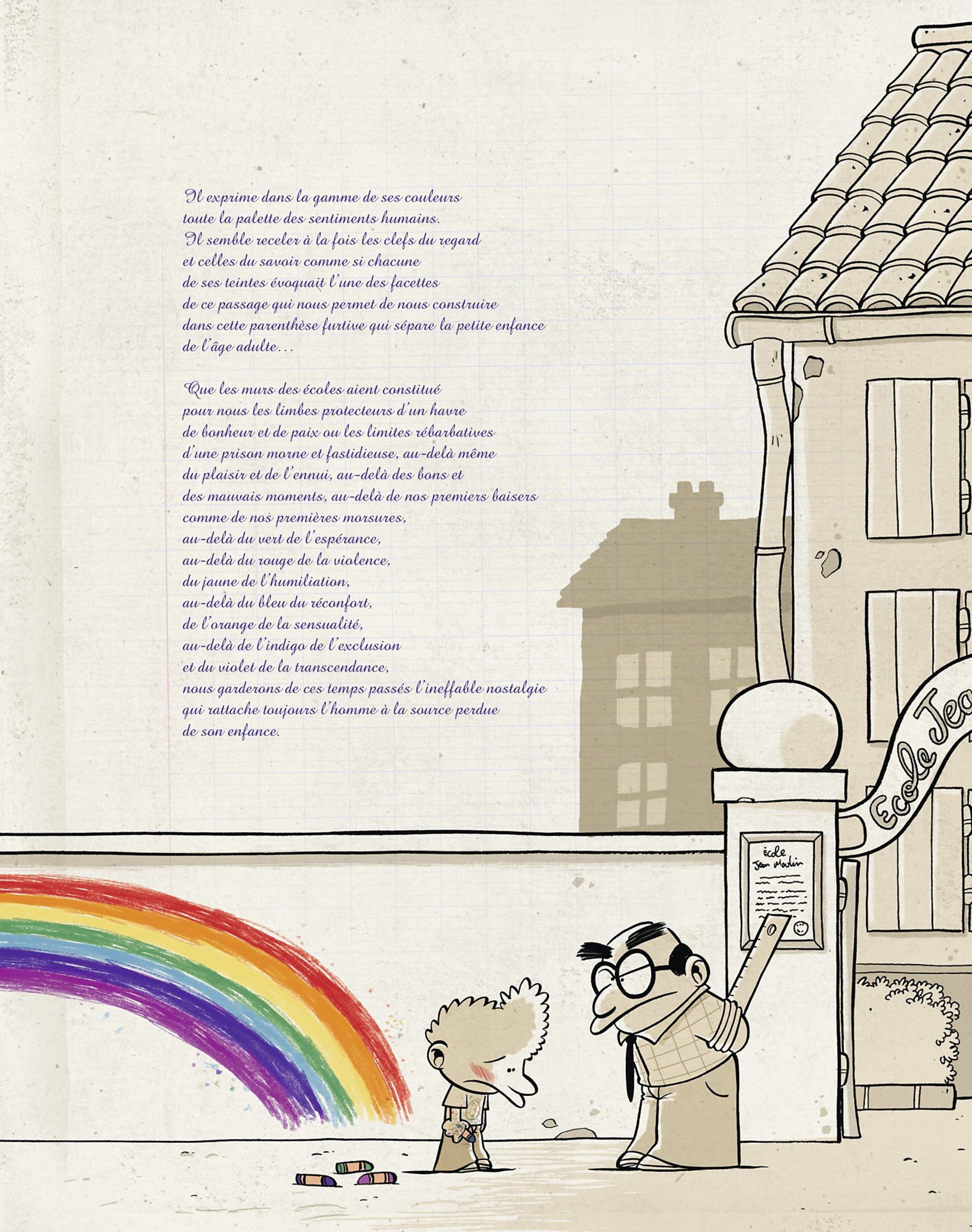 Que les murs des écoles aient constitué pour nous les limbes protectrices d’un havre de bonheur et de paix ou les limites rébarbatives d’une prison morne et fastidieuse, au-delà même du plaisir et de l’ennui, au-delà des bons et des mauvais moments, au delà de nos premiers baisers comme de nos premières morsures, au-delà du vert de l’espérance, au-delà du rouge de la violence, du jaune de l’humiliation, au-delà du bleu du réconfort, de l’orange de la sensualité, au-delà de l’indigo de l’exclusion et du violet de la transcendance, nous garderons de ces temps passés l’ineffable nostalgie qui rattache toujours l’homme à la source perdue de son enfance.