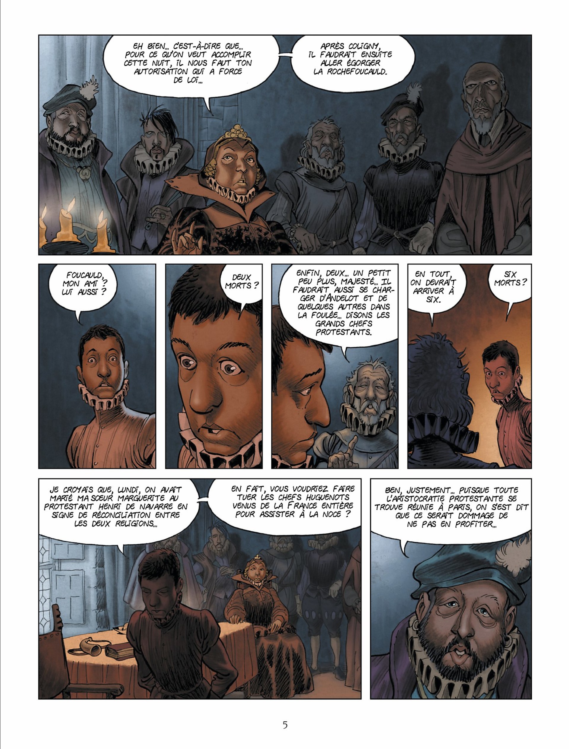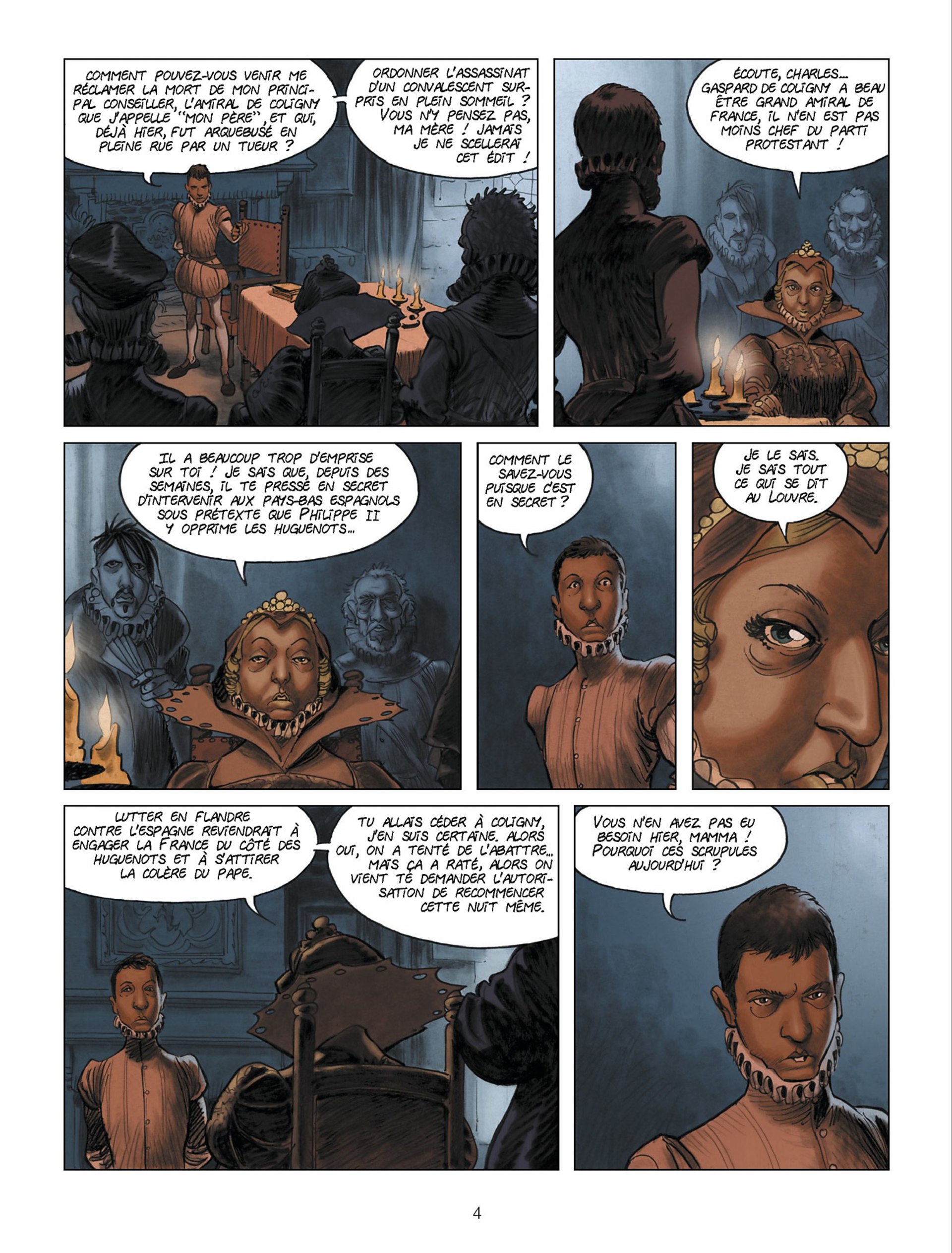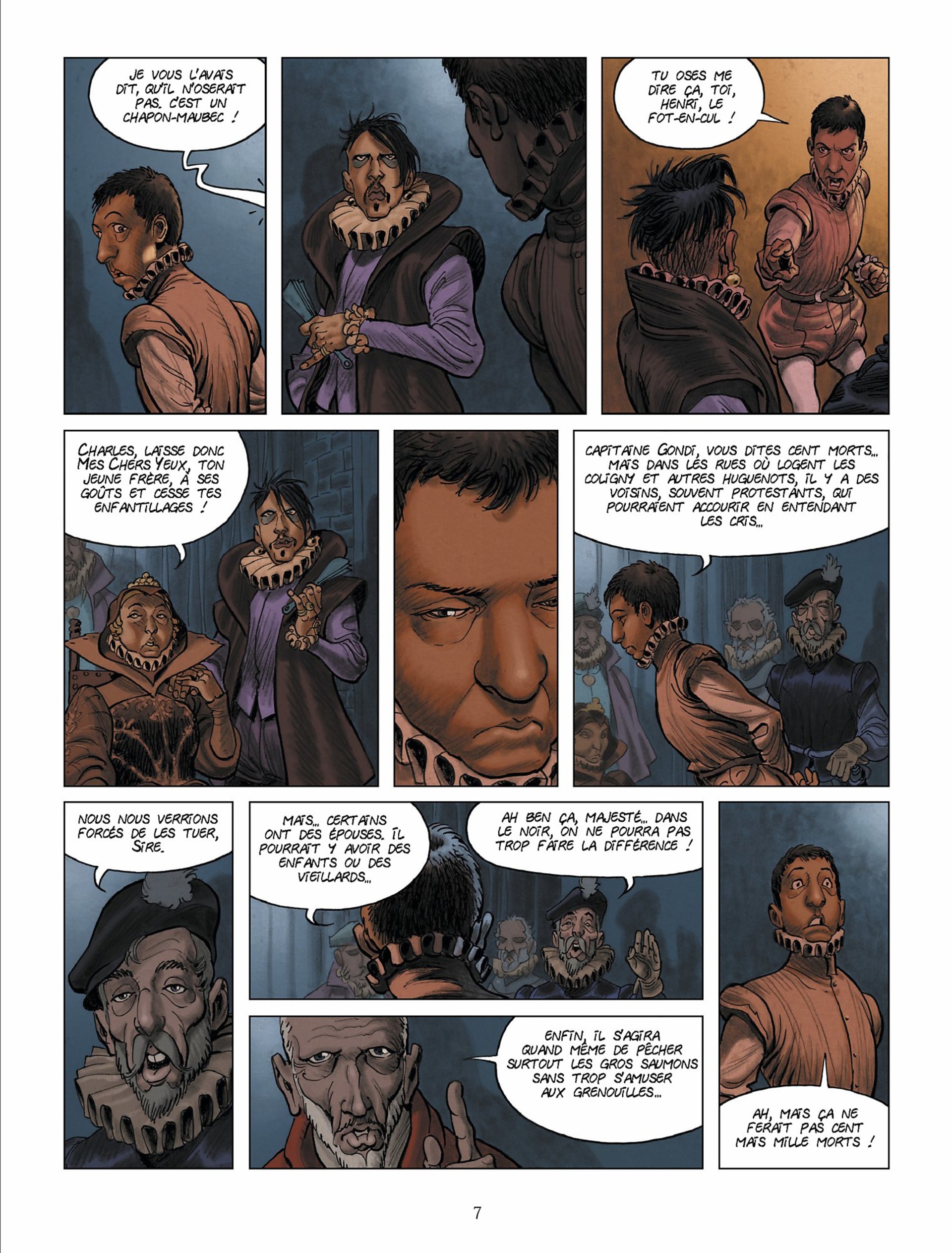 Cet ouvrage décrit la dérive vers la folie du roi Charles 9, à partir du moment où il accepte, forcé par sa mère, d’autoriser le massacre de la Saint Barthélémy. Outre le contenu historique et le caractère du roi, cette BD décrit avec forces couleurs rouges, le sang qui accompagne depuis le massacre la folie puis la maladie du roi. Les dessins sont superbes, s’accordant parfois quelques apartés...