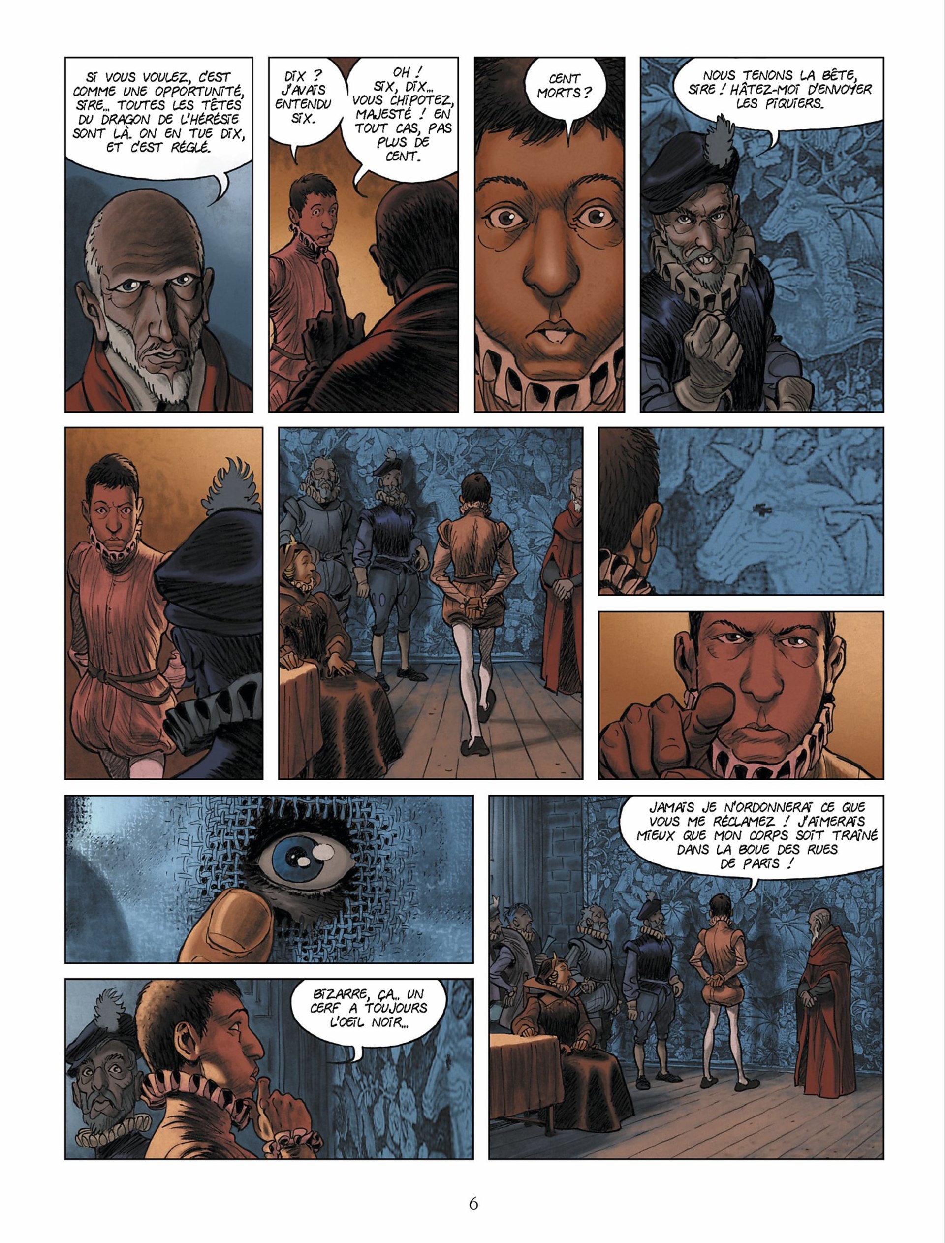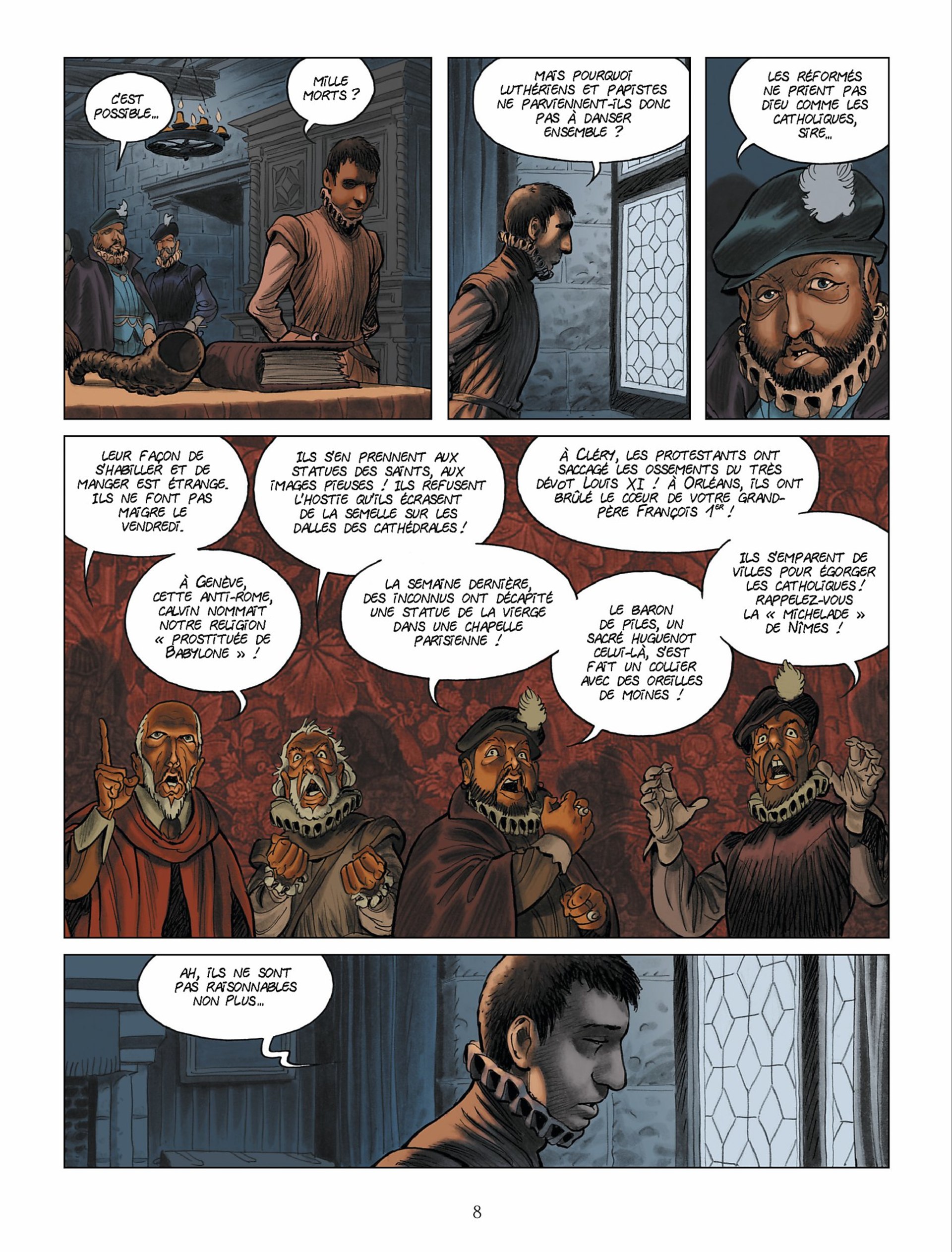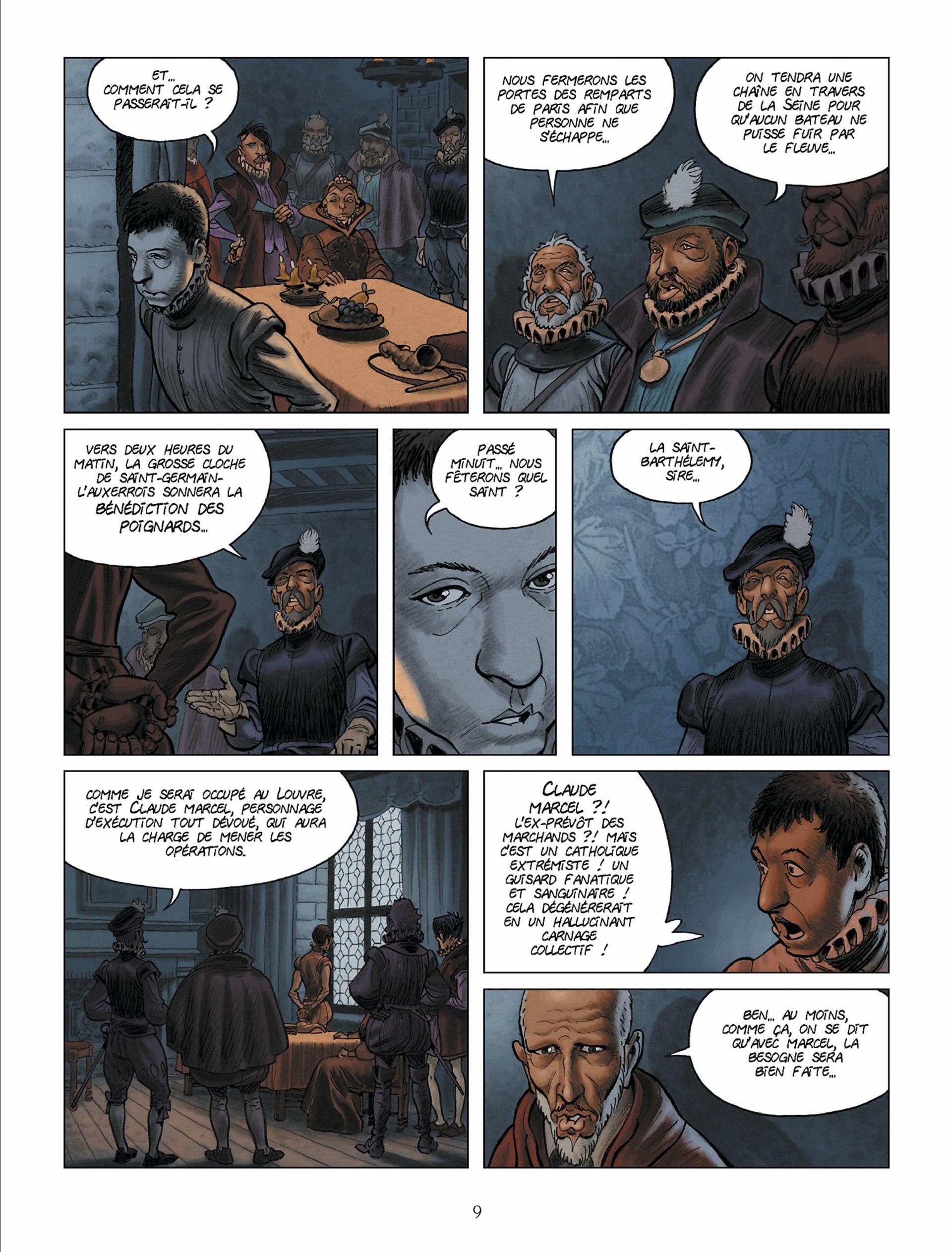 Cet ouvrage décrit la dérive vers la folie du roi Charles 9, à partir du moment où il accepte, forcé par sa mère, d’autoriser le massacre de la Saint Barthélémy. Outre le contenu historique et le caractère du roi, cette BD décrit avec forces couleurs rouges, le sang qui accompagne depuis le massacre la folie puis la maladie du roi. Les dessins sont superbes, s’accordant parfois quelques apartés...